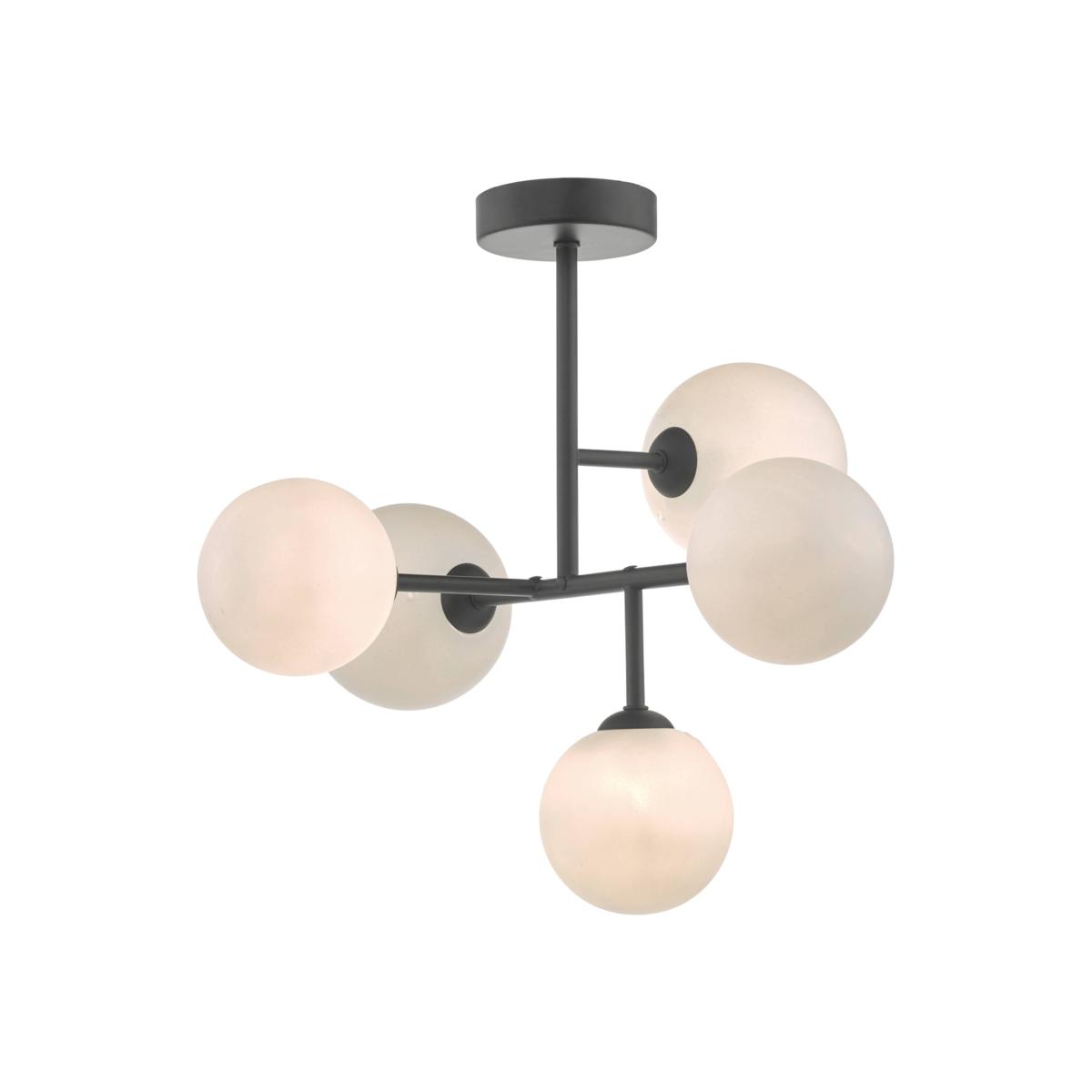 Industrial semi flush ceiling light boasting a matt black finish. An elegant addition to your home, this ceiling light is part of the Euan range from Dar Lighting. The fitting boasts matt black arms, each supporting a round opal glass shade. Perfect for use in hallways, living rooms, dining rooms and bedrooms.