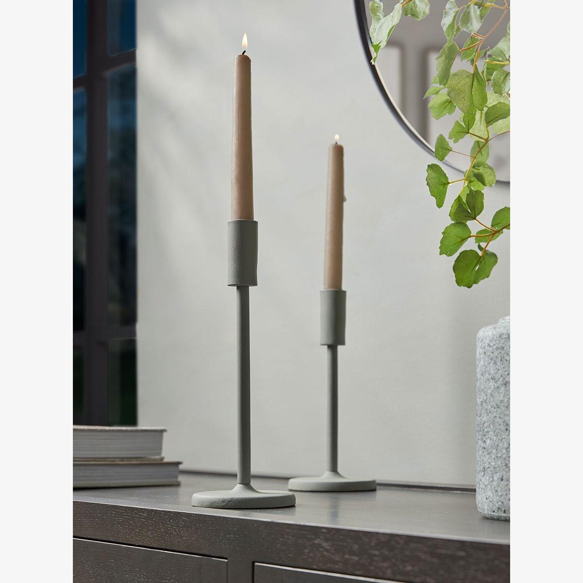 A minimalist and simple silhouette paired with a muted olive tone creates a refined and modern candle holder that adds contemporary flare to any space. Pair with our smaller candle holder and place on your dining table, or on your mantel, for a layered look that adds a warming and golden glow to your home for a calming and relaxing atmosphere.