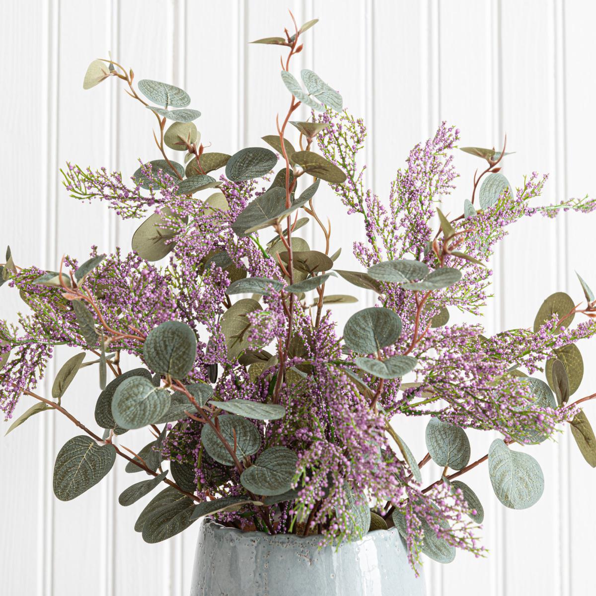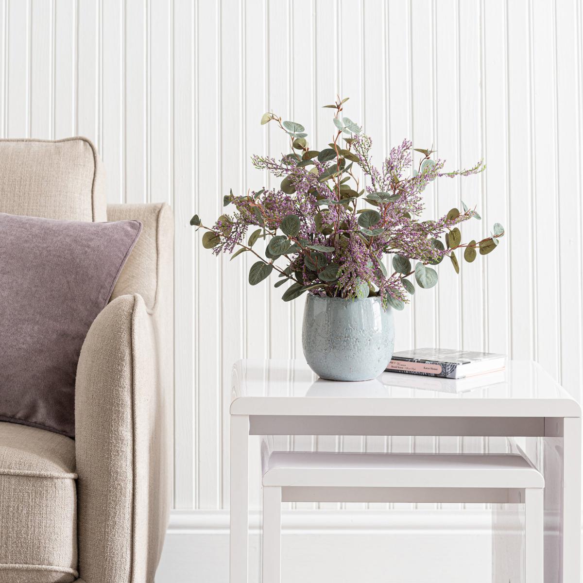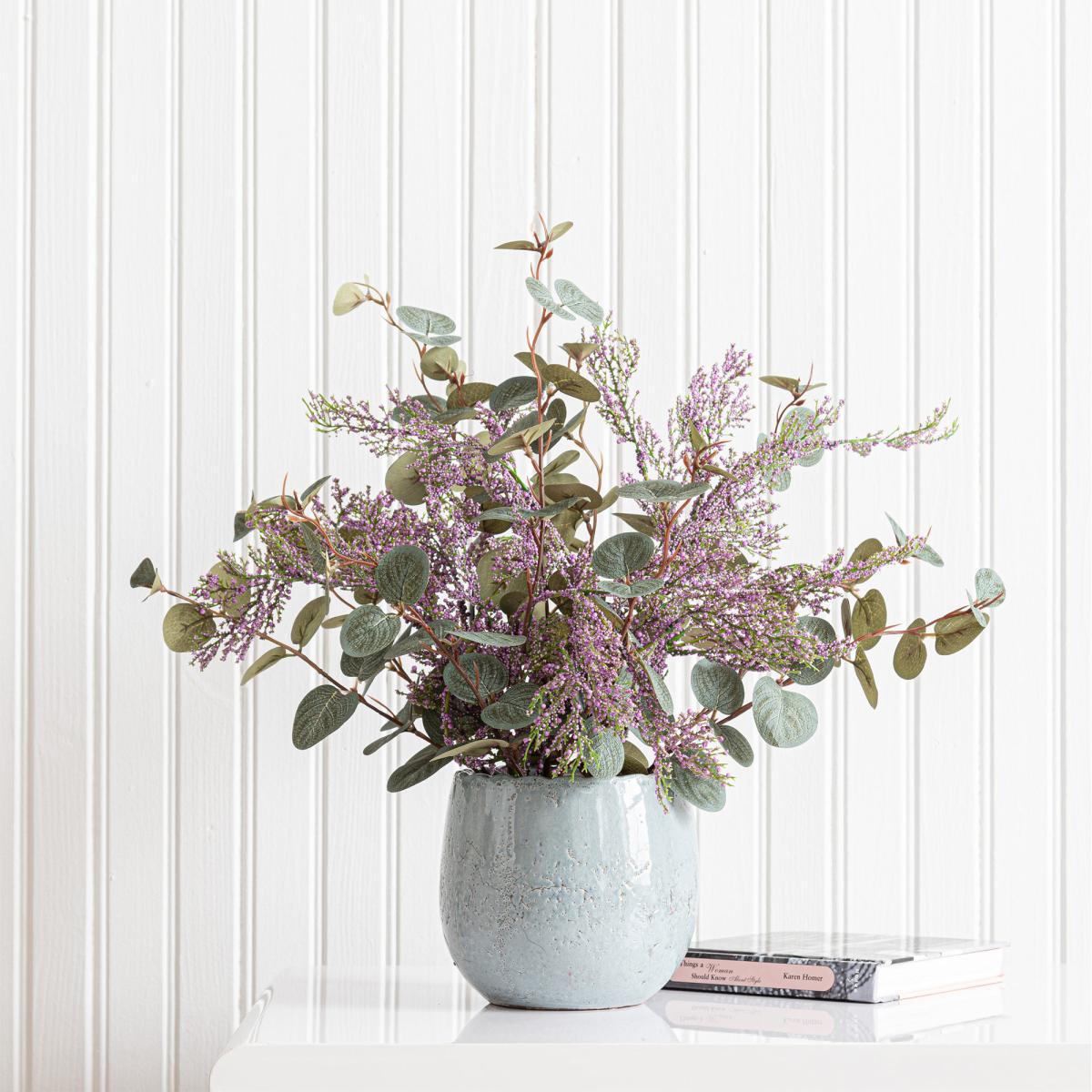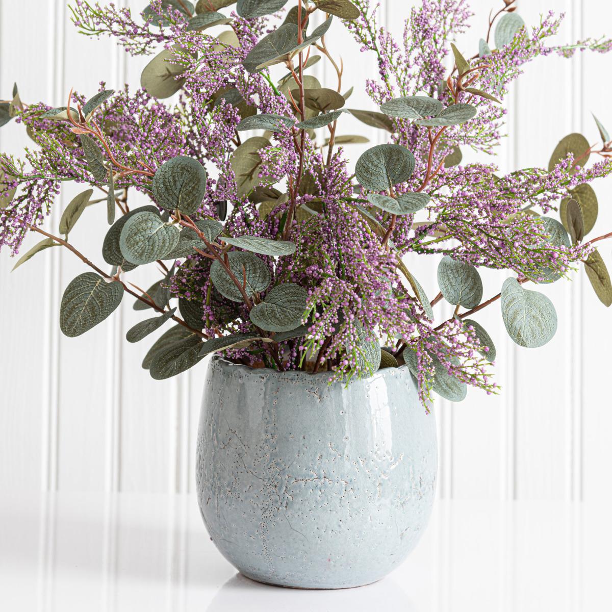 Delicately designed with mini berries and eucalyptus arrangement, this stunning piece sits in a blue ceramic vase with a crackle effect glaze. The vibrant purple berries will add a pop of colour to any room of the house, or to a display on shelves, sideboards and tables. The stylish piece has a realistic finish and requires low maintenance, making this ideal for your home.