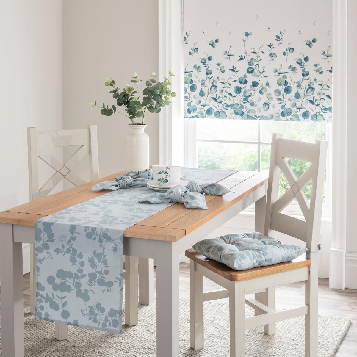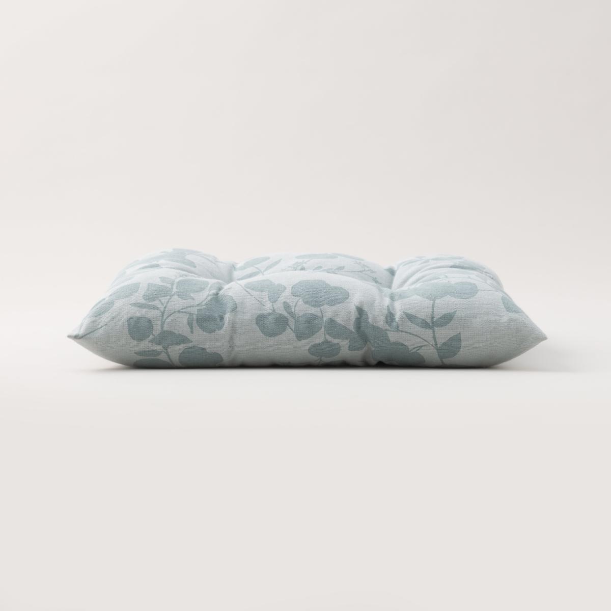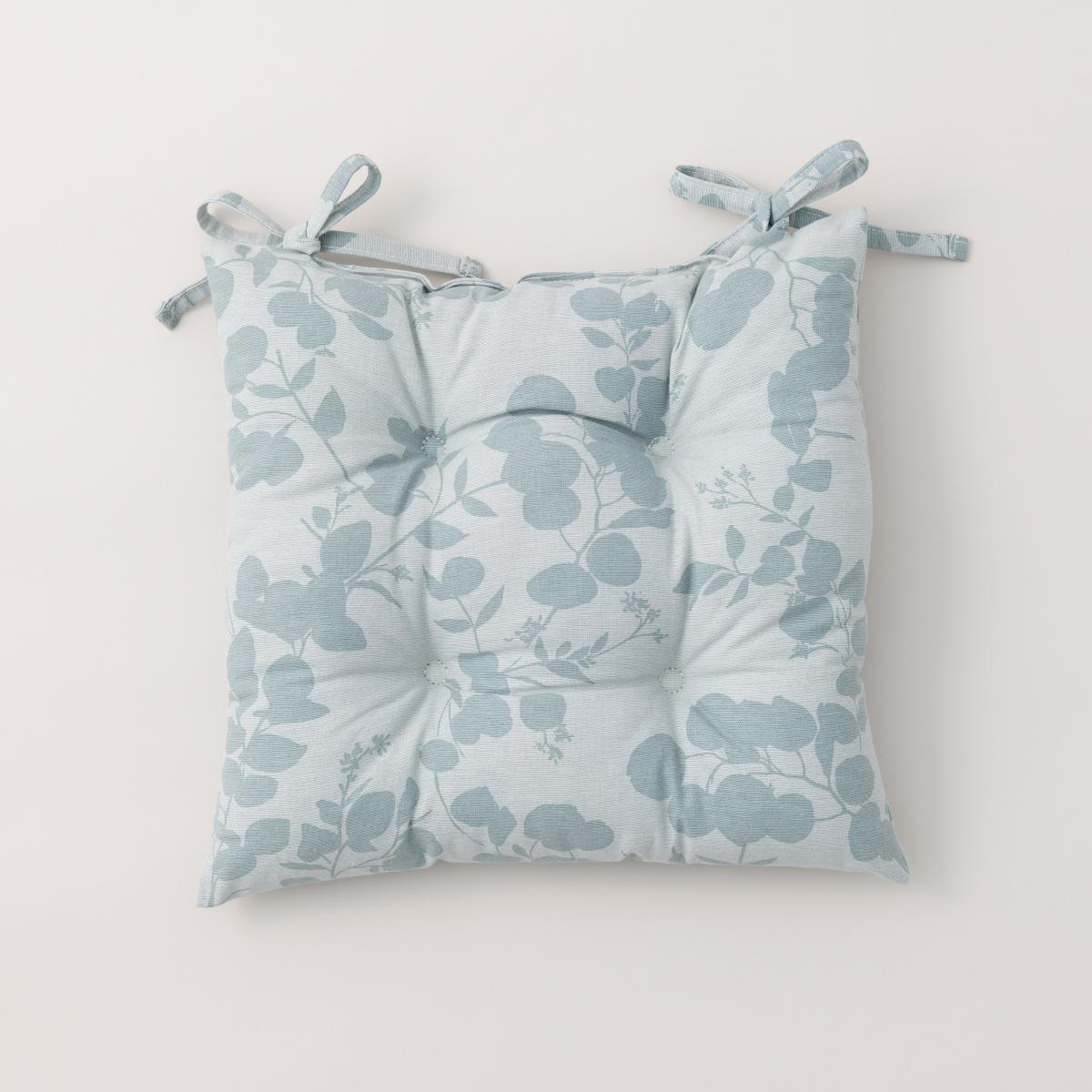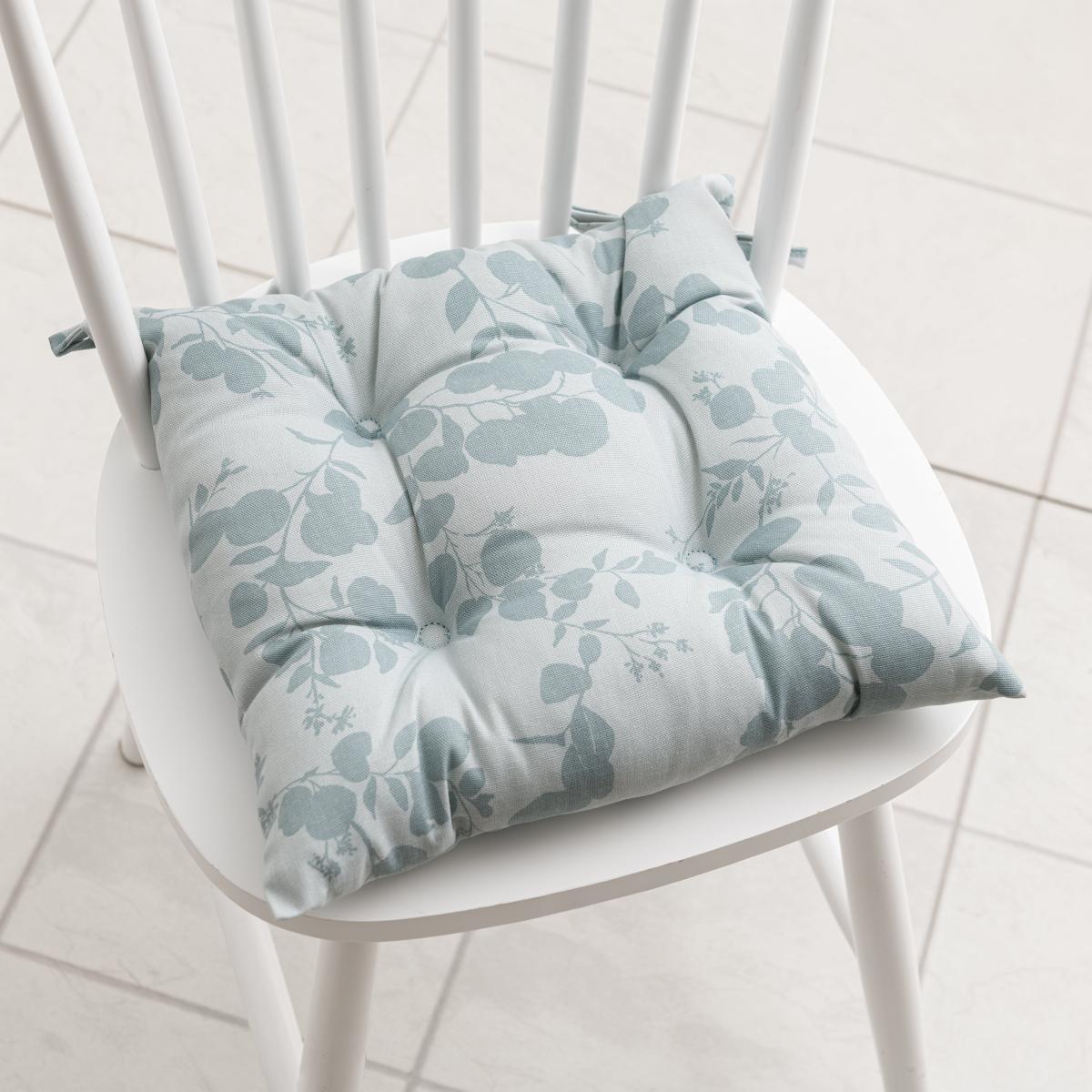 This seat pad features a stylish pattern of eucalyptus leaves in an elegant seafoam tone complimenting any kitchen and dining room beautifully. Made from 100% Cotton and filled with recycled polyester fibre for comfort, the seat pad has two practical ties to fasten to your chair. Coordinate with other matching items to complete the look.