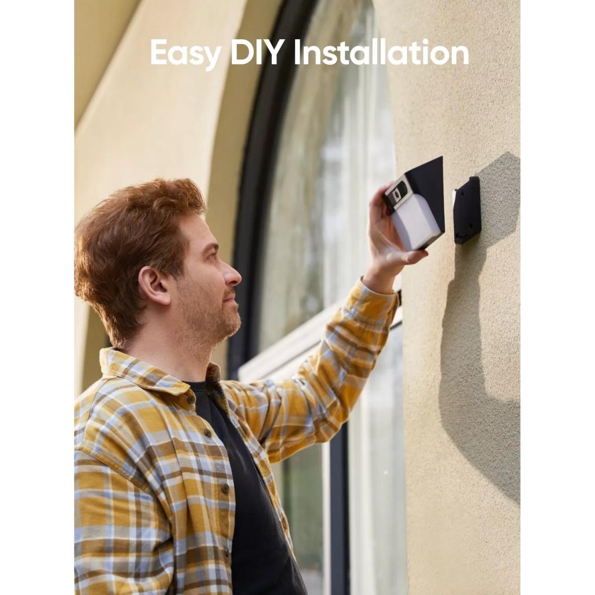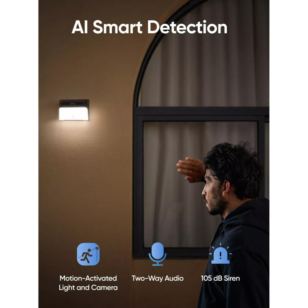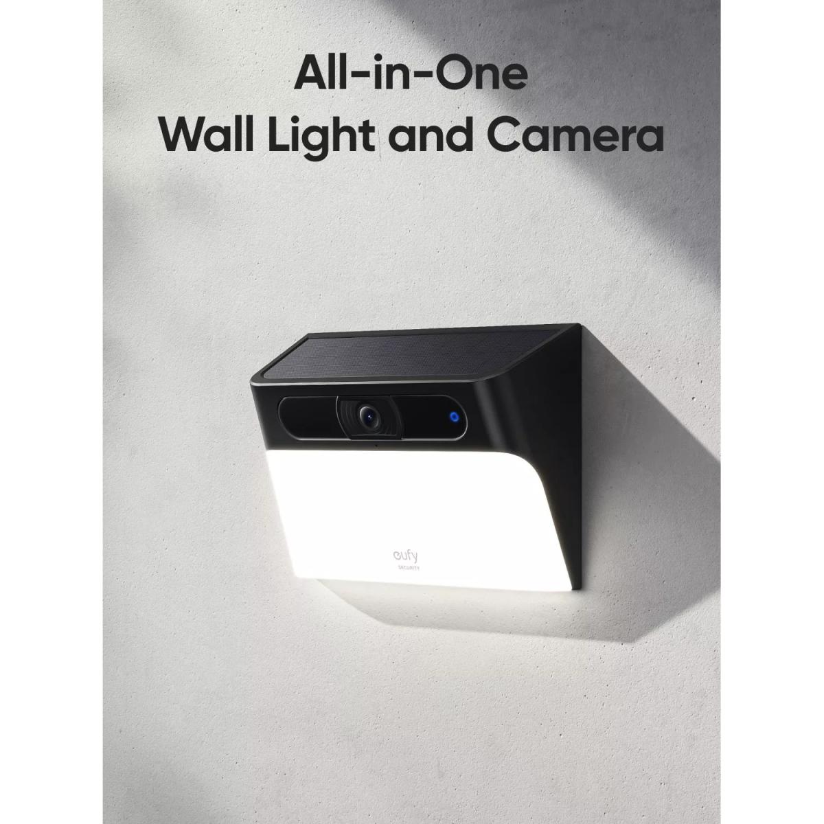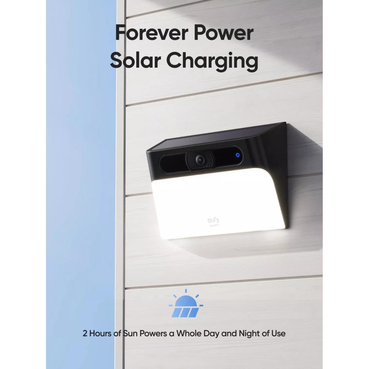 A seamlessly integrated camera and light, you can monitor your home anytime and illuminate your spaces with the S120 Solar Wall Light Cam from eufy. The 300 lumen light is comfortably bright, but won't disturb you or your neighbours at night, and turns on automatically with motion activation. 100% wireless forever power solar charging* The built-in battery provides up to 60 days of battery life in energy-saving mode. Two hours of solar charging gives over a day of power, so you don't have to worry about running out of power. And it can be installed with three steps in about five minutes. See 2. K HD...day and night View the live stream and recorded footage in full 2. K HD colour night vision, so you'll never miss a detail. Colour Night Vision ensures recordings are vivid and sharp, even when the lights are off. AI smart detection The solar security camera can detect motion from 25 ft away with its PIR sensor, and sends a real-time notification to you**. You can also use the eufy Security app to respond to events with 2-way audio, sound the 105d B siren, and activate bright lights to scare away intruders, from wherever you are. No monthly fee eufy Solar Wall Light Cam S120 is a one-time purchase with no monthly fee or hidden costs. And the built-in eMM C memory stores event footage locally for up to 60 days. * With optimal sunlight, the built-in solar panel can collect and store 600 to 800 m. Ah per day ** Push notifications with thumbnail previews require thumbnail preview images to be temporarily stored in the cloud