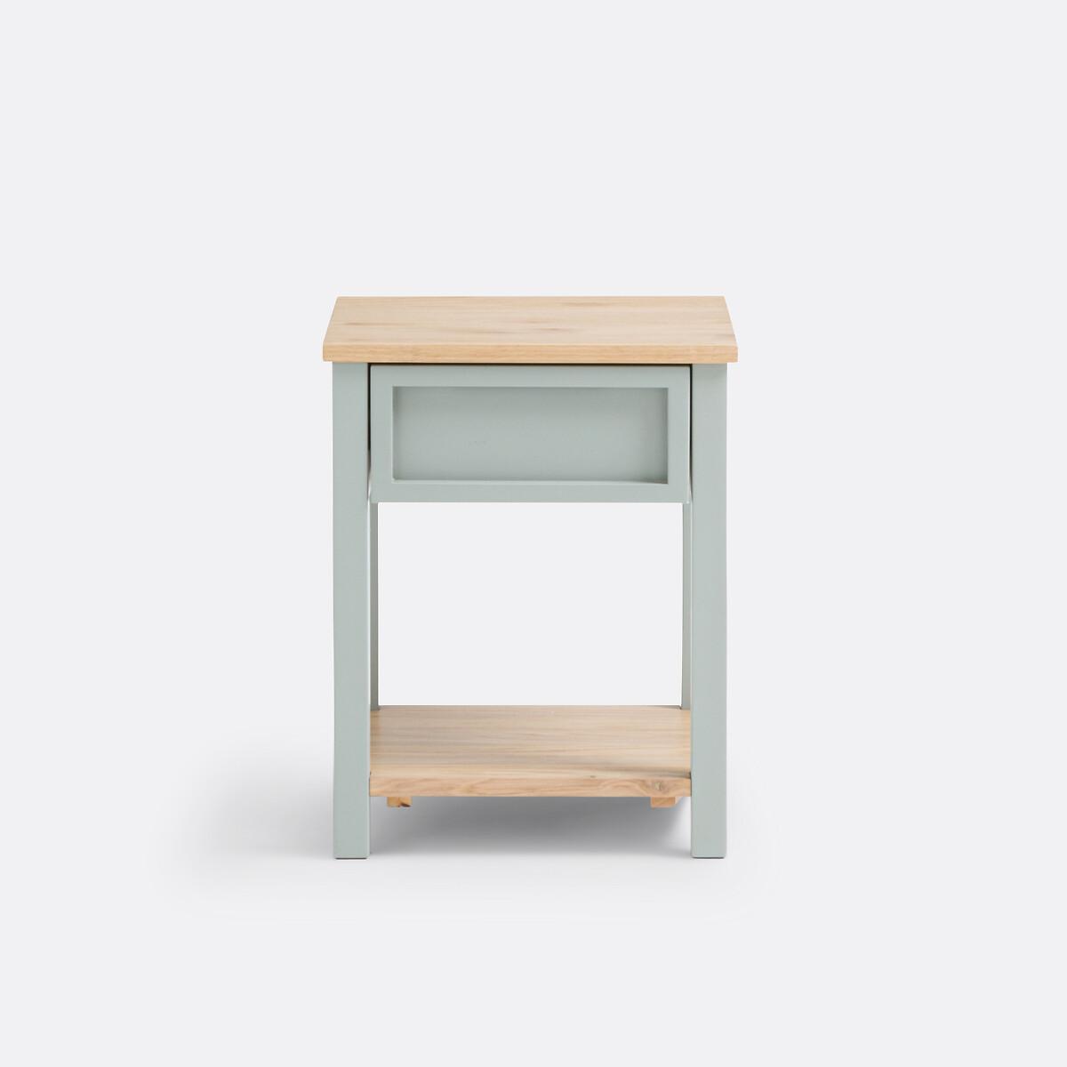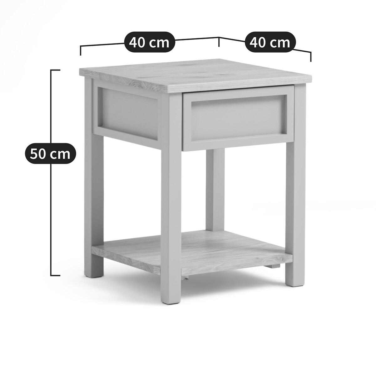 Offered in a soft colour in solid pine, lacquered MDF and solid oak, the Eugène bedside table has a pleasing family home spirit. Designed by La Redoute Interiors. Product Details • 1 drawer and 1 shelf • In solid pine and MDF FSC® lacquered with acrylic finish • Top and shelf in solid FSC® oak, natural colour, acrylic finishDimensions. Overall • Width: 40cm • Height: 50cm • Depth: 40cm • Weight: 9.5kg. Usable space Drawer • Width: 27.6cm • Height: 11.5cm • Depth: 30cmDelivery:. Sold pre-assembled. • WOOD FROM SUSTAINABLY MANAGED FORESTS. FSC® certified wood comes from forests that are environmentally, socially and economically well managed. Dimensions and weight of parcel1 parcel • L59 x H19 x D47cm. 11.6kg