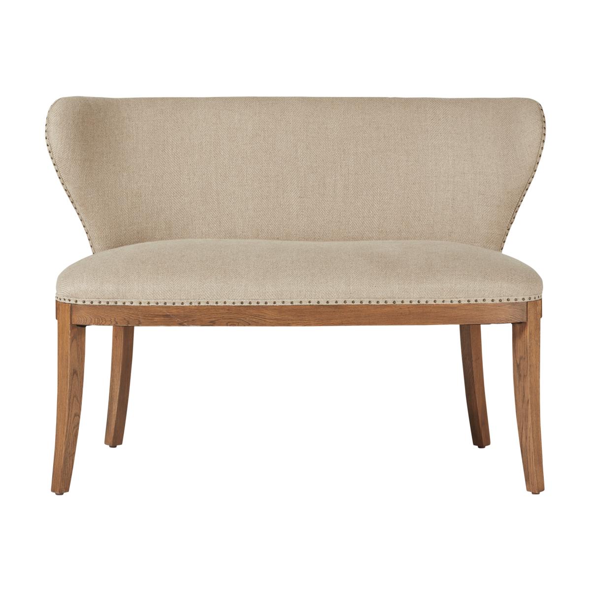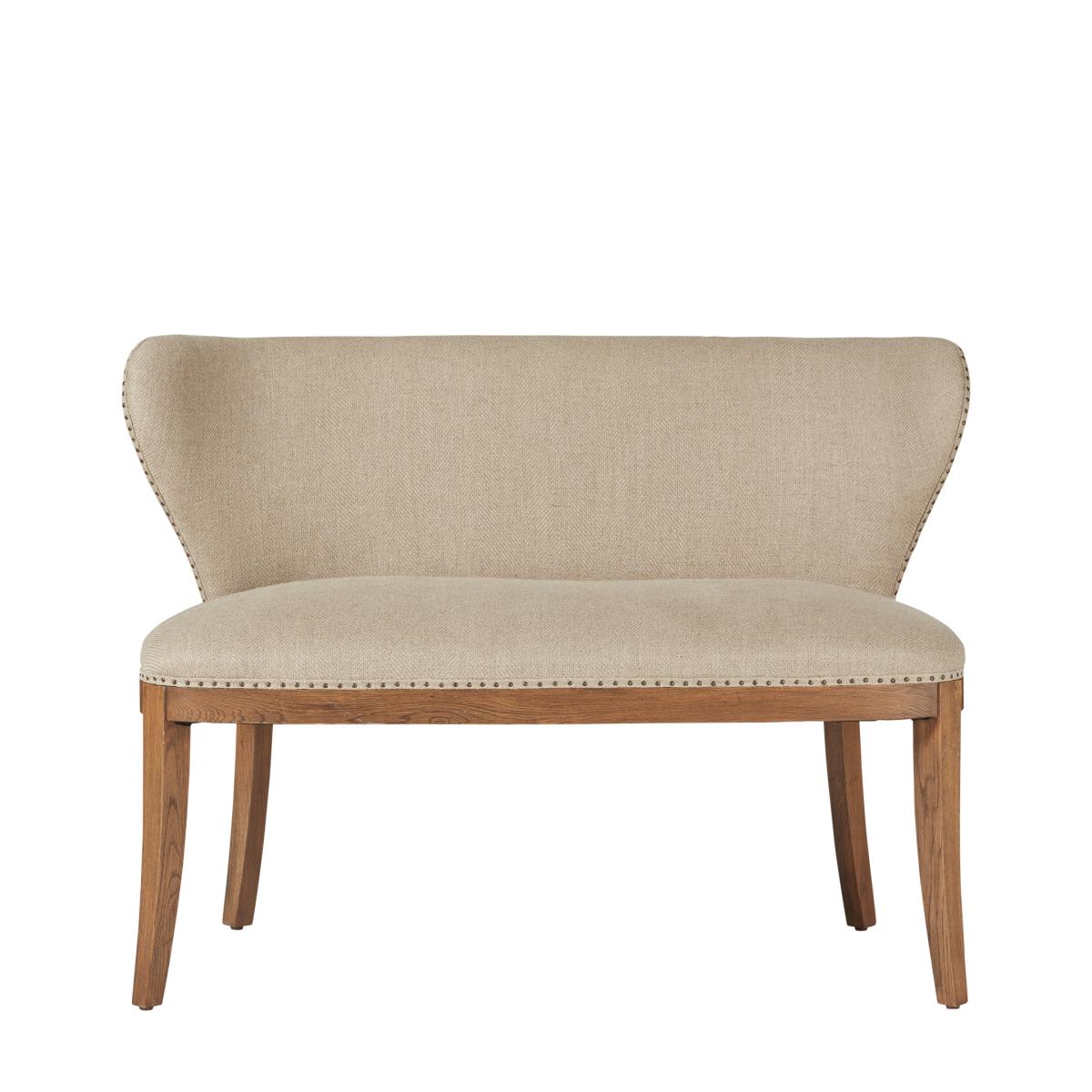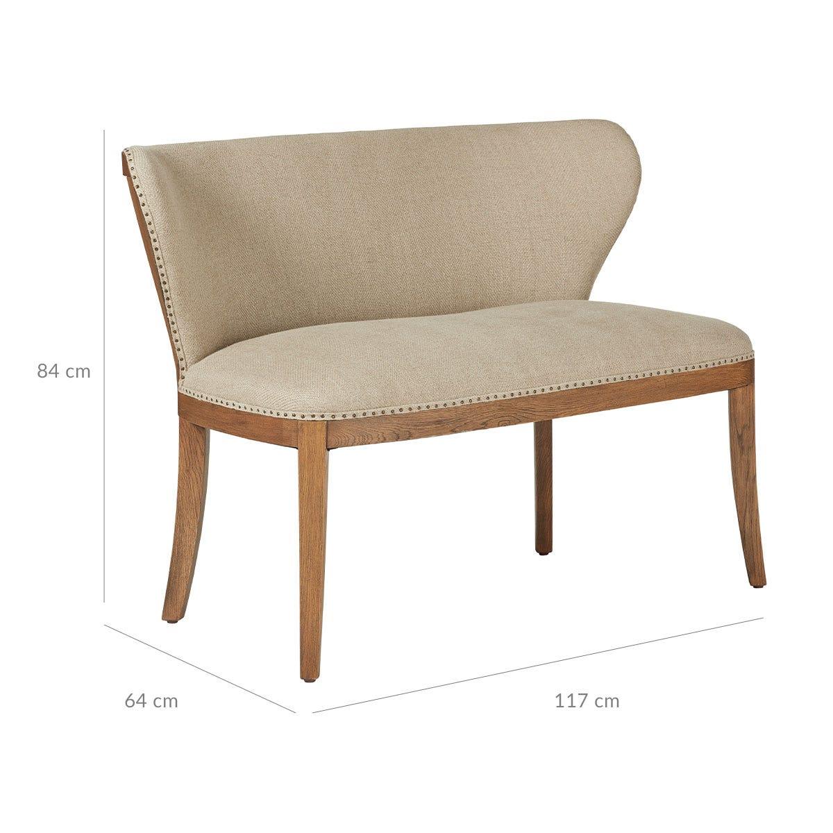 The sleek Eugenia is upholstered in beige herringbone linen with a border of antique brass-coloured studs and gracefully curved stained oak legs. Subtle wings on either side of the back bring a hint of classic English style to an otherwise contemporary piece. The Eugenia is the perfect occasional bench for your hallway, sitting room, study or bedroom.