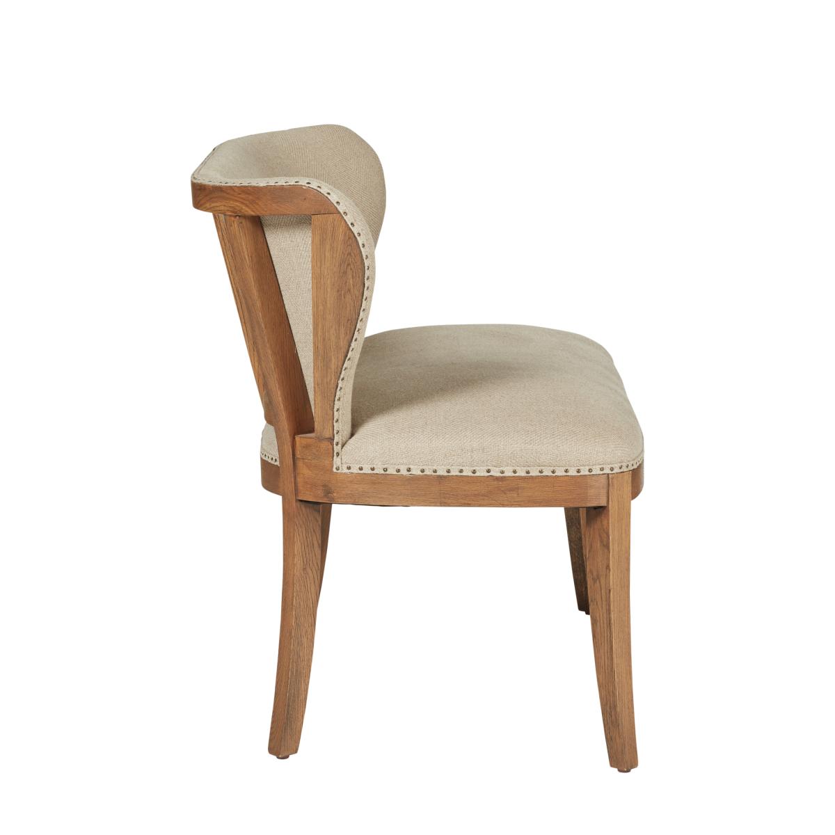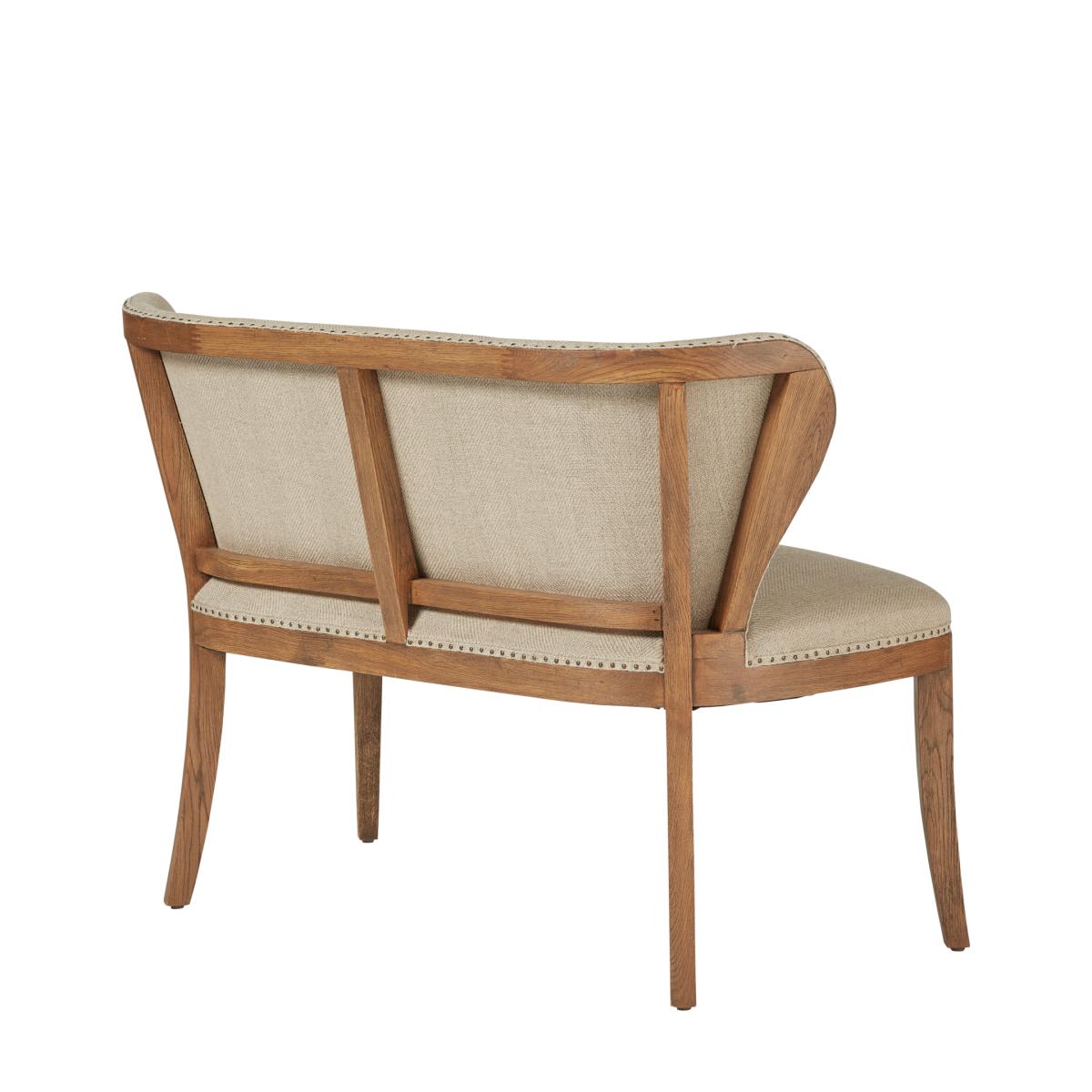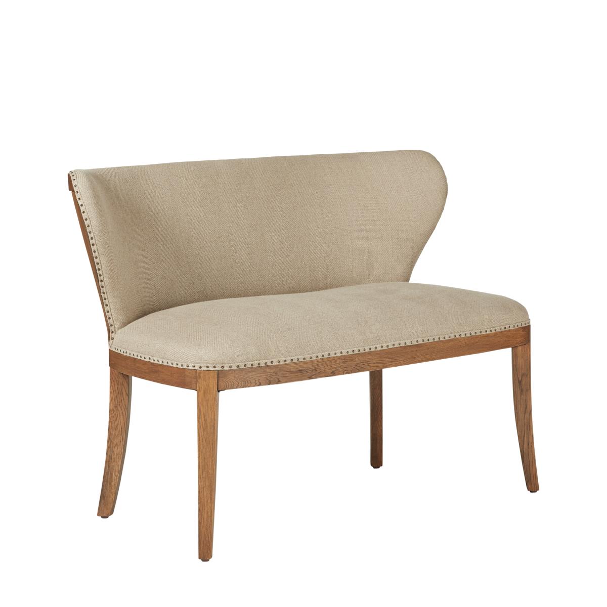 The sleek Eugenia is upholstered in beige herringbone linen with a border of antique brass-coloured studs and gracefully curved stained oak legs. Subtle wings on either side of the back bring a hint of classic English style to an otherwise contemporary piece. The Eugenia is the perfect occasional bench for your hallway, sitting room, study or bedroom.