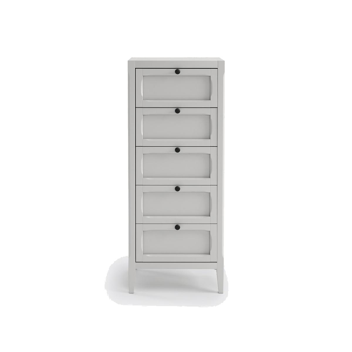 The Eugenie 5-drawer tallboy. This range of storage furniture has a family home feel, combining simple lines with original accents, available in a light grey or oak effect. Product Details • MDF with a matt nitrocellulose lacquered finish for the grey colour • MDF with an oak nitrocellulose lacquered finish for the oak colour • 5 drawers • Black metal knob. See other items from the Eugenie collection online. Dimensions. Total: • Width: 55cm • Height: 135cm • Depth: 44cm. Usable dimensions: • Drawer interior:W42.1 x H13.9 x D33.3cm. Home Delivery. Your Eugenie 5-drawer sideboard is self-assembly. It will be delivered to your home!Note! Please check that all access points are large enough to accommodate your delivery (doors, stairs, lifts). • WOOD FROM SUSTAINABLY MANAGED FORESTS. FSC® certified wood comes from forests that are environmentally, socially and economically well managed. Dimensions and weight of parcel • 143 x 52 x 21.5cm • 40kg