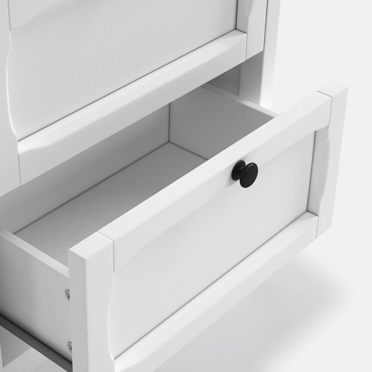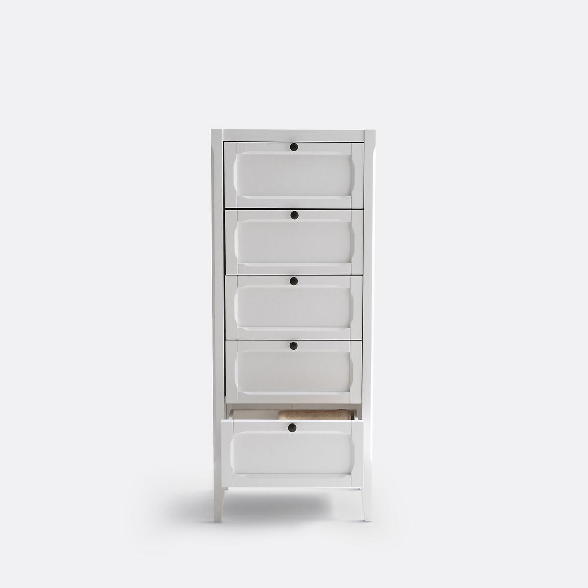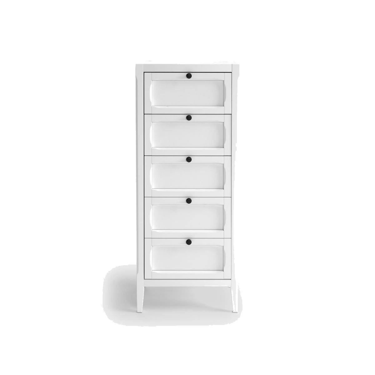 The Eugenie 5-drawer tallboy. This range of storage furniture has a family home feel, combining simple lines with original accents, available in a light grey or oak effect. Product Details • MDF with a matt nitrocellulose lacquered finish for the grey colour • MDF with an oak nitrocellulose lacquered finish for the oak colour • 5 drawers • Black metal knob. See other items from the Eugenie collection online. Dimensions. Total: • Width: 55cm • Height: 135cm • Depth: 44cm. Usable dimensions: • Drawer interior:W42.1 x H13.9 x D33.3cm. Home Delivery. Your Eugenie 5-drawer sideboard is self-assembly. It will be delivered to your home!Note! Please check that all access points are large enough to accommodate your delivery (doors, stairs, lifts). • WOOD FROM SUSTAINABLY MANAGED FORESTS. FSC® certified wood comes from forests that are environmentally, socially and economically well managed. Dimensions and weight of parcel • 143 x 52 x 21.5cm • 40kg