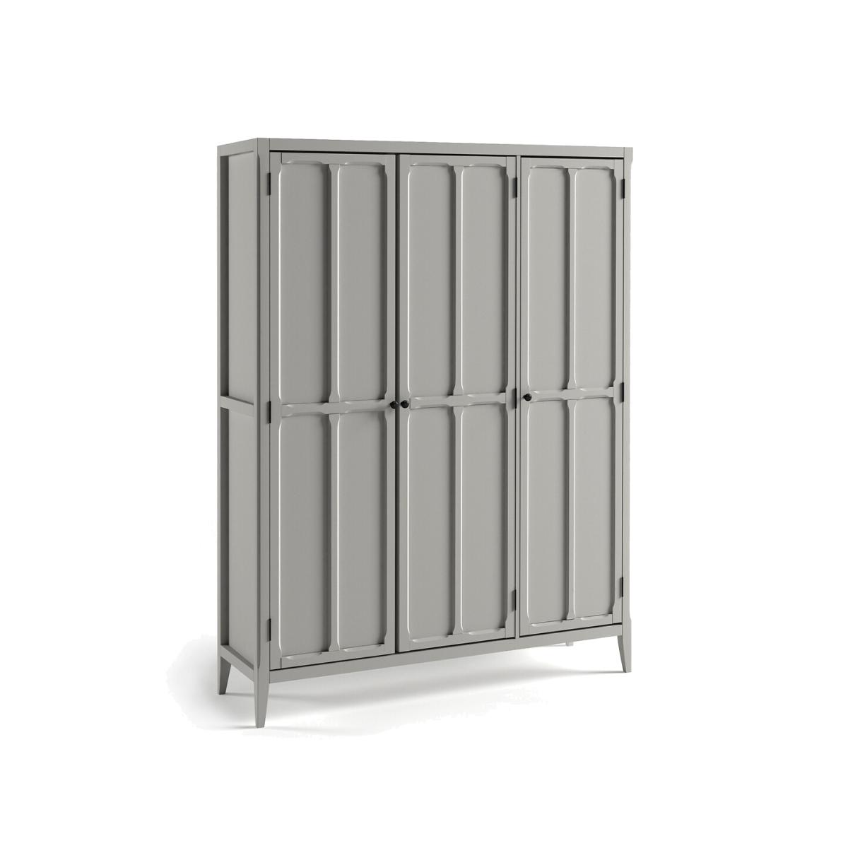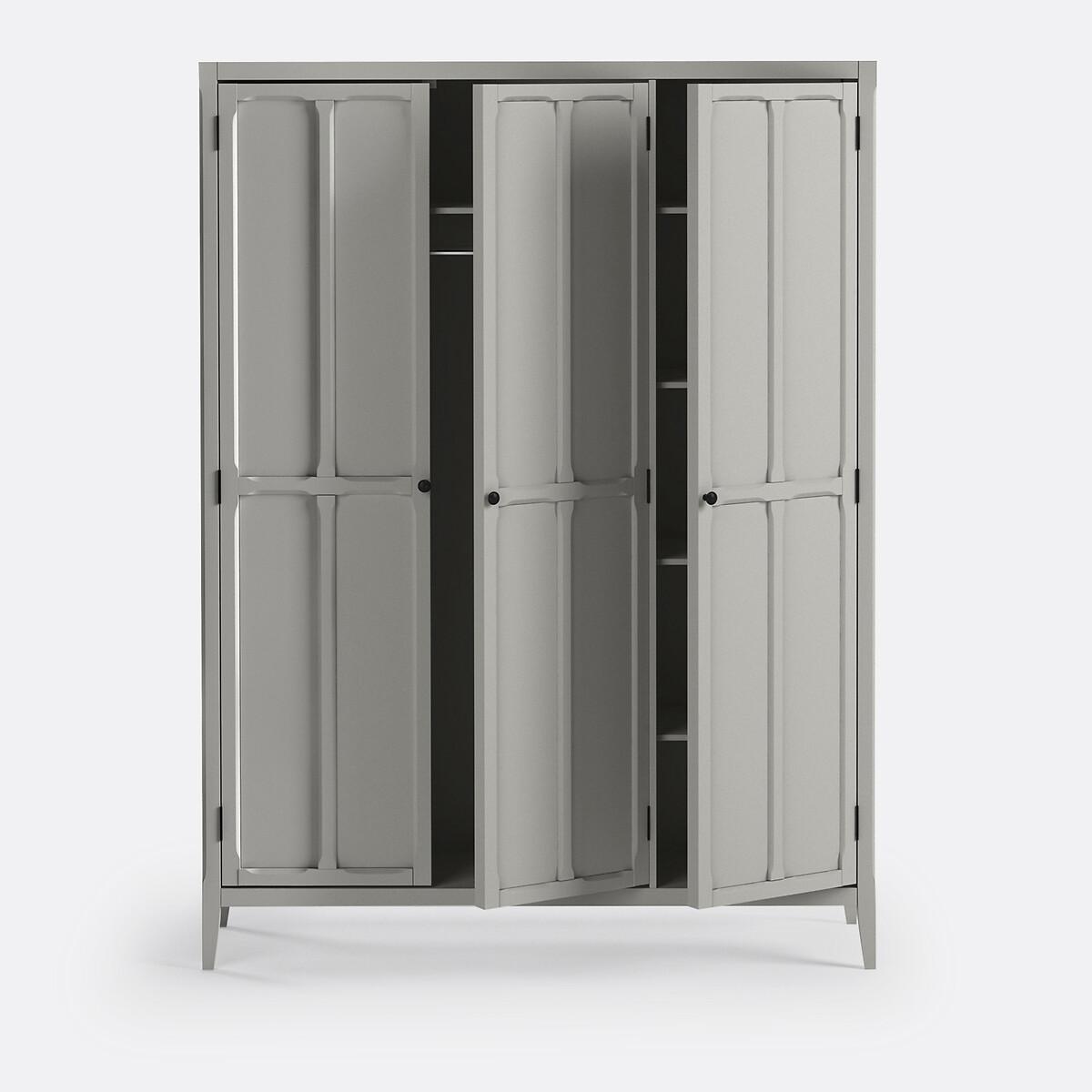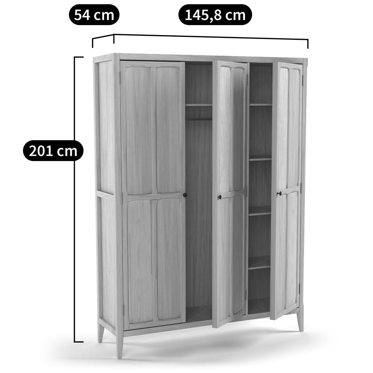 The Eugenie 3-door wardrobe. This range of storage furniture has a family home feel, combining simple lines with original accents, available in a light grey or oak effect. Product Details • 3 doors • 2/3 hanging space, 1/3 shelving • 4 shelves on one side and 1 large shelf above the hanging rail • MDF with a matt nitrocellulose lacquered finish for the grey colour • Oak-veneered MDF • Black metal knobsDimensions. Total: • Width: 145.8 cm • Height: 201cm • Depth: 54cm. Usable dimensions: • Hanging space : L91 x H142 x D47.7 cm • Linen Shelf:L45.5 x H34 x D47.7 cm • Wardrobe Shelf:L91 x H34 x D47.7 cmDelivery:. This product is sold for self-assembly. It will be delivered to your door. Note! Please check that all access points are large enough to accommodate your delivery (doors, stairs, lifts).Dimensions and weight of parcel:3 parcels • 209 x 62 x 16 cm, 40 kg • 146 x 62 x 15.5 cm, 37 kg • 185.5 x 53 x 14 cm, 27 kg
