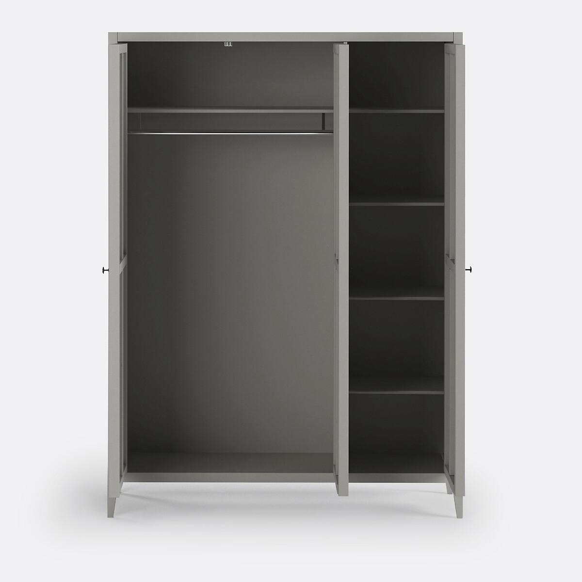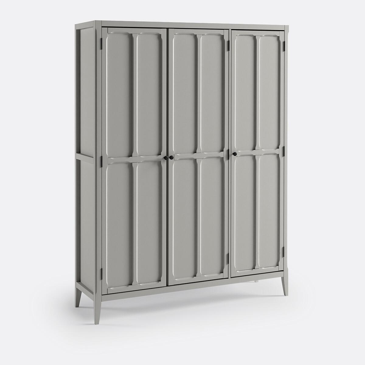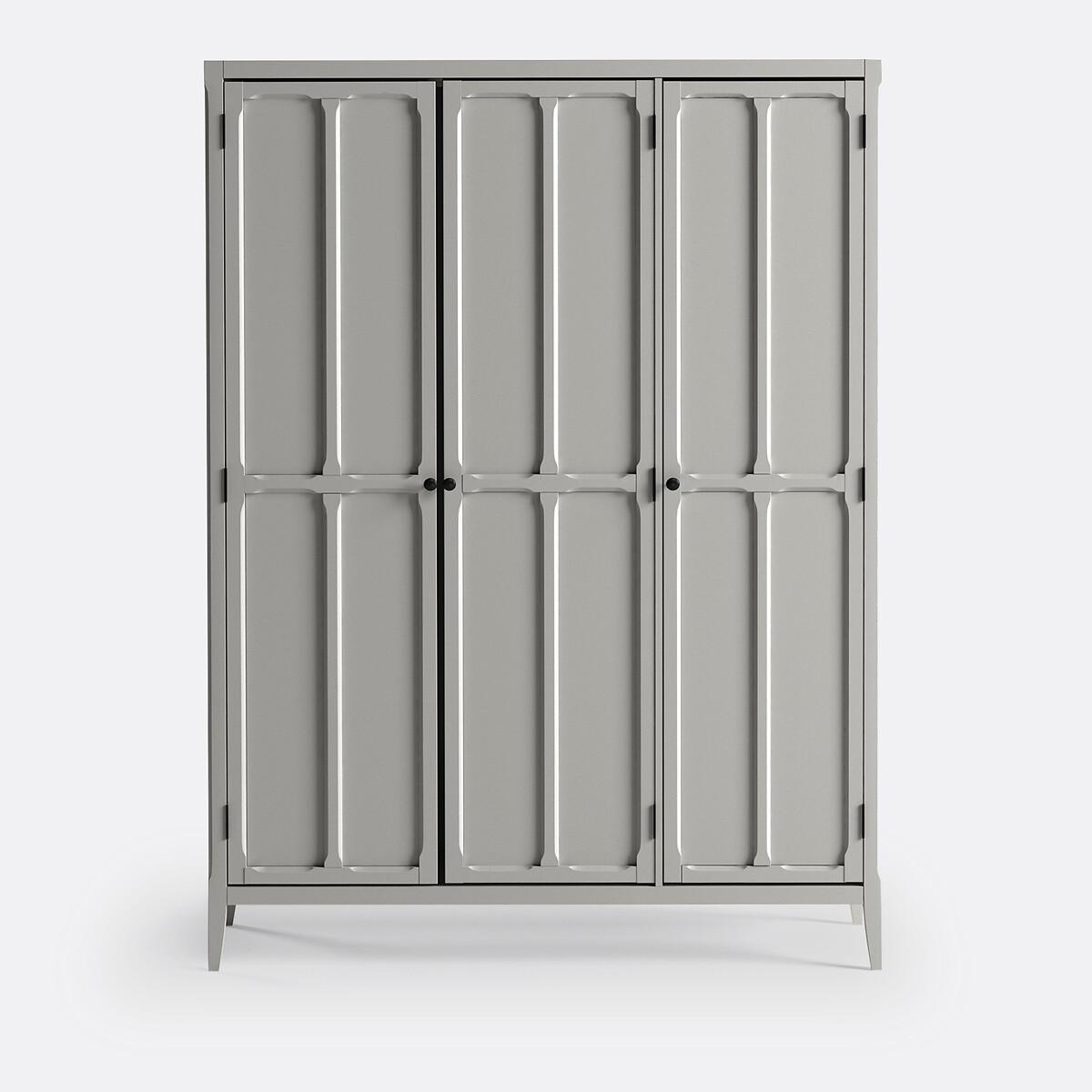 The Eugenie 3-door wardrobe. This range of storage furniture has a family home feel, combining simple lines with original accents, available in a light grey or oak effect. Product Details • 3 doors • 2/3 hanging space, 1/3 shelving • 4 shelves on one side and 1 large shelf above the hanging rail • MDF with a matt nitrocellulose lacquered finish for the grey colour • Oak-veneered MDF • Black metal knobsDimensions. Total: • Width: 145.8 cm • Height: 201cm • Depth: 54cm. Usable dimensions: • Hanging space : L91 x H142 x D47.7 cm • Linen Shelf:L45.5 x H34 x D47.7 cm • Wardrobe Shelf:L91 x H34 x D47.7 cmDelivery:. This product is sold for self-assembly. It will be delivered to your door. Note! Please check that all access points are large enough to accommodate your delivery (doors, stairs, lifts).Dimensions and weight of parcel:3 parcels • 209 x 62 x 16 cm, 40 kg • 146 x 62 x 15.5 cm, 37 kg • 185.5 x 53 x 14 cm, 27 kg