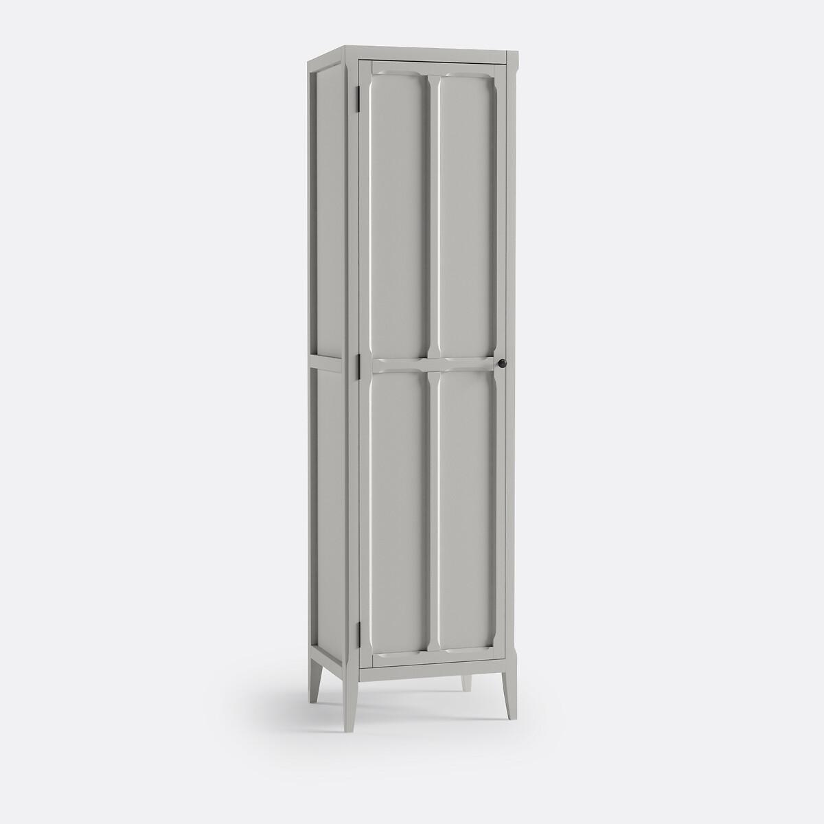 This range of storage furniture has a family home feel, combining simple lines with original accents, available in a light grey or oak effect. Product Details • 1 door • 4 shelves (2 fixed, 2 adjustable) • MDF with a matt nitrocellulose lacquered finish for the grey colour • Oak-veneered MDF • Black metal knobsDimensions. Total • Width: 54.1cm • Height: 201cm • Depth: 44cm. Usable dimensions: • Shelf: L46,1 x H34 x D37.7cm • Weight: 43.5kgDelivery:. This product is sold ready to assemble.. Note! Please check that all access points are large enough to accommodate your delivery (doors, stairs, lifts).Parcel dimensions and weight • L211 x D57 x 20.5cm • 50.5kg