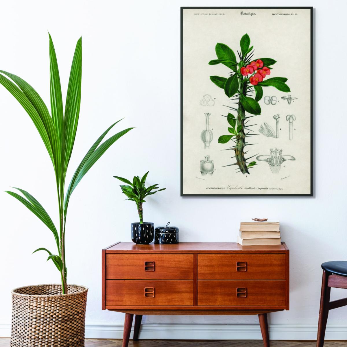 I really like the plant illustration on this print; it adds a fresh, botanical touch that works beautifully in a variety of interiors. It's especially well-suited for contemporary or minimalist spaces, where it can serve as a striking focal point without overwhelming the room. To style it best, consider pairing it with natural textures and neutral tones to let the artwork stand out, or add complementary greenery nearby to enhance the botanical theme. A good tip is to frame it with a simple, sleek frame to keep the look modern, or go for a vintage wood frame for a more eclectic feel. This print would elevate spaces like living rooms, kitchens, or even home offices, bringing a touch of nature indoors with ease.