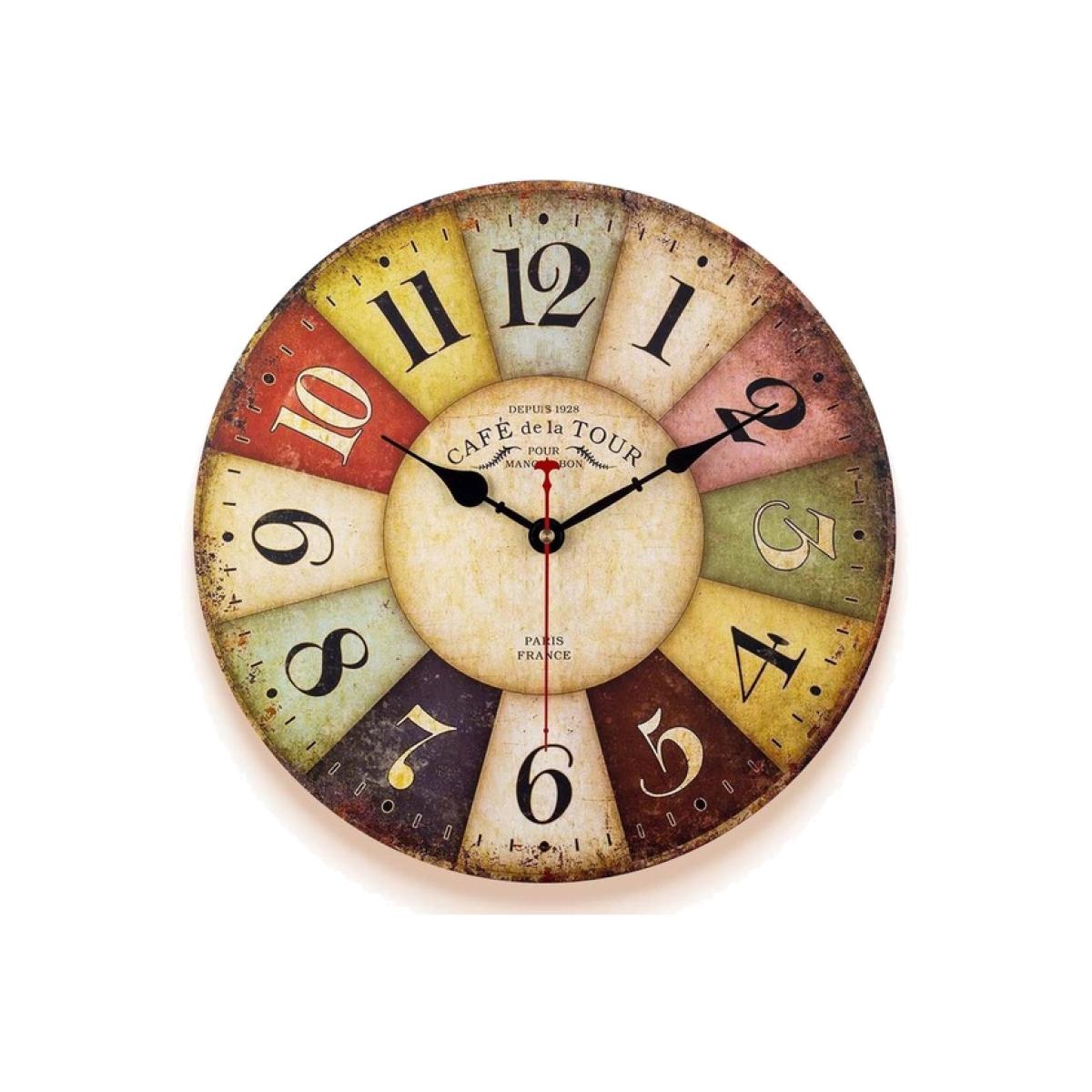I love this wall clock for its vibrant colours and playful, eclectic vibe. It works well in casual, lived-in interiors like kitchens, family rooms, or creative workspaces where a splash of colour can add warmth and personality. The mix of red and yellow with vintage-inspired numerals gives it a slightly retro feel, making it perfect for spaces with boho, shabby chic, or Scandinavian style. To style it effectively, consider hanging it against a neutral wall to let the colours pop, or pair it with other colourful accessories for a lively, coordinated look. Its silent movement makes it practical for bedrooms or quiet zones, ensuring it adds charm without noise.