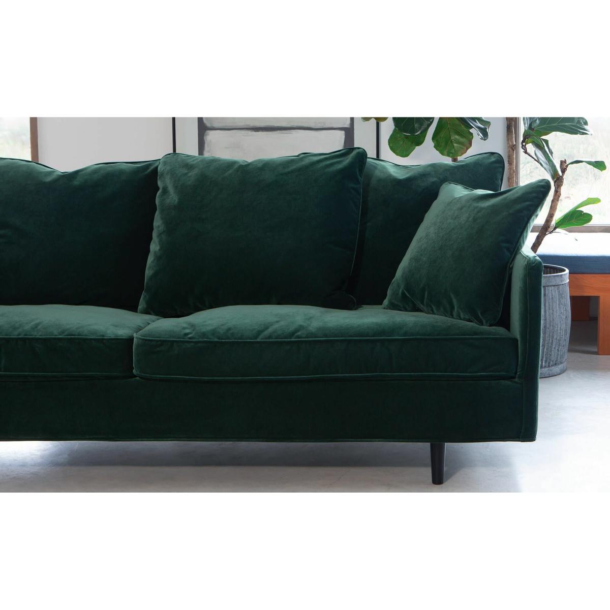 Influenced by the refined opulence of the Art Deco era, our Eva collection has sleek curves which offer a warm embrace and oversized feather filled scatter cushions to ensure maximum comfort. The sumptuous foam seats are finished with elegant piping, and it sits upon slender wooden legs. Available made to order in a wide range of fabric and colour options so you can find the perfect one to match your home. Pictured: Three Seater Sofa in Deep Green Classic Velvet.