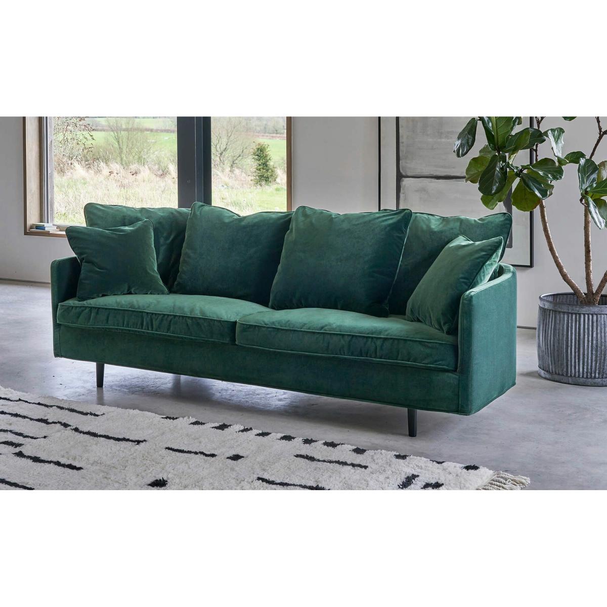 Influenced by the refined opulence of the Art Deco era, our Eva collection has sleek curves which offer a warm embrace and oversized feather filled scatter cushions to ensure maximum comfort. The sumptuous foam seats are finished with elegant piping, and it sits upon slender wooden legs. Available made to order in a wide range of fabric and colour options so you can find the perfect one to match your home. Pictured: Three Seater Sofa in Deep Green Classic Velvet.