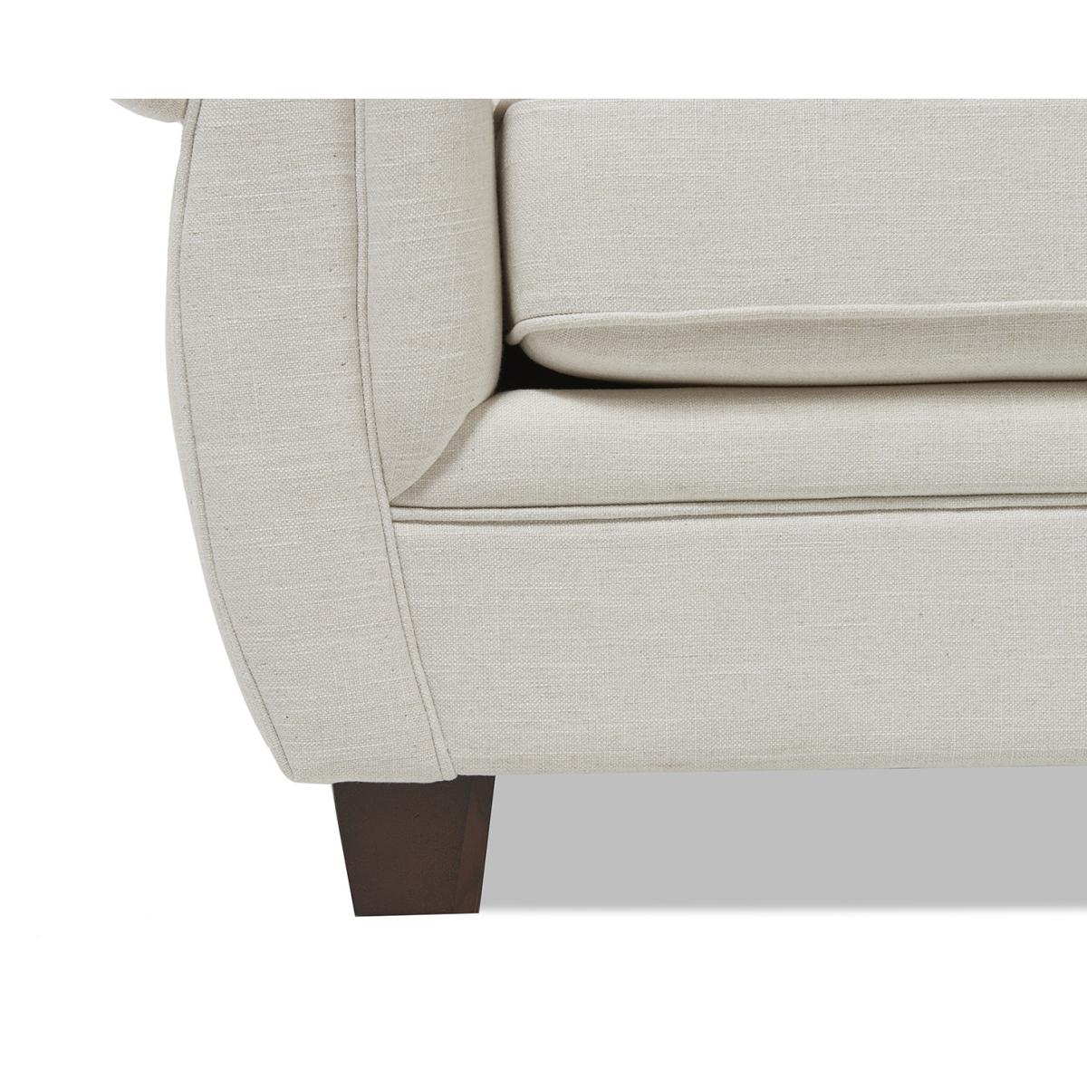 The comfy rounded shape of this Eva ivory white linen 2 seater sofa is supported by squared off dark wooden feet.