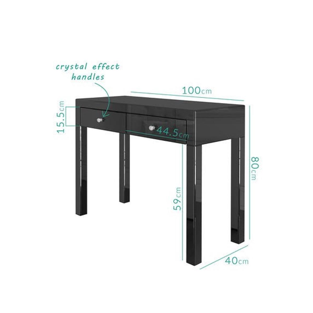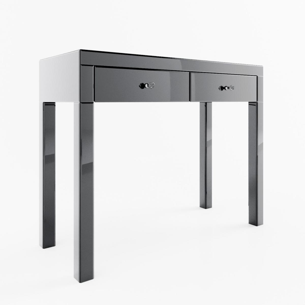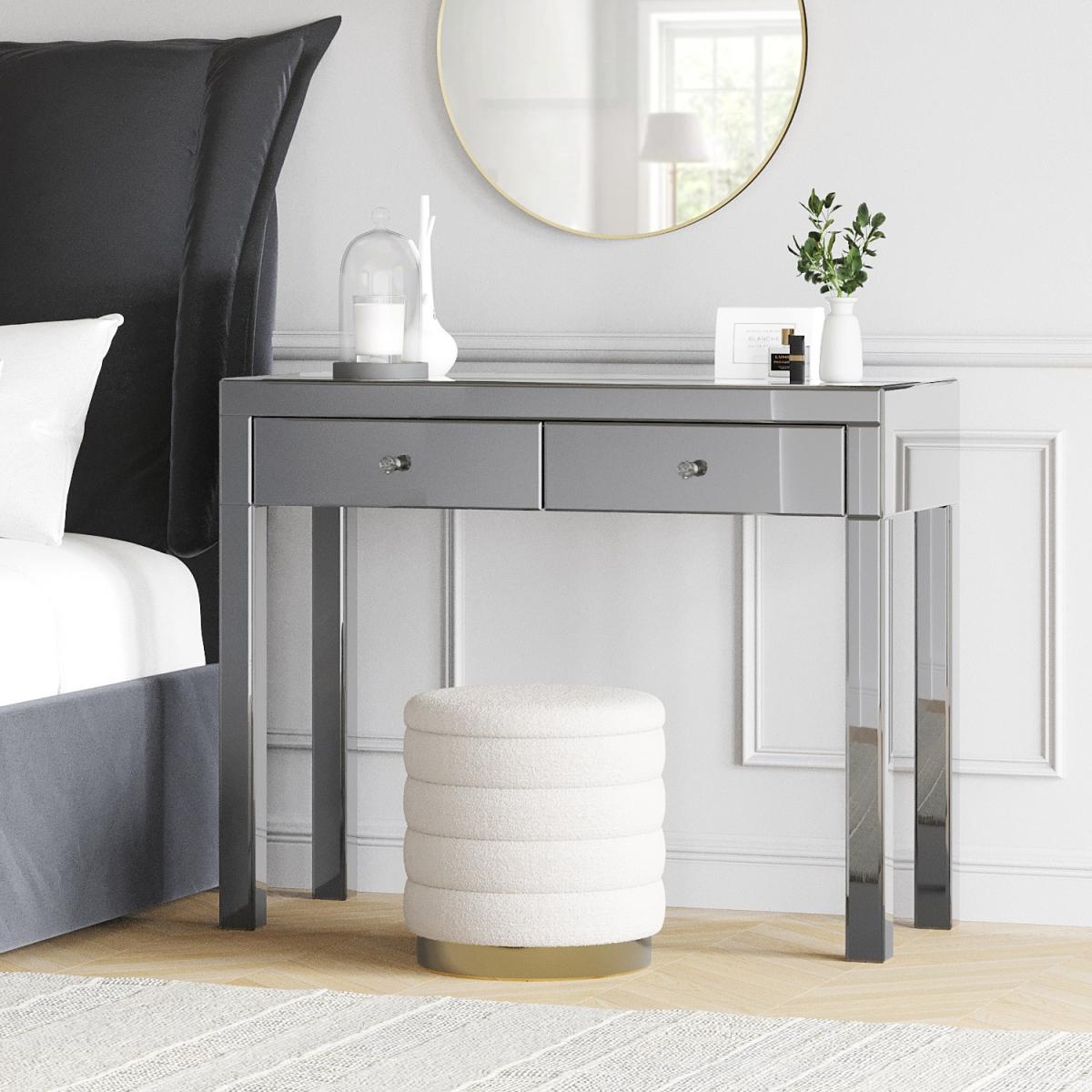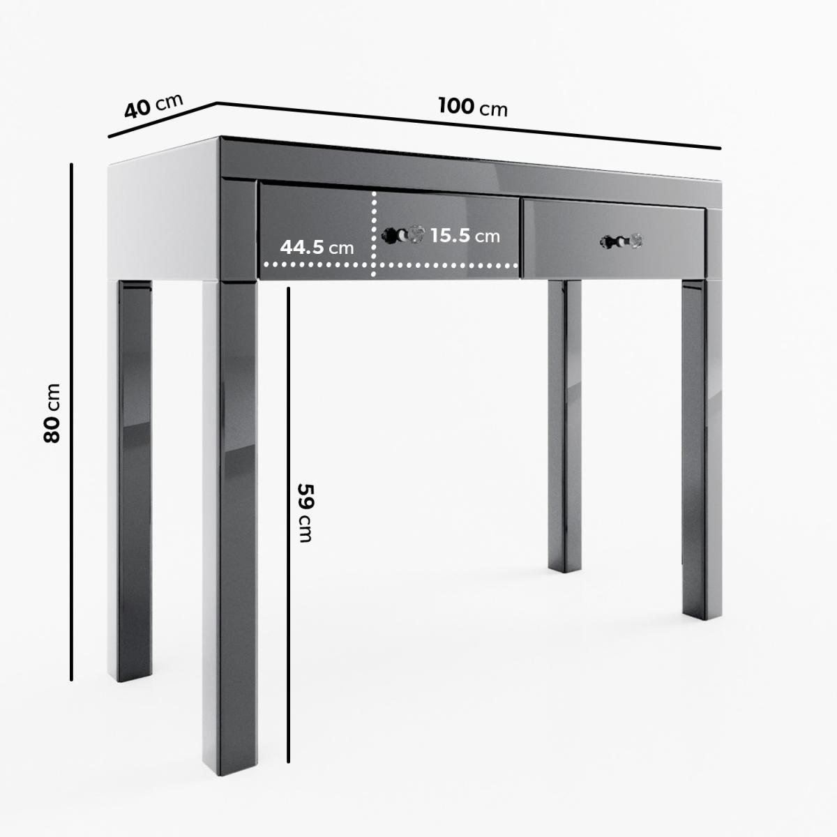 Features we love Simply makes your room sparkle with elegance. Exquisite and sophisticated smoky grey mirrored finish catches the eye. Helps brighten even the most compact of spaces. Two drawers with glamorous crystal style handles. Superb finish with beautifully bevelled edge glass panels. Clean design suits both modern and traditional decors All about me. Get ready in style. Inspired by the Italian Venetian period this Eva mirrored dressing table is truly exquisite and provides an easy way to add a touch of glamour to the bedroom. The beautifully bevelled edge glass panels have a high shine adding a sense of light and a touch of sparkle to the bedroom helping brighten even the most compact of spaces. The clean design will fit beautifully in a contemporary or traditional styled bedroom with the smoky grey mirror finish adding a sophisticated touch. The dressing table holds two drawers to neatly keep essentials make-up and cosmetics within easy reach they feature elegant crystal style handles completing the glamorous look. The drawers have been fitted with smooth and durable metal runners highlighting the quality workmanship of the bedside table. This stunning design has been carefully crafted each mirrored panel has been measured precisely and delicately set in place ensuring the furniture will last a lifetime. The piece has then been finished with beautifully bevelled edges giving a luxurious finish that's smooth to the touch. Need to know. Dimensions. H80 x W100 x D40 cm Material. Glass Finish. Grey mirror Hardware. Acrylic crystal effect handles Drawers. 2 Assembly required. Yes More info Smooth and durable metal drawer runners. Fully bevelled mirror panels4mm grey glass/mirror Matt black drawer interiors. Back panel is painted matt black there is no mirrored panel.