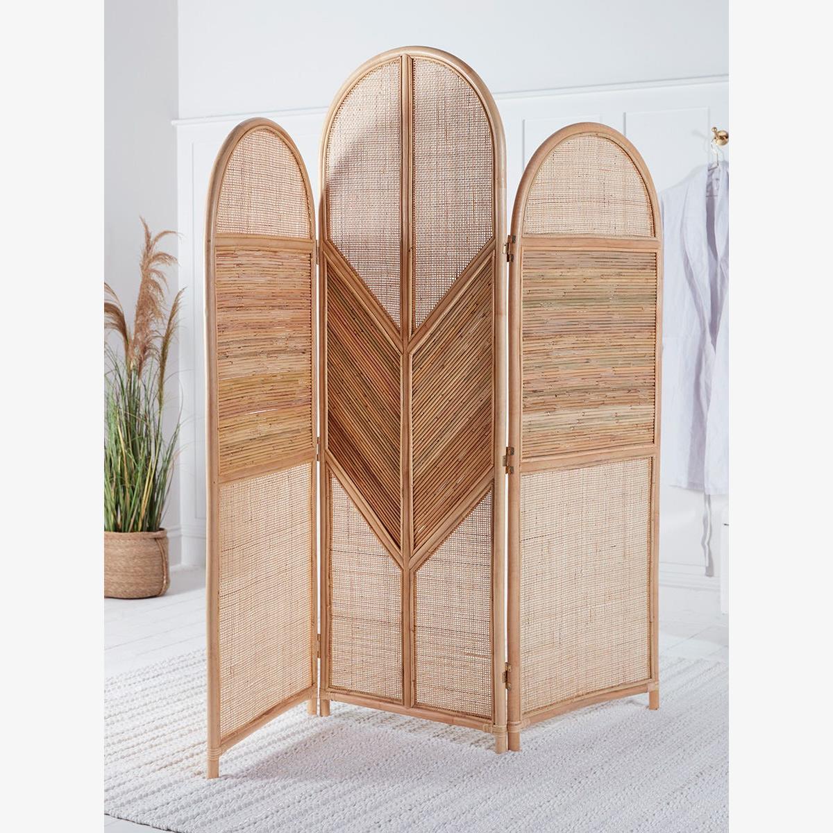 There’s something instantly alluring and glamorous about placing a screen in your home, particularly in a bedroom or elegant lounge. Our Eva screen provides three classic hinged panels with bentwood frames filled with rattan. Canework inserts, plain on the outer panels and arranged to create a chevron design at the centre, provide additional interest.  The natural materials provide warmth and texture - perfect for concealing less attractive features or simply used to divide your space.