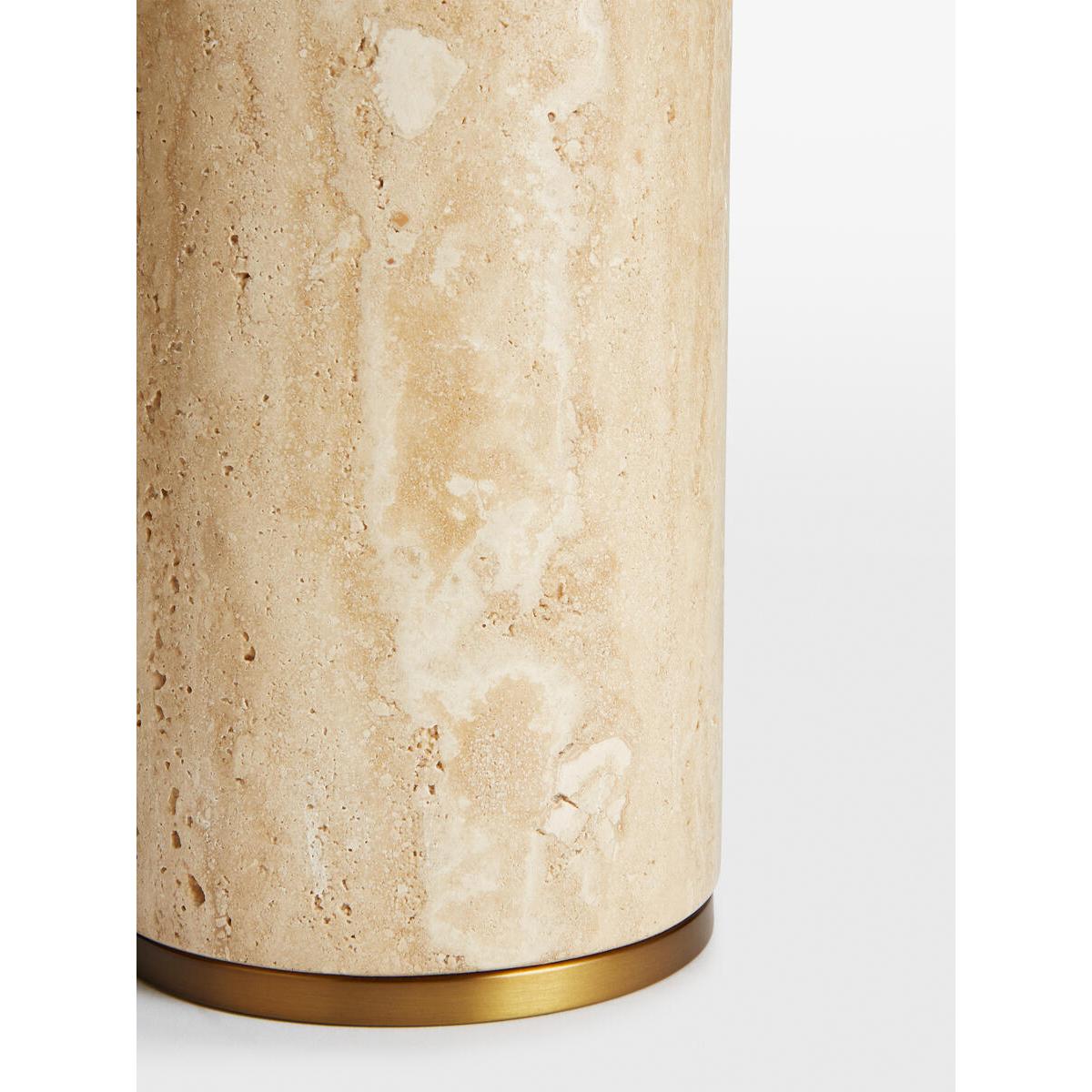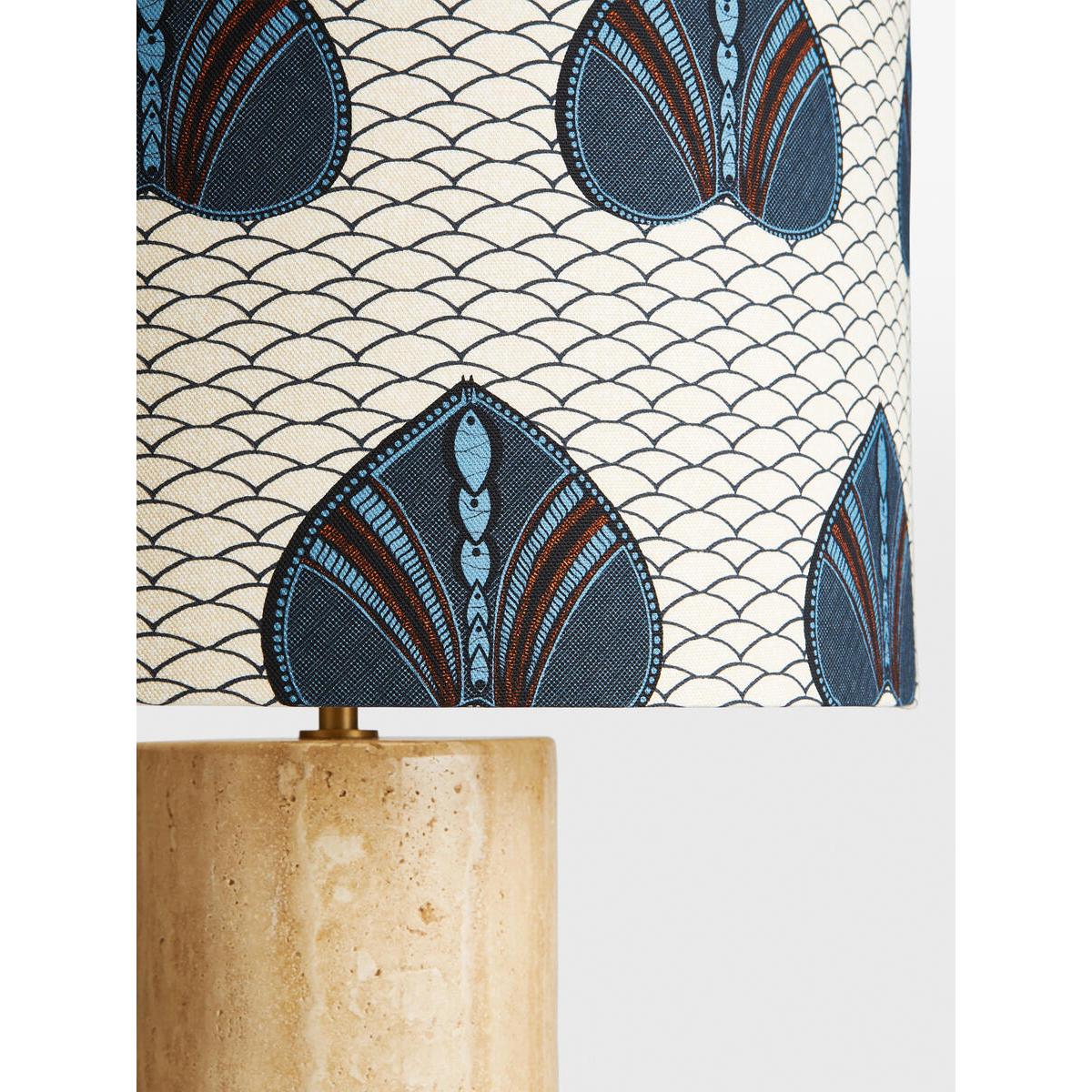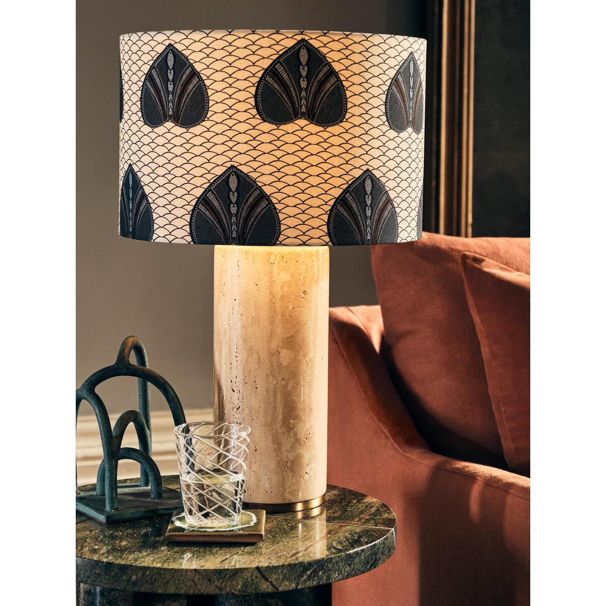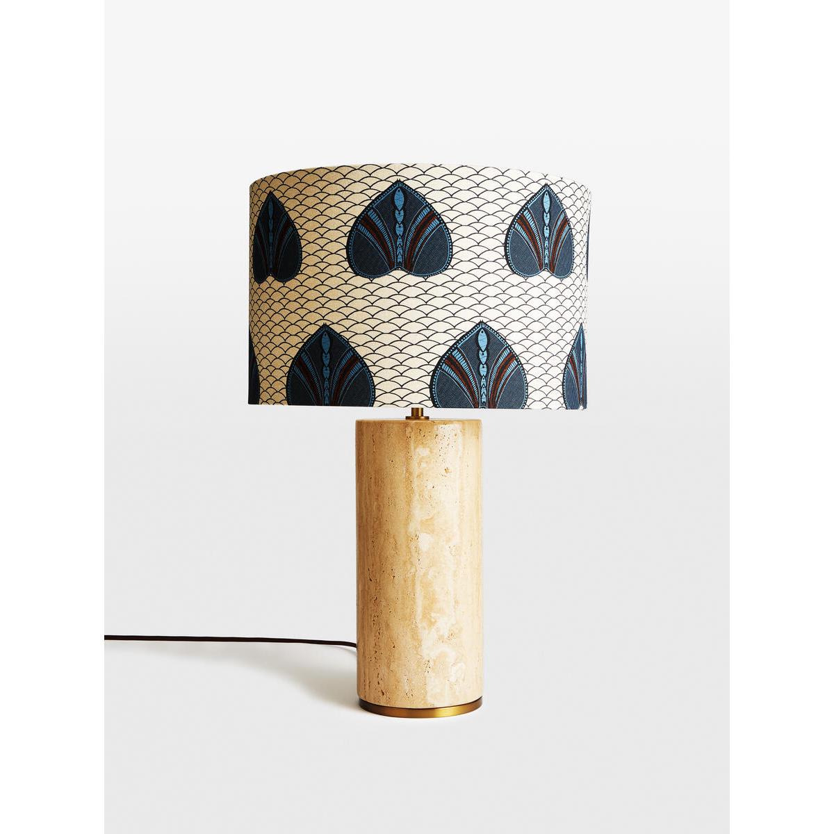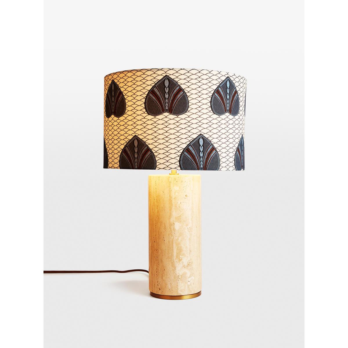 Designer and Shoreditch House member, Eva Sonaike, is creativedirector of her eponymous London-based interiors brand, whichbrings a vibrant and distinctive West African aesthetic intopeople's homes. Each home collection features colourful textilesand original designs created by the designer. Characterised by a travertine base, the Ijoba lamp features ahandmade 100% cotton half Panama shade and the brand's Ijobafabric, which is inspired by the botanical gardens in Ghana. Large table lamp with cylindrical travertine base. 100% cotton half Panama shade. Ijoba design inspired by botanical gardens in Ghana. Bulb not included. Made in collaboration with Eva Sonaike.