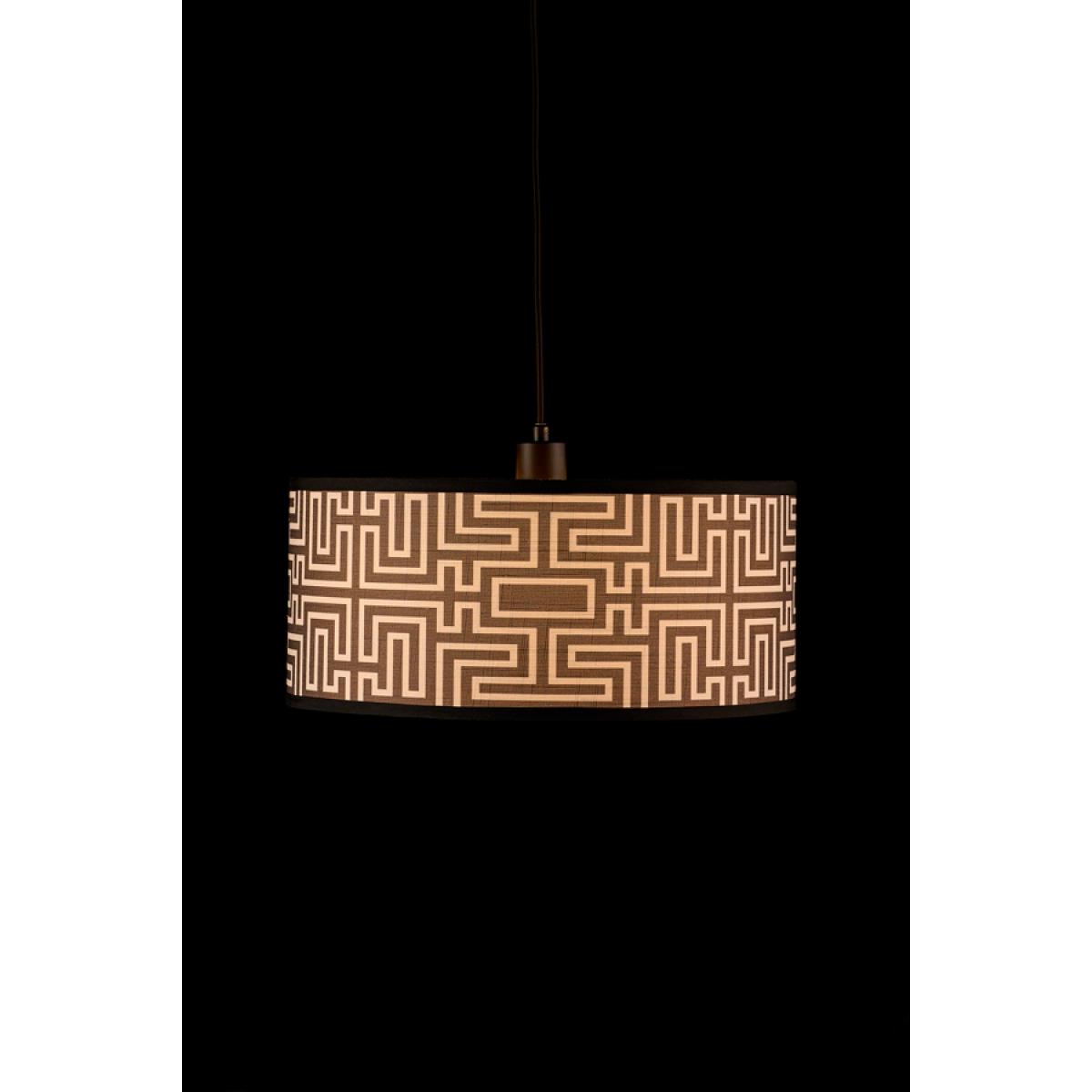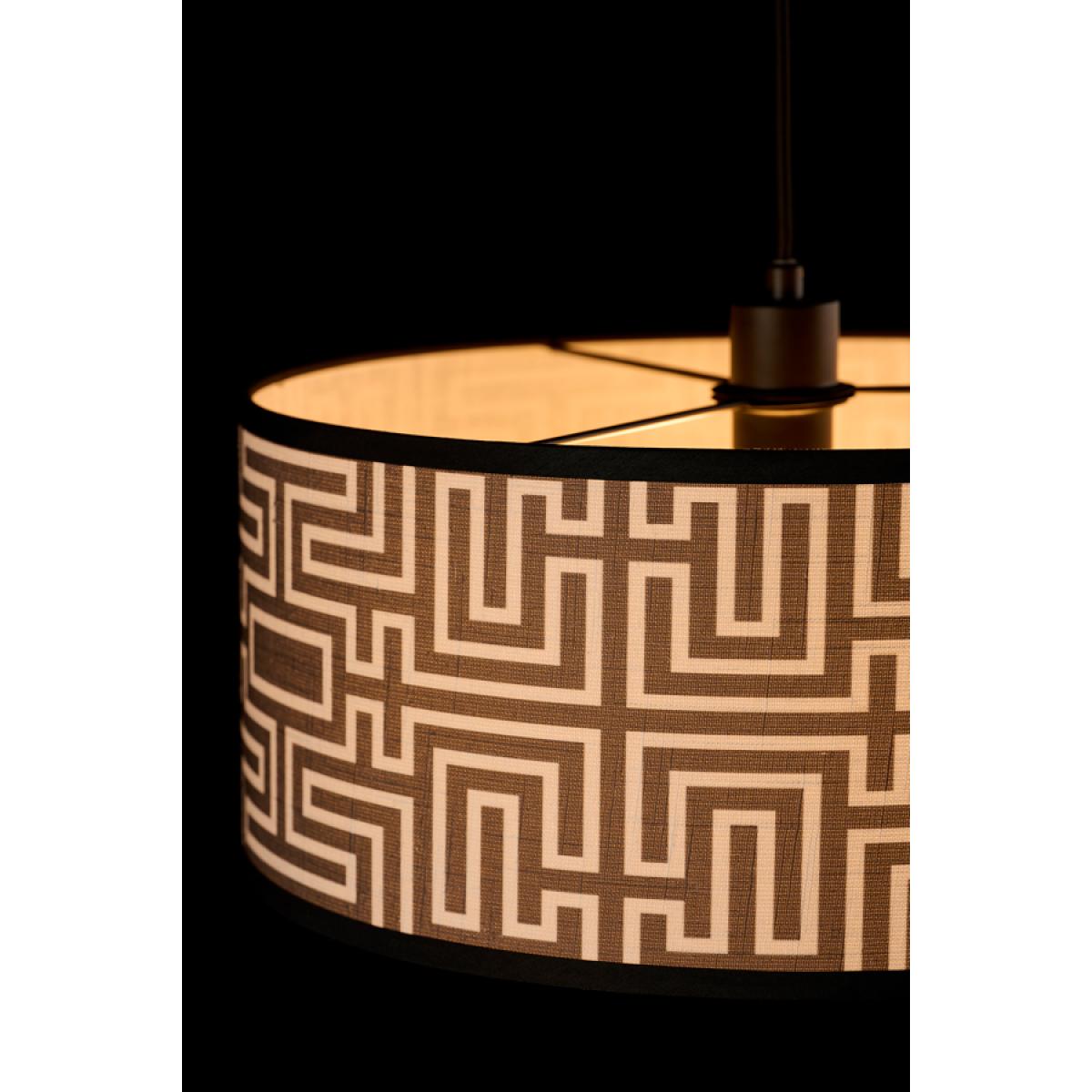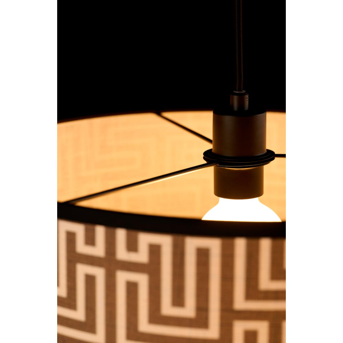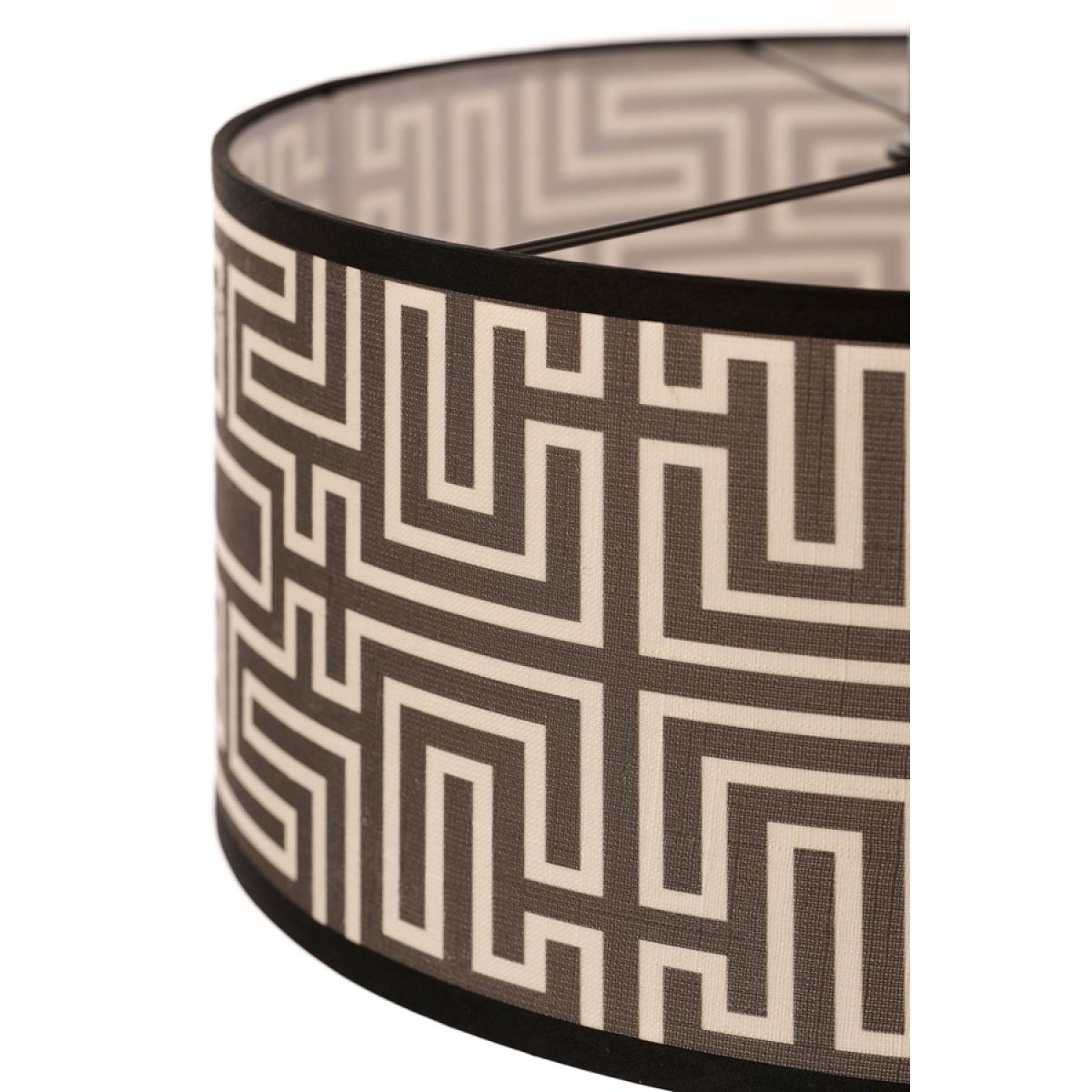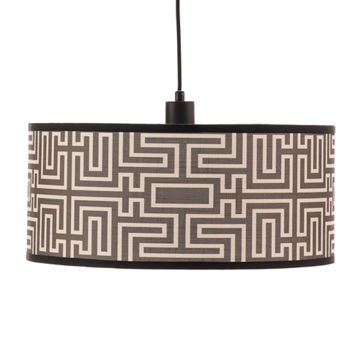 Contemporary light fitting featuring a drum shade with a bold geometric printed design and neat black edging tape. Black woven cable. Matt black metal ceiling rose and bulb holder. Supplied complete with E27 40W globe bulb. Height adjustable prior to installation.