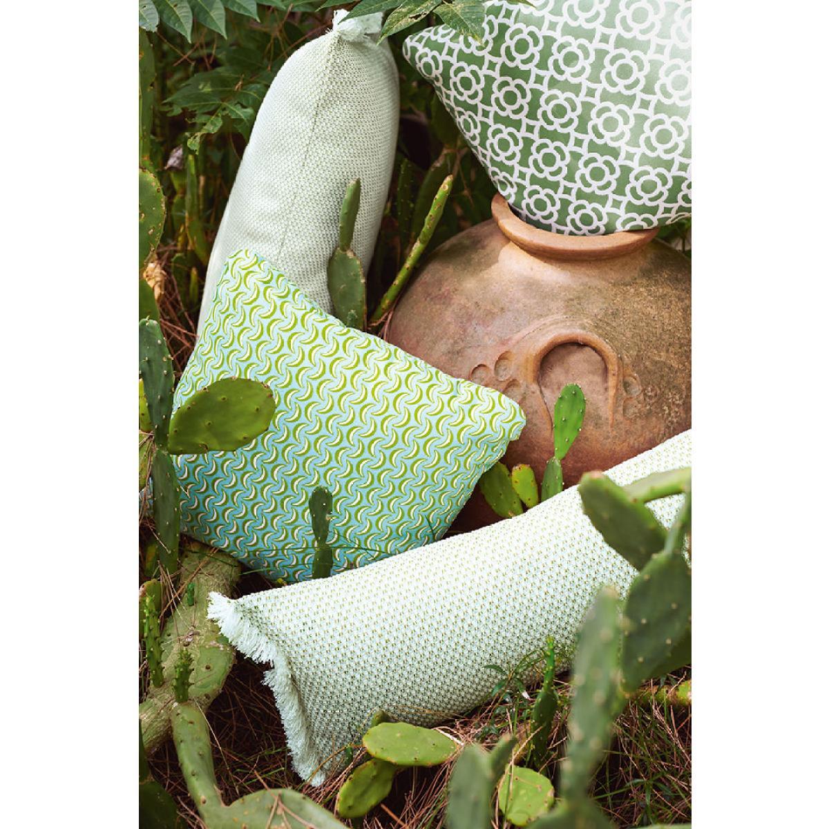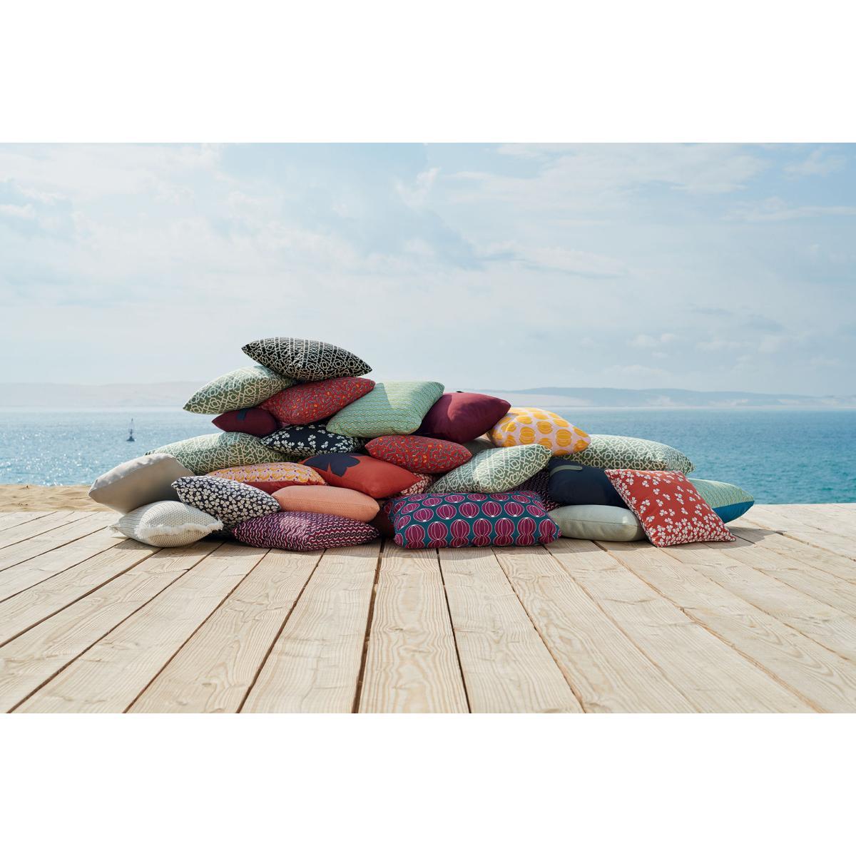 A collection of cushions for outdoor use that invites us instantly to travel and escape. Inspired by the nomadic world, travel and encounters, these blended cushions take us far away in the blink of an eye. Evasion is the ideal range to bring a bohemian, cosy touch to your terrace or garden. Each cushion is upholstered with a relief Jacquard fabric inspired by traditional baskets, giving them both character and an authentic look. The surface of these cushions is rich, luminous and tactile to immerse us in a vibrant, warm atmosphere. In addition, Evasion’s soft colours form a poetic, graphic whole. The fabric covering has a water-repellent Teflon® finish, is anti-UV and stain- and moisture-proof. Easy to look after, these cushions have removable covers which are machine-washable (30°C).