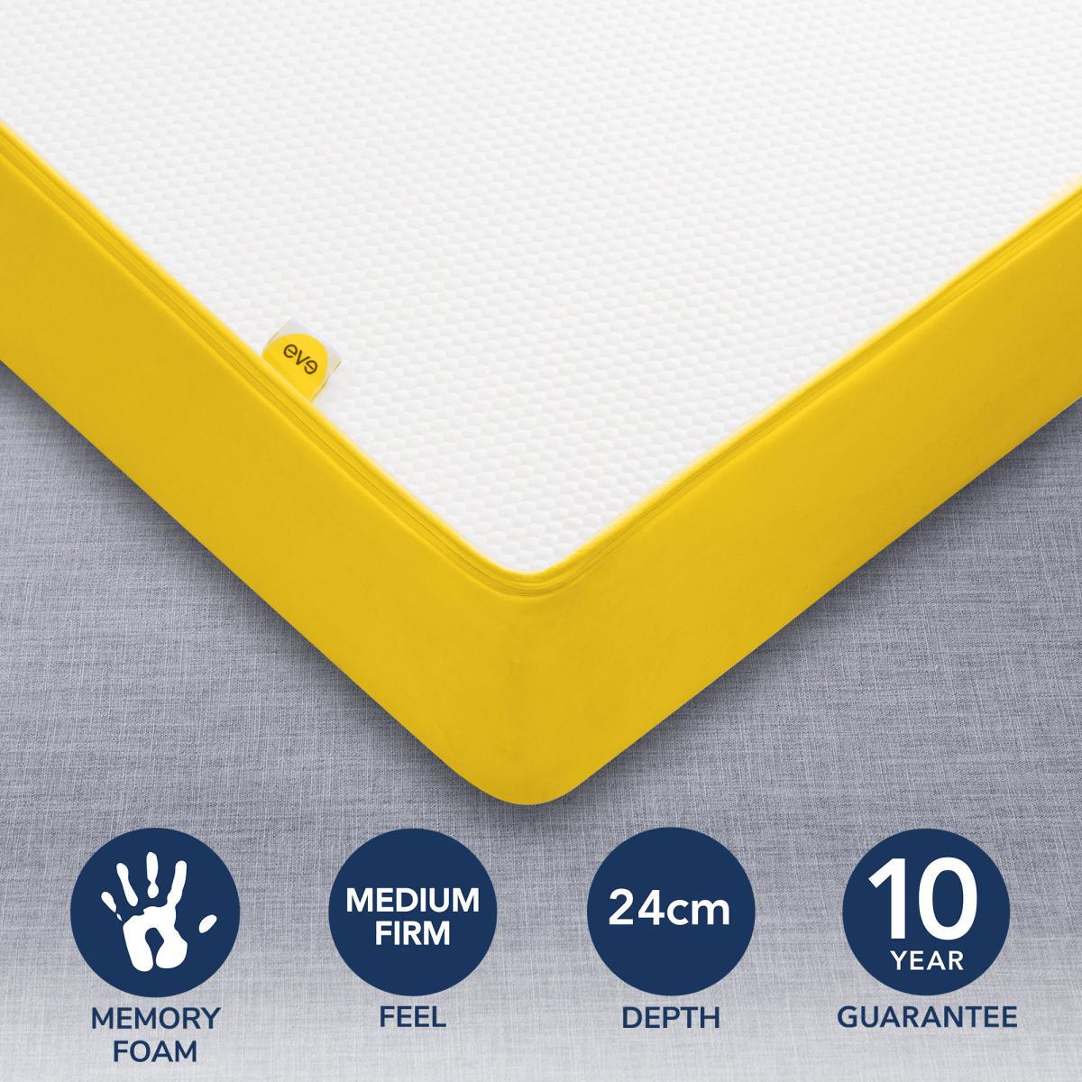This Original Mattress from Eve Sleep is the perfect place to recharge your batteries, offering cloud-like comfort for every inch of your body and extra support to help keep aches and pains at bay. This mattress comes with a 100 night sleep trial to give you time to decide if your Eve mattress is right for you. This mattress features three layers of foam that work together to support your body and keep the pressure off, providing a medium to firm support. The evecomfort® layer is a springier foam that helps to keep your spine aligned, the memory layer provides snug softness and keeps the pressure off while the base layer is strong and provides support for all body types. This layer is slightly denser to prevent sagging and features seven small contour zones that aid in relieving pressure from shoulders and hips. The mattress also features an anti-slip base to keep everything in place on your bed. This luxuriously comfortable mattress is delivered compressed, vacuum sealed and rolled neatly in a box to make transporting it up your stairs easy. Simply unwrap it in your bedroom, lay it flat on the bed and the mattress will expand to its full size within a few hours. You don’t need to turn your mattress but we recommend you rotate it 180 degrees once a month. You have 100 nights to decide if your eve mattress is right for you. There’s no need to keep it under plastic - just sleep as you normally would. There’s no need to hold on to the packaging for the length of your trial either. And don’t worry, if the mattress is accidentally damaged in the course of day-to-day life, eve will still take it back. If you're not happy with the mattress, all you have to do is email eve at hello@evesleep. Co. To check out our handy sizing guide to help you find out if you’ll be able to get your new mattress into your home.