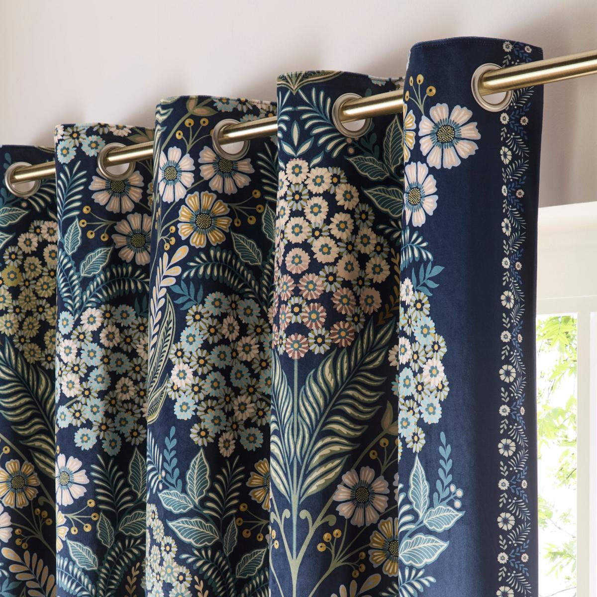 * 1 pair - includes 2x curtain panels* Robust 100% Cotton composition* Arts and crafts inspired design* Eyelet header* Corresponding bedding available Add a touch of sophistication to your bedroom with the Evelina curtain. Featuring a beautiful, Arts and Crafts inspired design in a rich navy colourway, the Evelina curtain is an eye catching statement in any bedroom. Crafted from luxurious 100% Cotton with a versatile Eyelet header, the Evelina curtain sports an elegant, neat drape. Pair with corresponding bedding items for a cohesive, luxurious look within your bedroom. This collection is verified by OEKO-TEX and independently tested for harmful substances as well as manufactured using sustainable processes under socially responsible working conditions.