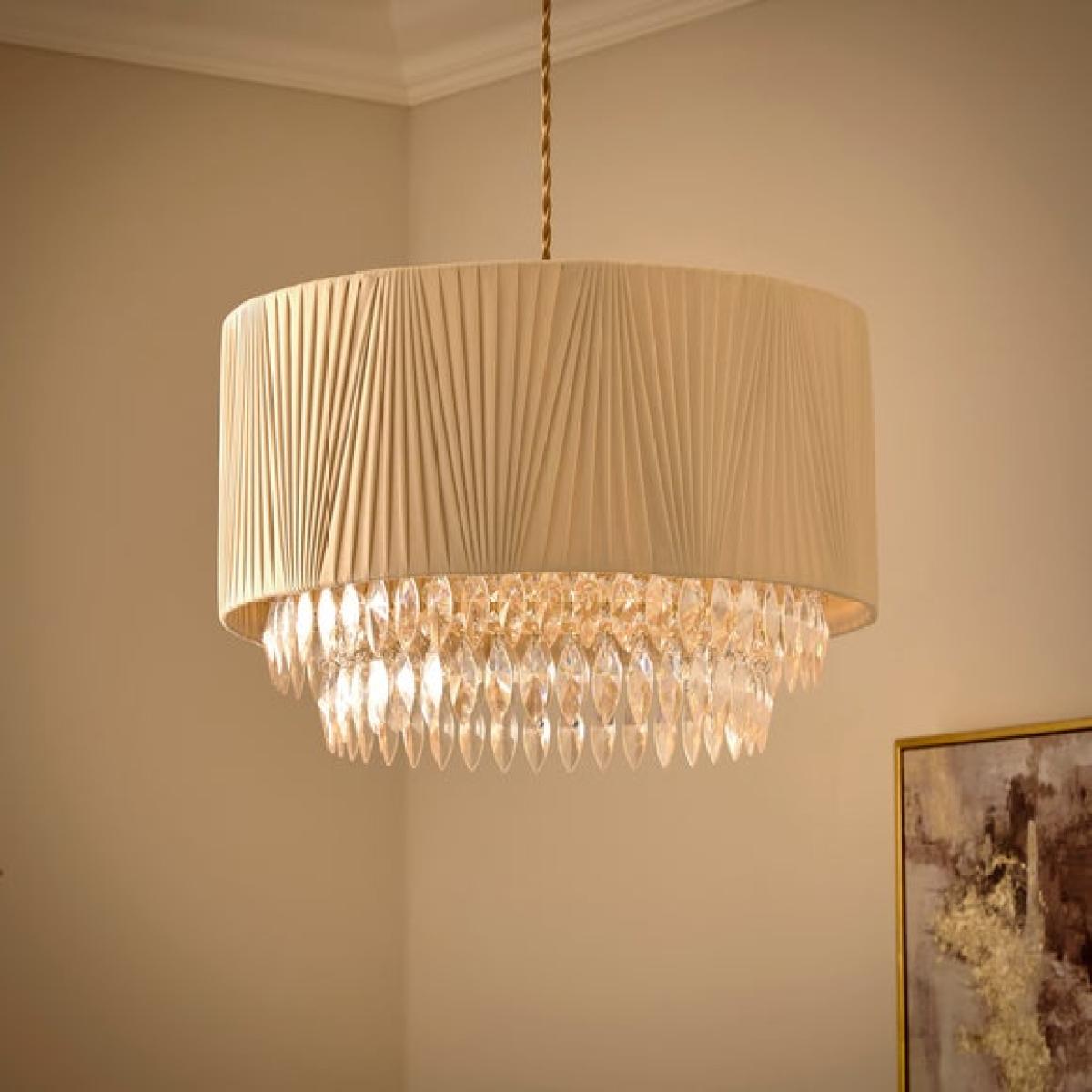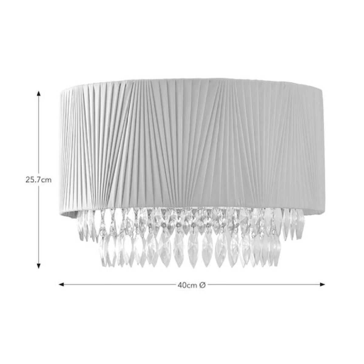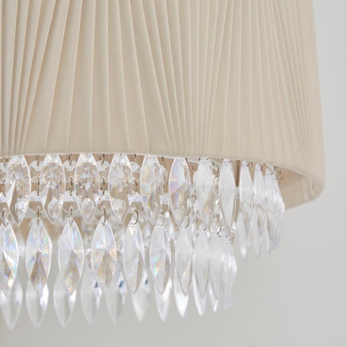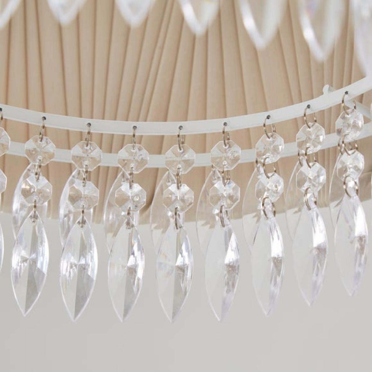 * Textured Design * Hanging Acrylic Beads * Easy Fit - Simple to Install * Available in Multiple Colourways Make a statement with the Evelyn Easy Fit Lamp Shade, which features a lovely textured design with tiered hanging beads. Made from durable fabric and acrylic, it's available in multiple colourways.