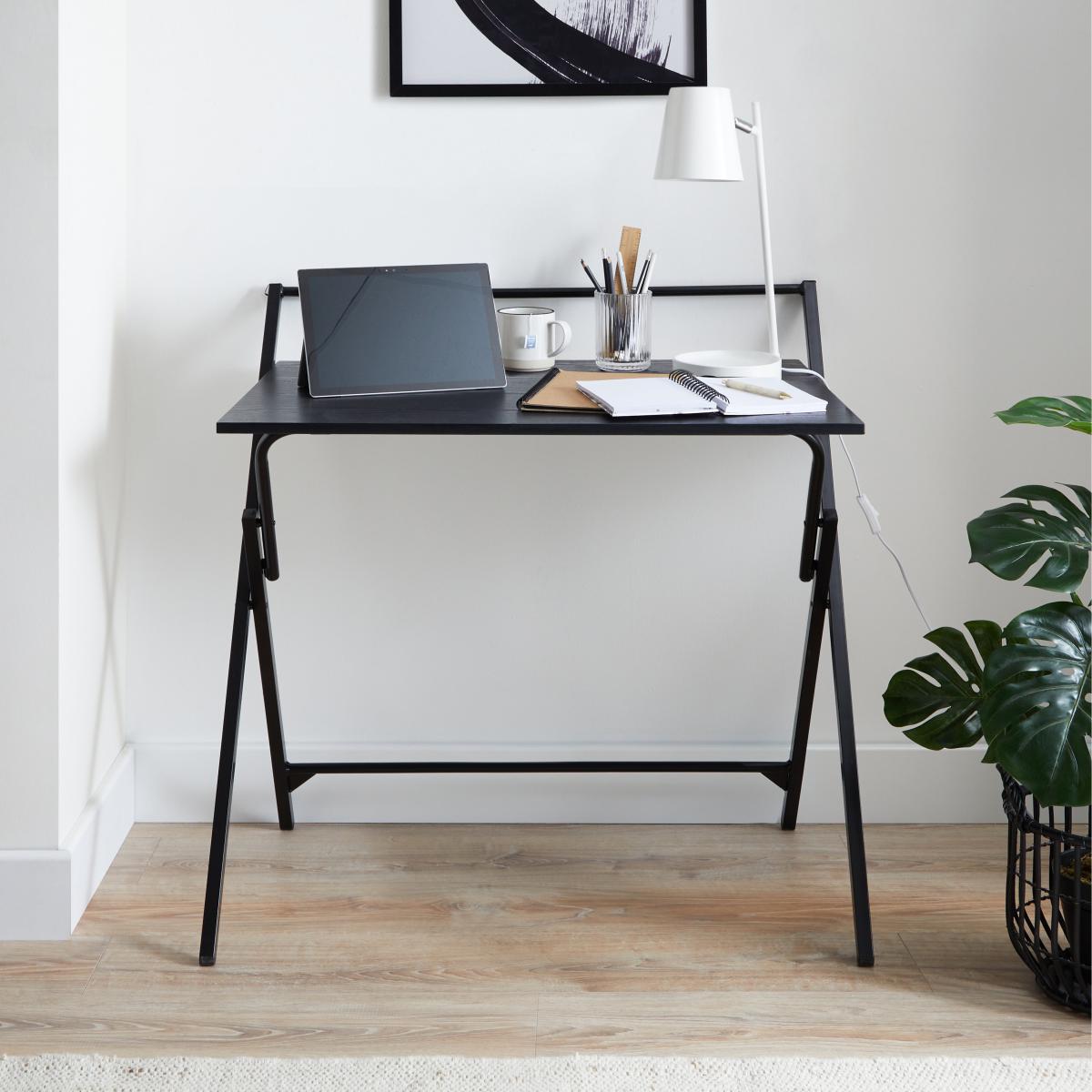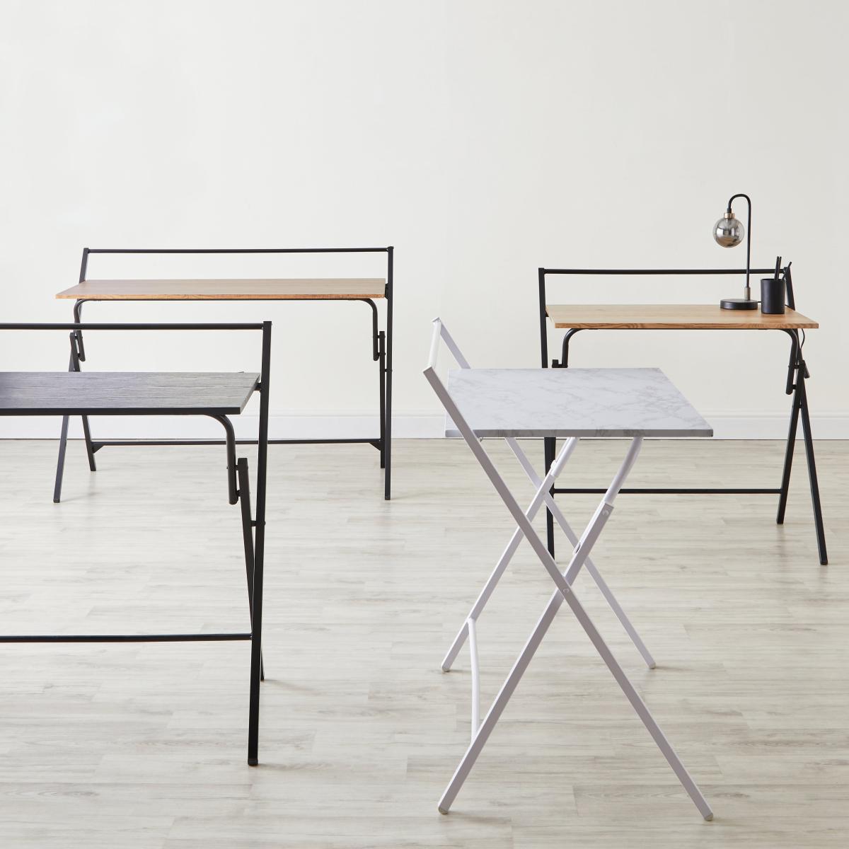 The Evelyn desk is the ideal office solution for smaller spaces or the occasional work-from-home days. The desk features a spacious, wood effect worktop that conveniently folds flat on its trendy, black metal frame for easy storage when not in use.