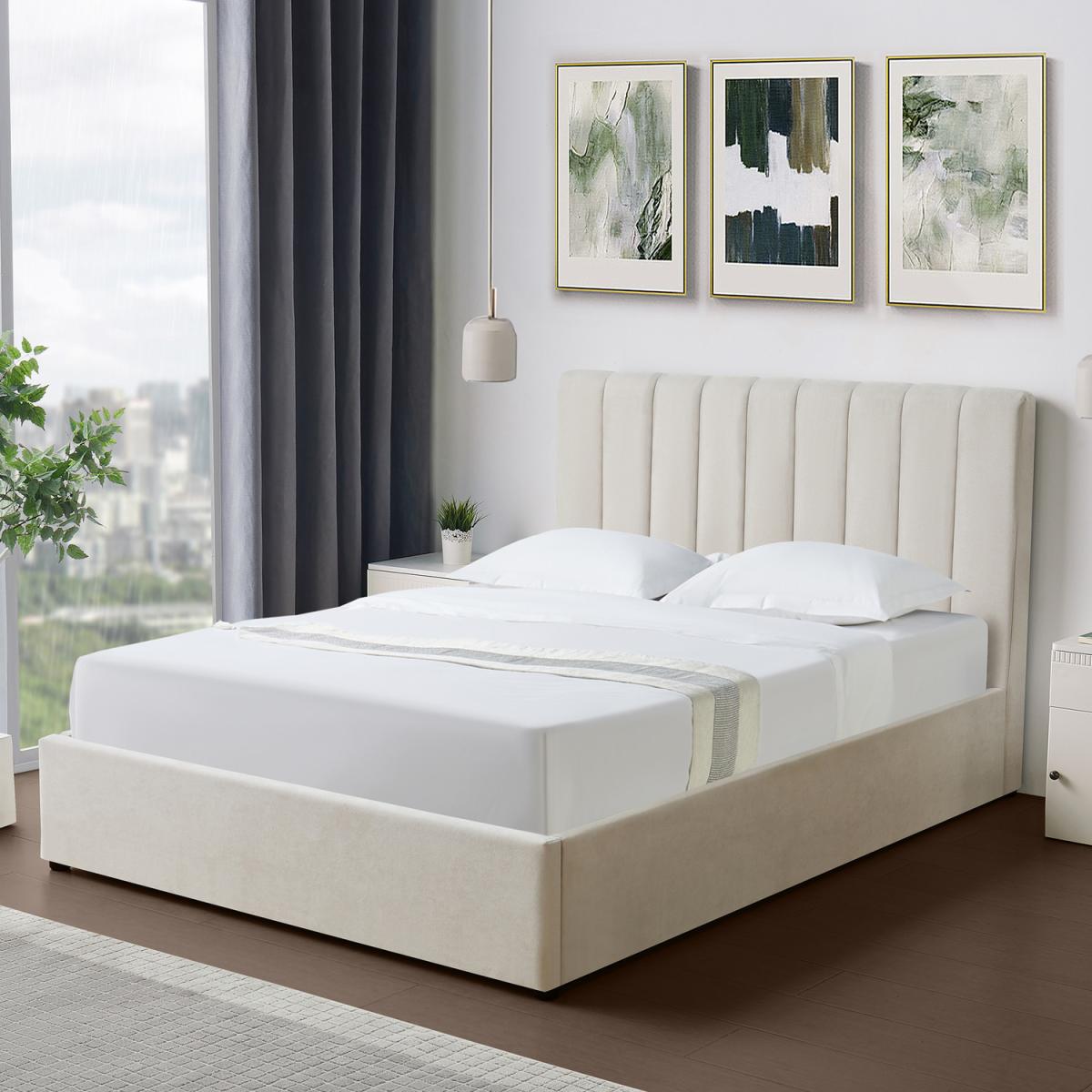 Elevate your bedroom with the Evelynne Fabric Upholstered Ottoman Double Bed Frame, a stunning and practical choice for modern living. Expertly upholstered in soft, durable linen fabric, this elegant double bed frame is designed to fit a standard 135cm x 190cm mattress (mattress not included). The ottoman frame features a smooth gas lift opening, revealing spacious under bed storage - ideal for stowing away bedding, clothes, or everyday essentials. With easy self-assembly and quick, efficient delivery, the Evelynne combines timeless style with functional design, making it the perfect centrepiece for any contemporary or classic bedroom.