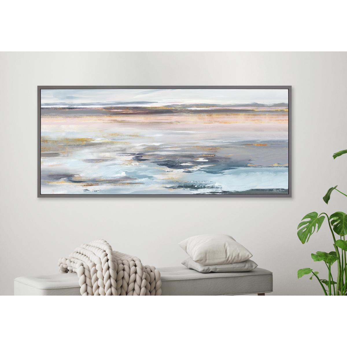Atmospheric abstract ocean scene. In muted restful tones of blue and grey. Stylish narrow options and contemporary slender frame. Gently abstract in feel, the Eventide framed canvas wall art by Canadian artist Valeria Mravyan beautifully depicts coastal light at the point where the evening sunset meets the sea. The predominantly muted tones of grey and blue are lifted by the vivid orange flashes of the setting sun. This canvas-wrapped piece of wall art is a wonderful choice for a dining room or even a bedroom wall where its restful tones and rendering of atmospheric light create a feeling of relaxed calm. The narrow proportions and slender frame add to its elegant contemporary appeal. A wonderfully creative combination of light, colour and texture, the Eventide framed canvas wall art is part of the Furniture Village wall art collection. Dimensions. Width: 134 cm (52.5 inches). Height: 59 cm (23 inches).