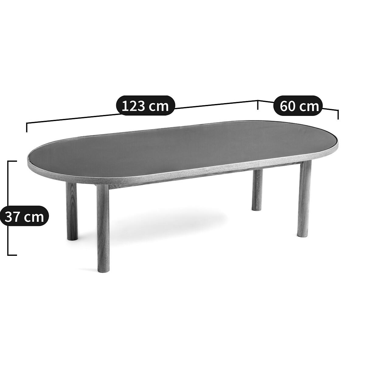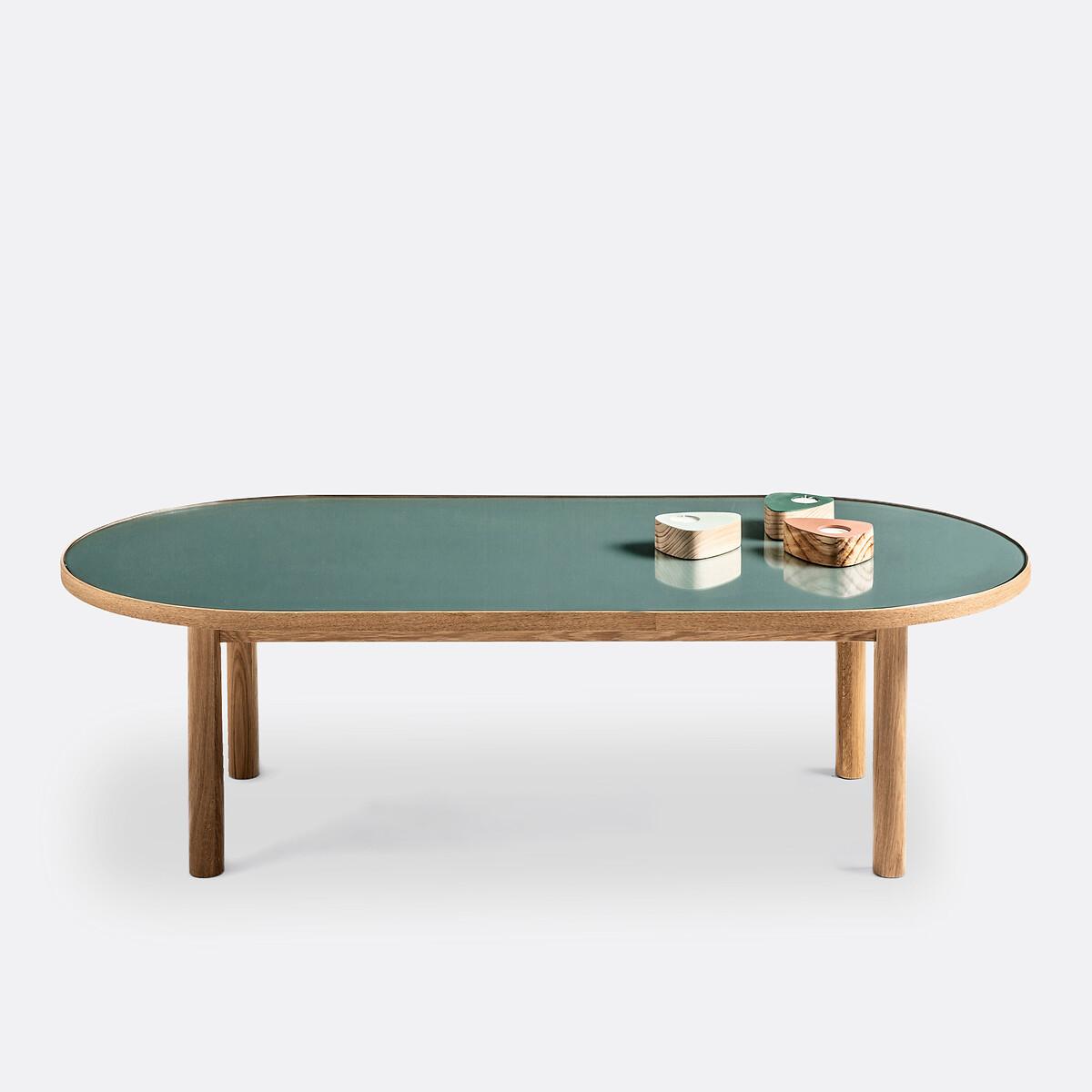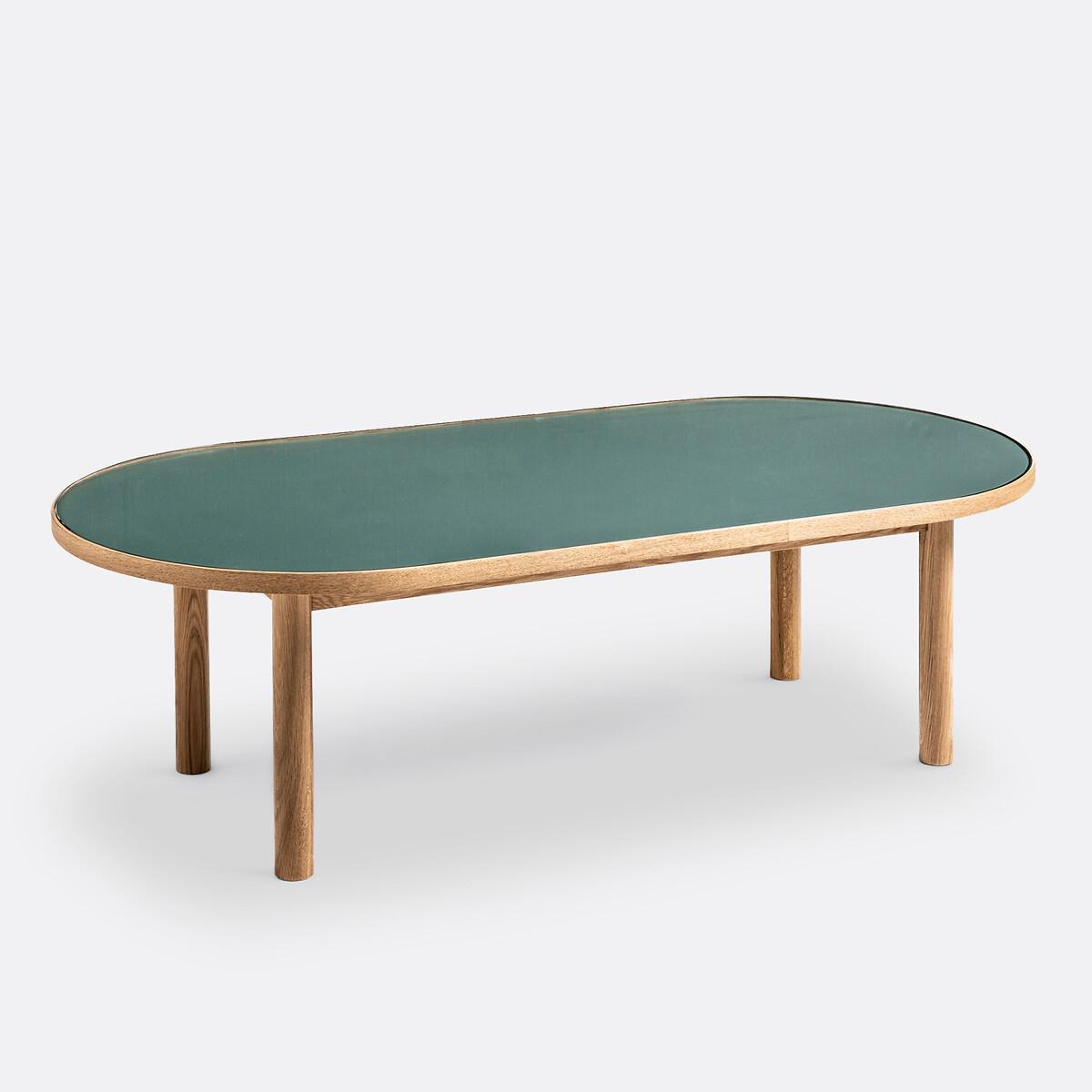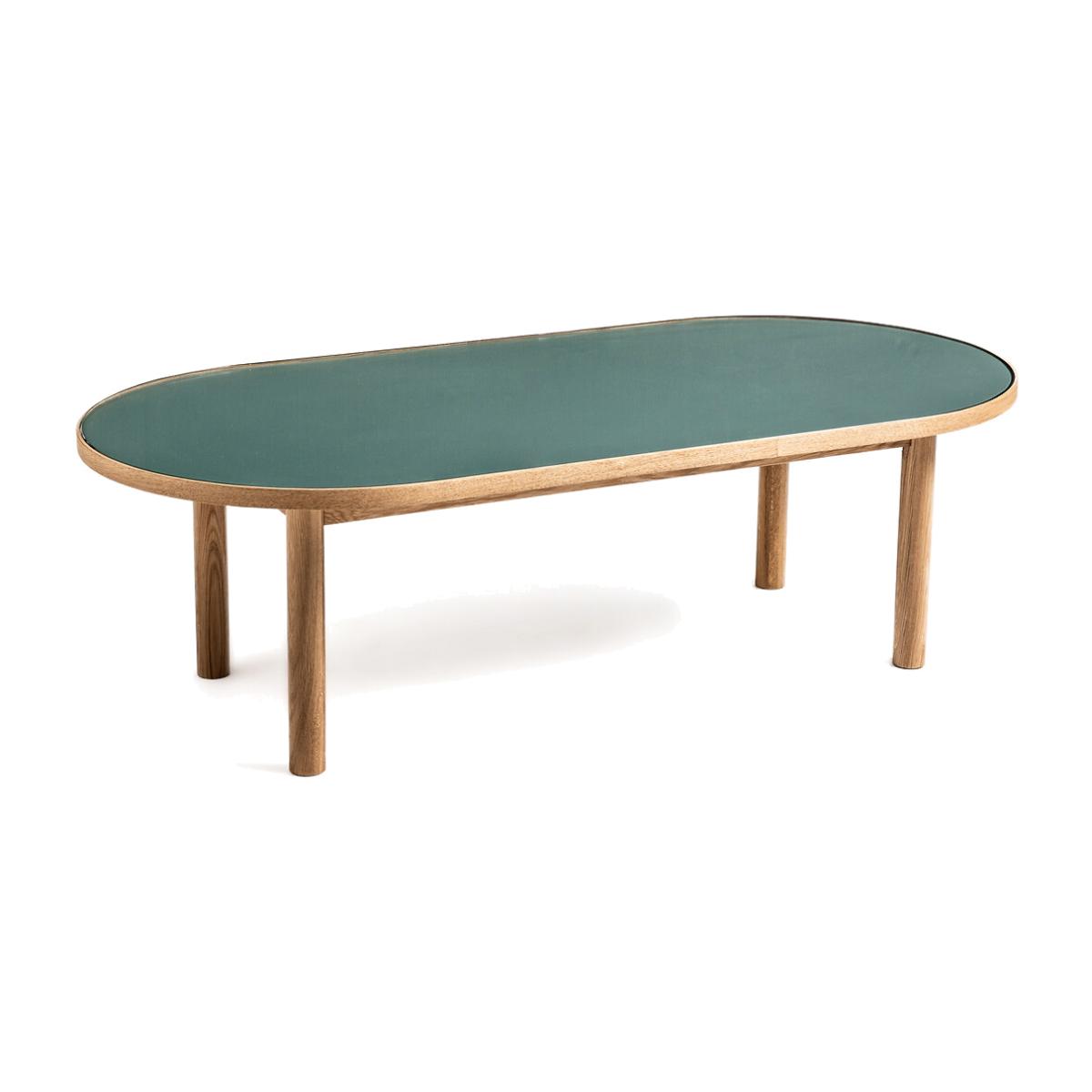 The oak and glass Evergreen coffee table showcases the perfect combination of blond wood and eucalyptus green top. Product Details • Oblong shape • Solid oak legs, solid oak veneered oak strapping, nitrocellulose varnish finish. • Top in MDF with eucalyptus green paint, nitrocellulose varnish finish, covered with transparent tempered glass. Dimensions • Width: 123cm • Height: 37cm • Depth: 60cmDelivery:. Sold for self-assembly. It will be delivered to your door!Note! Please check that all access points are large enough to accommodate your delivery (doors, stairs, lifts).Dimensions and weight of parcel • L137.5 x H16.5 x D72.5 cm, 25.6 kg