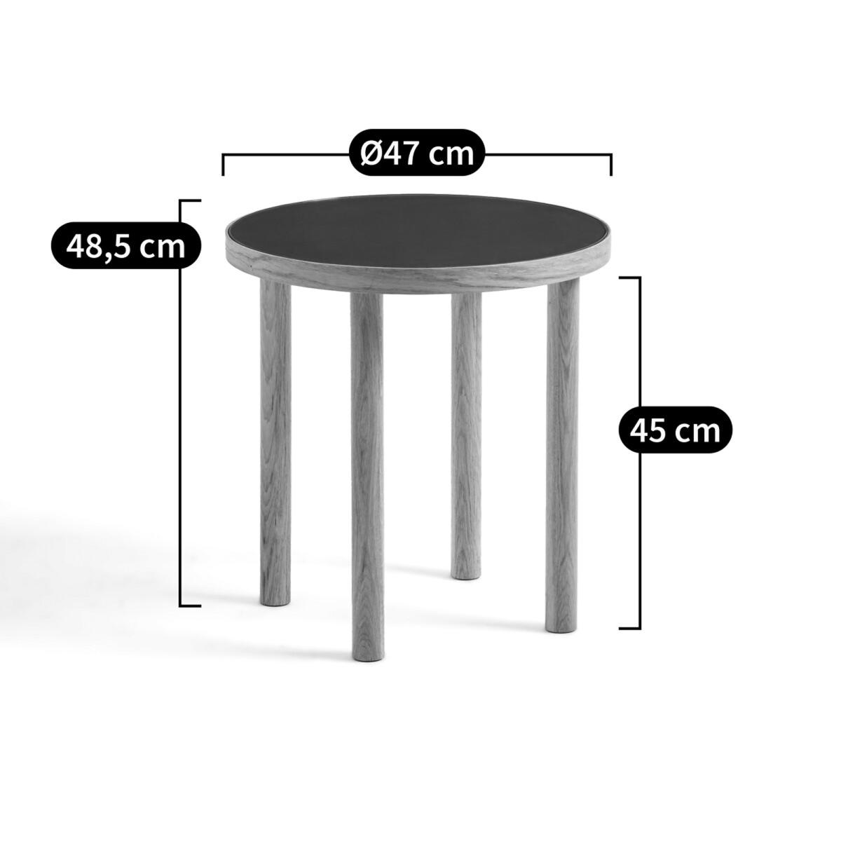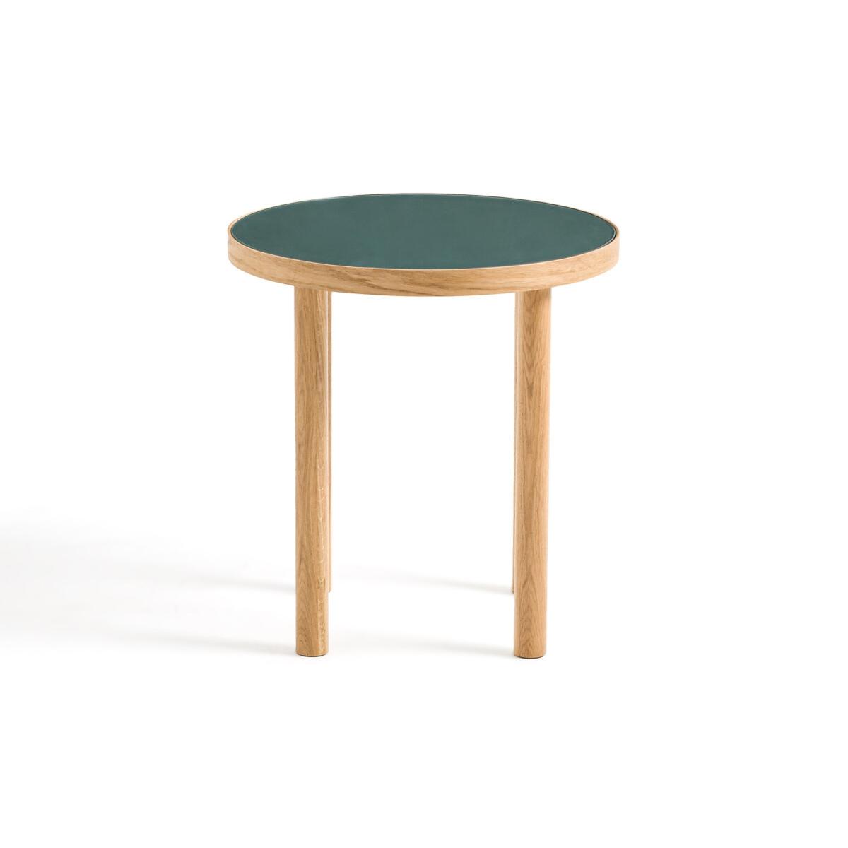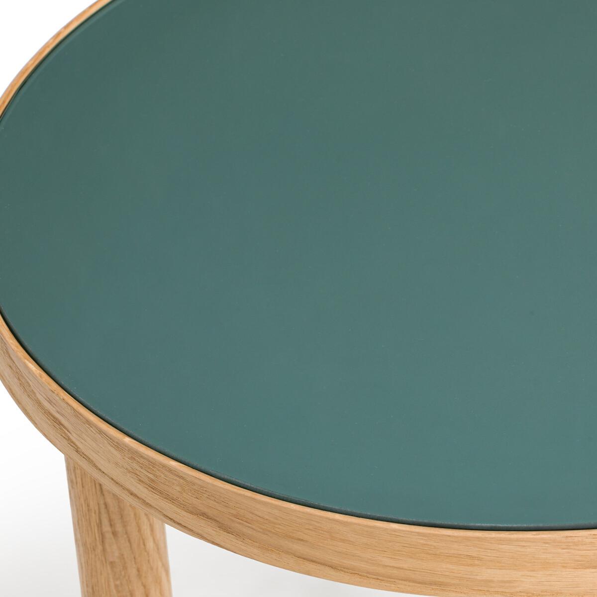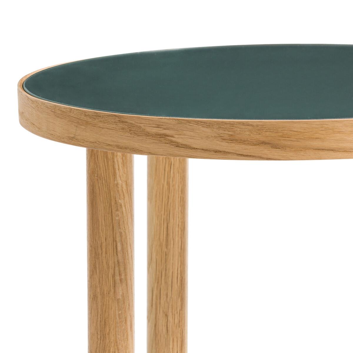 I love this little side table for its clean, understated design that combines natural oak with a rich, dark green top - making it quite versatile. It works well in both contemporary and Scandinavian-inspired interiors, where its simple form can complement more layered textures or act as a subtle statement piece. Practical styling tips include using it to hold a small lamp, a stack of books, or a decorative tray, keeping its surface uncluttered for a fresh look. Its compact size makes it ideal beside a sofa or bed, and its natural materials add warmth to any scheme while offering a sturdy, functional surface.