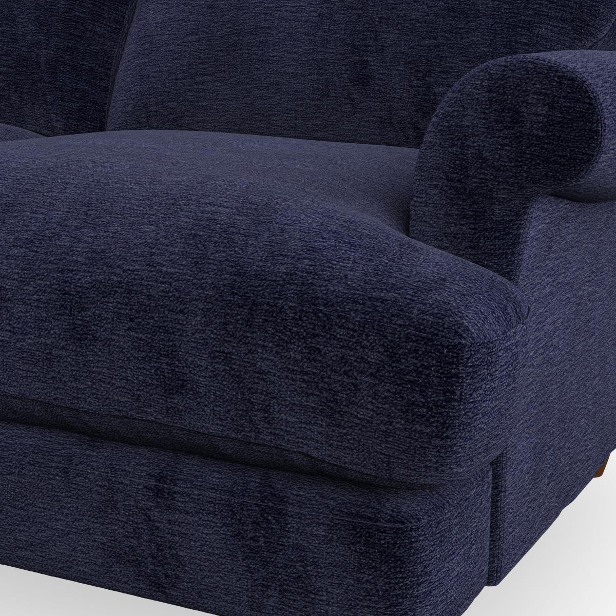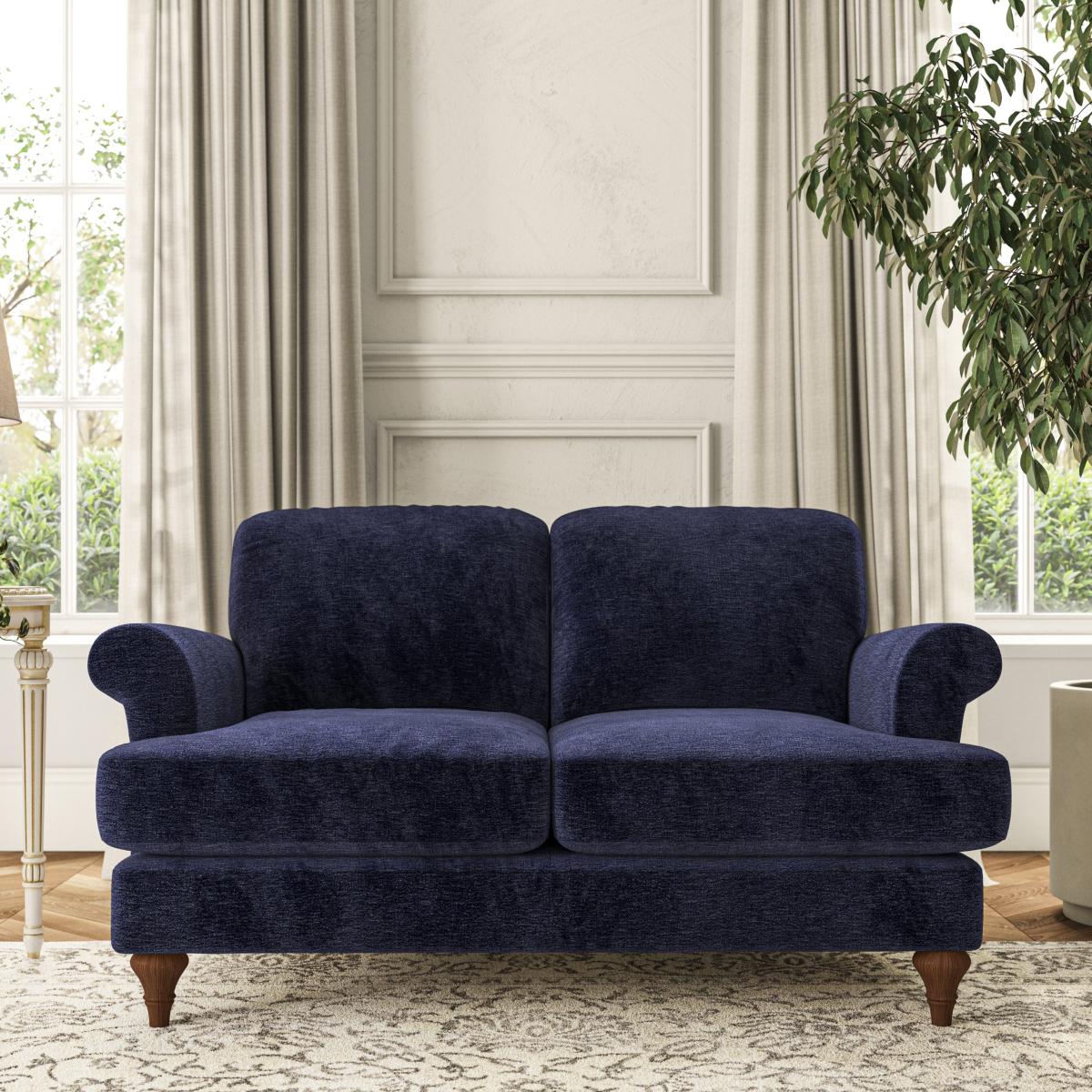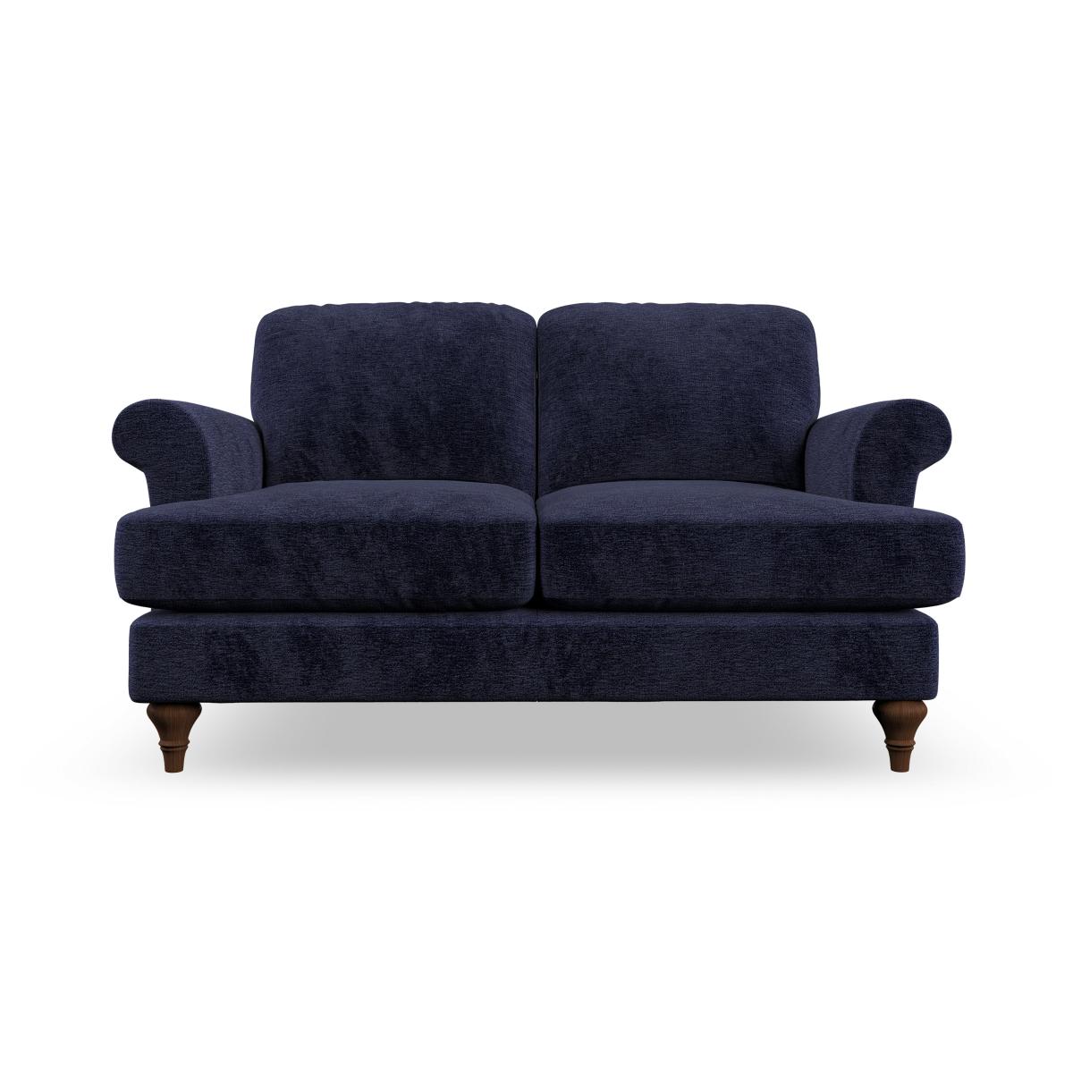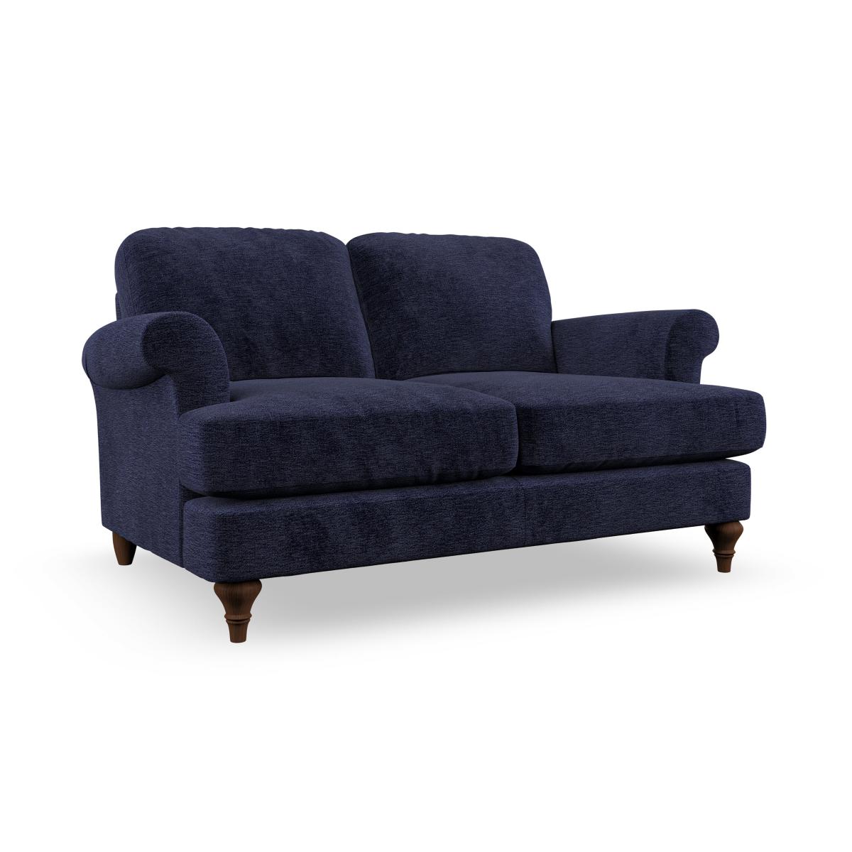 I’m a fan of the Evie two-seater sofa for its compact scale and plush chenille upholstery - it brings just the right amount of softness without overwhelming a room. The rolled arms and turned wooden feet give it a subtle nod to classic design while the deep navy shade makes it easy to pair with both muted and bolder palettes. It works well in smaller lounges or as paired seating in a master bedroom, especially when balanced with lighter walls and natural-tone accents. To style it, layer in a couple of patterned cushions for contrast, pop a slimline coffee table in front and tuck a textured rug beneath to define the seating area. A floor lamp or pendant hung slightly off-centre will complete the look without cluttering the space.