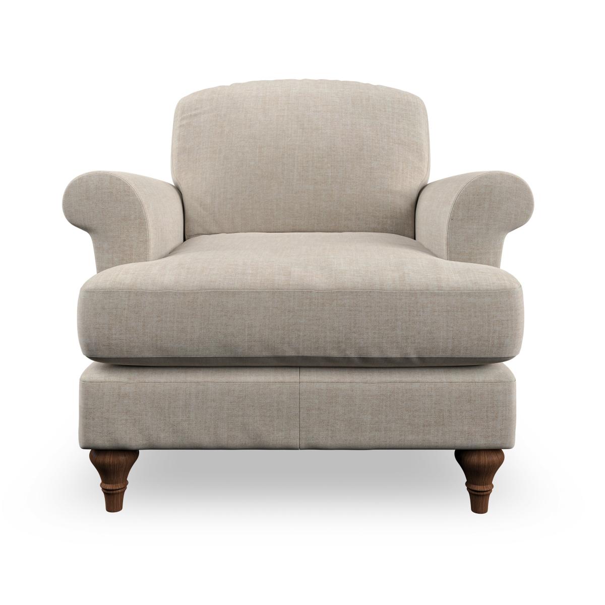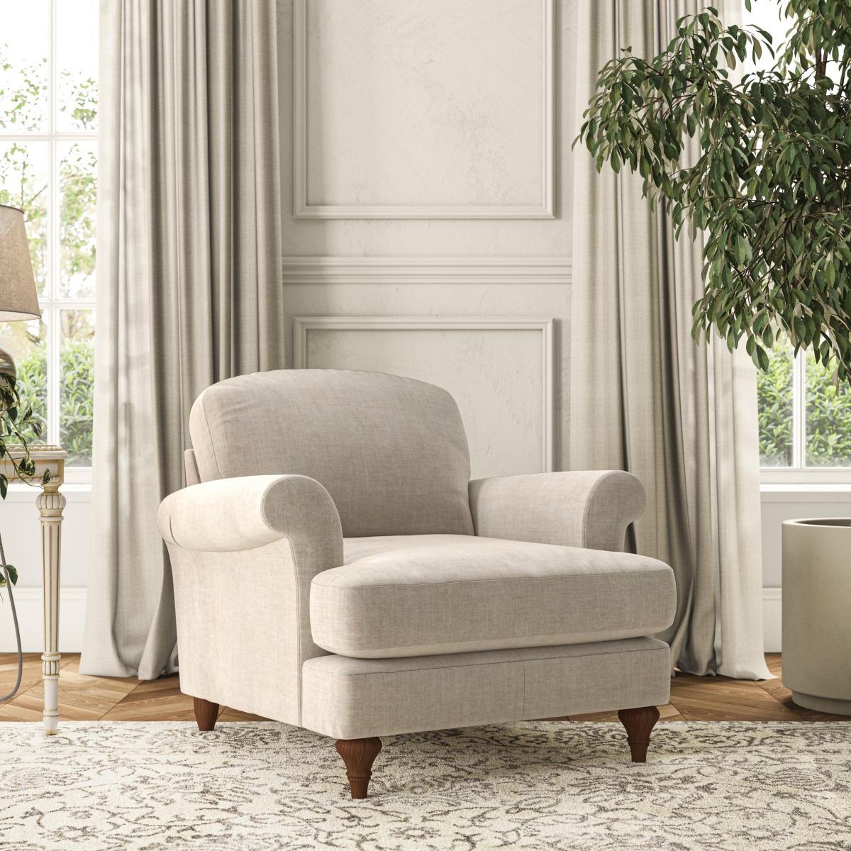 I’m a big fan of the Evie chair for its clean, rolled‐arm profile and turned wooden legs - it feels both tailored and welcoming. The soft, neutral upholstery makes it a versatile choice for traditional, Scandi or modern country schemes, while its generous seat invites you to linger. For styling, tuck a patterned linen cushion into the corner and drape a chunky knit throw over one arm for texture. Position it beside a slim-legged side table or a sculptural floor lamp so it becomes a cosy reading nook, and layer in a potted plant or botanical print to complete the look.
