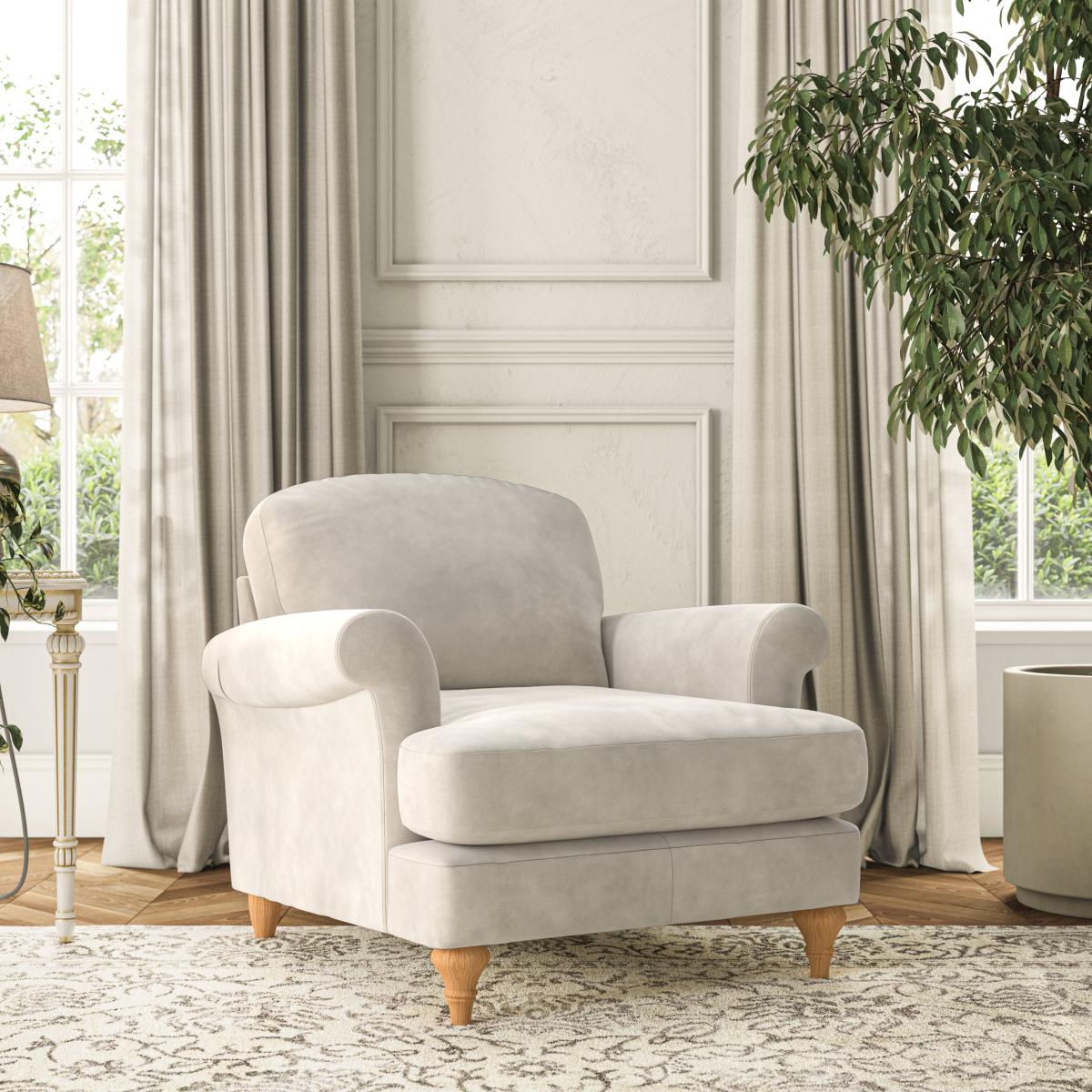 I’m a big fan of the Evie chair for its clean lines and gently rolled arms - it feels both structured and welcoming. The neutral upholstery works brilliantly in Scandi-inspired schemes or alongside richer paint colours in a cosy living room, and its solid wood feet add a subtle natural touch. To style it, pair with a chunky knit throw over one arm and a small lumbar cushion in a contrasting hue. Position it next to a slender side table and floor lamp to create a handy reading nook, or use it as a standalone accent in a hallway or bedroom corner.