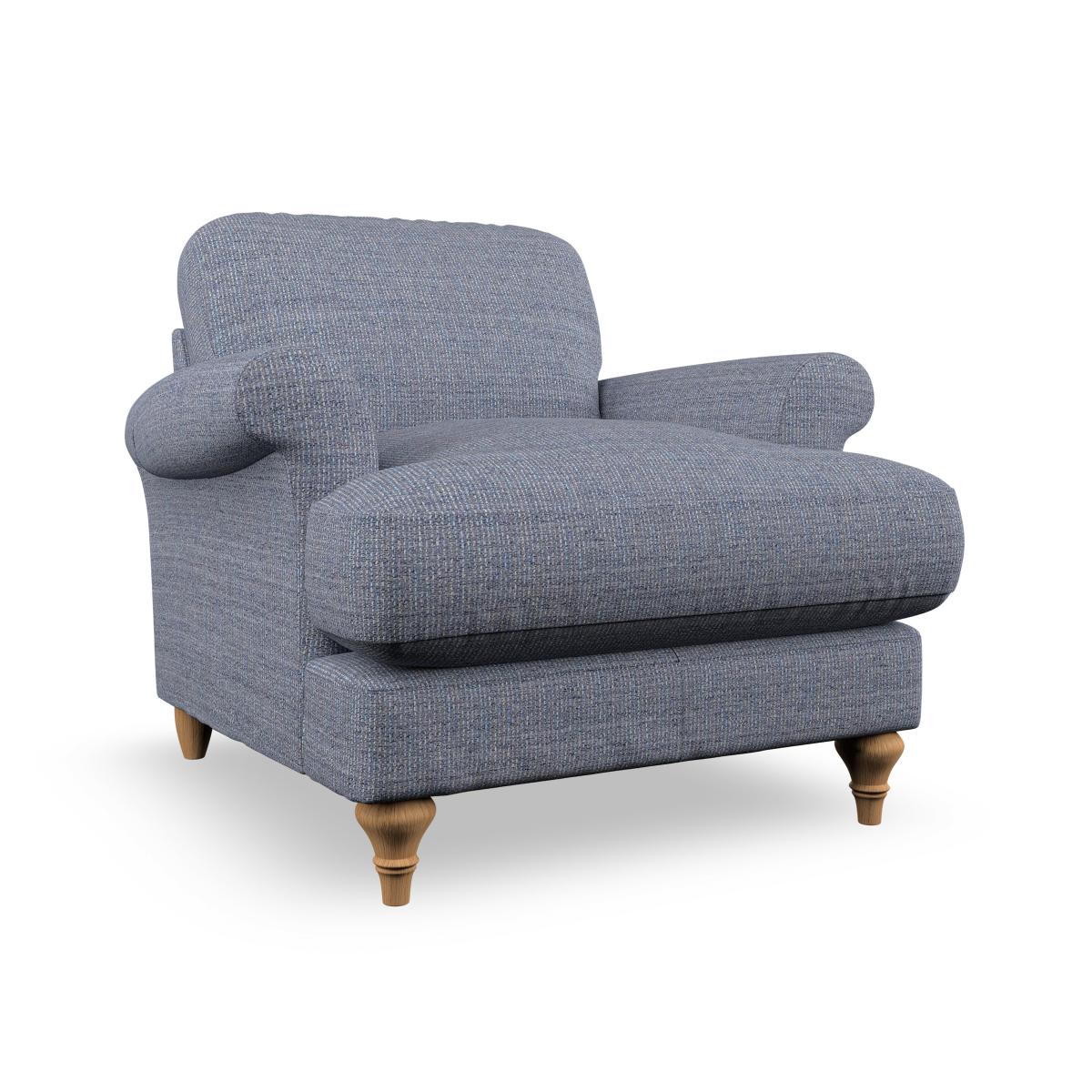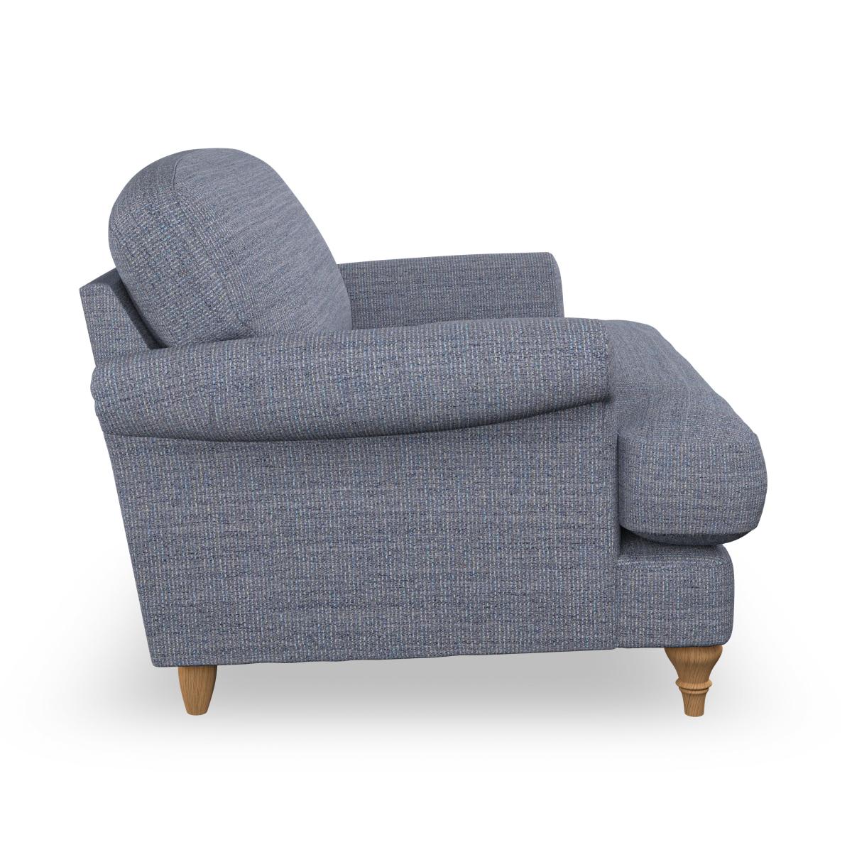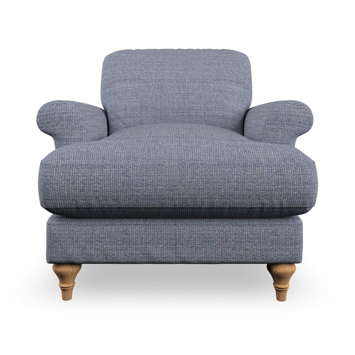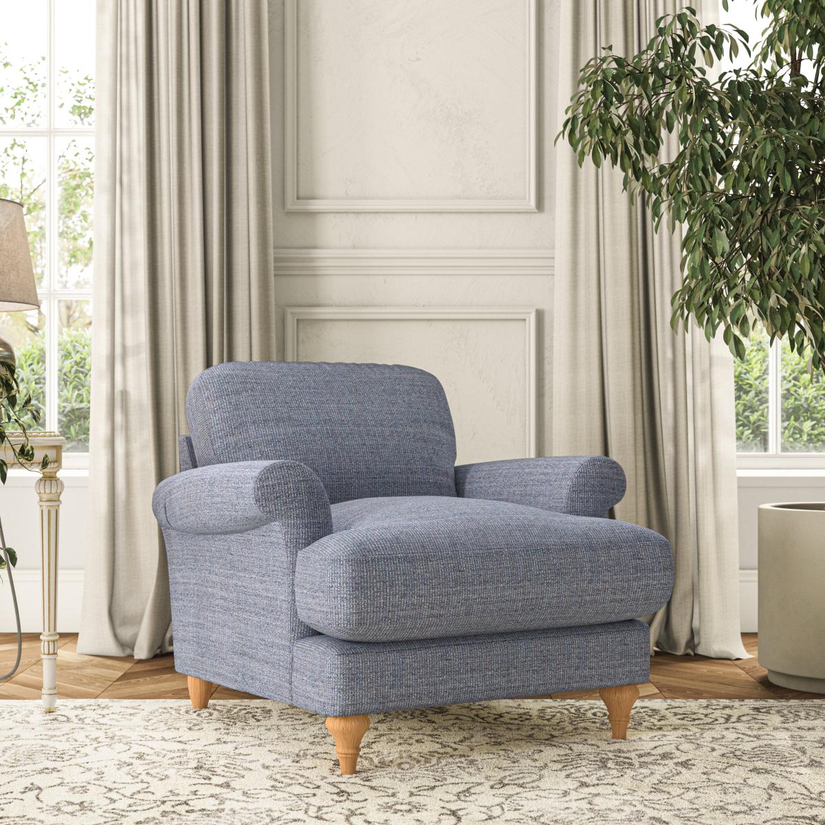 I’m a big fan of the Evie chair for its generous proportions and gently rolled arms - it instantly feels both substantial and inviting. The textured blue fabric sits comfortably in modern-classic, coastal or Scandi-inspired schemes, while its turned wooden feet add just enough traditional detail to stop it feeling too minimal. To style it, tuck in a slim lumbar cushion in a contrasting hue (mustard or terracotta work well) and drape a knitted throw over one arm. Place it next to a slim metal-framed side table or a basket of magazines, then anchor the spot with a low-pile rug and a potted plant to soften the look and make it feel lived-in.