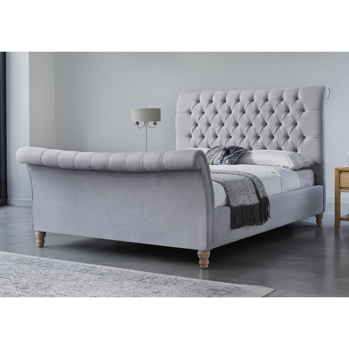 Transform your bedroom into a haven of timeless elegance and classic comfort. Made to order, the Evie collection of beautifully upholstered bedroom furniture includes an accent chair, a bench, a seating cube and a gorgeous sleigh-style bedframe. All pieces are handcrafted and feature traditional details like hand buttoning and turned legs. Choose from a wide selection of soft fabrics including velvet in a beautiful array of colours. The very essence of affordable luxury, the Evie collection is made in Britain and exclusively available at Furniture Village. Headboard and Footboard each come as one single piece. Wonderfully luxurious – and surprisingly affordable – the Evie bedframe is beautifully handcrafted here in Britain. Made to order, this classic sleigh-style bedframe features traditional scrolled head and foot ends, both of which are lavishly cushioned and feature rows of neat buttoning that are crafted by hand. This bedframe has a sprung slatted base that’s suitable for any standard mattress. Exclusively available at Furniture Village, the Evie bedframe is part of the Evie range of bespoke upholstered bedroom furniture which also includes an accent chair, a seating cube and a bench. Top Tip. To keep your fabric bedframe looking good, use a soft brush or vacuum with the curtain attachment weekly. Ideally clean professionally annually. Some fabrics can show wear on areas of more use or in direct sunlight. Mattress available separately.
