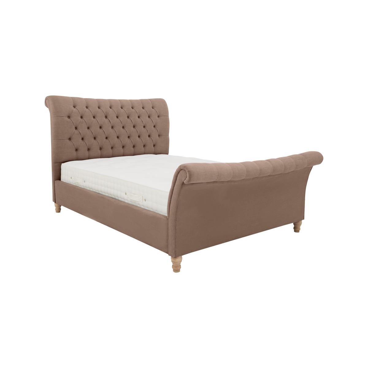 Transform your bedroom into a haven of timeless elegance and classic comfort. Made to order, the Evie collection of beautifully upholstered bedroom furniture includes an accent chair, a bench, a seating cube and a gorgeous sleigh-style bedframe. All pieces are handcrafted and feature traditional details like hand buttoning and turned legs. Choose from a wide selection of soft fabrics including velvet in a beautiful array of colours. The very essence of affordable luxury, the Evie collection is made in Britain and exclusively available at Furniture Village. Headboard and Footboard each come as one single piece. Wonderfully luxurious – and surprisingly affordable – the Evie bedframe is beautifully handcrafted here in Britain. Made to order, this classic sleigh-style bedframe features traditional scrolled head and foot ends, both of which are lavishly cushioned and feature rows of neat buttoning that are crafted by hand. This bedframe has a sprung slatted base that’s suitable for any standard mattress. Exclusively available at Furniture Village, the Evie bedframe is part of the Evie range of bespoke upholstered bedroom furniture which also includes an accent chair, a seating cube and a bench. Top Tip. To keep your fabric bedframe looking good, use a soft brush or vacuum with the curtain attachment weekly. Ideally clean professionally annually. Some fabrics can show wear on areas of more use or in direct sunlight. Mattress available separately.