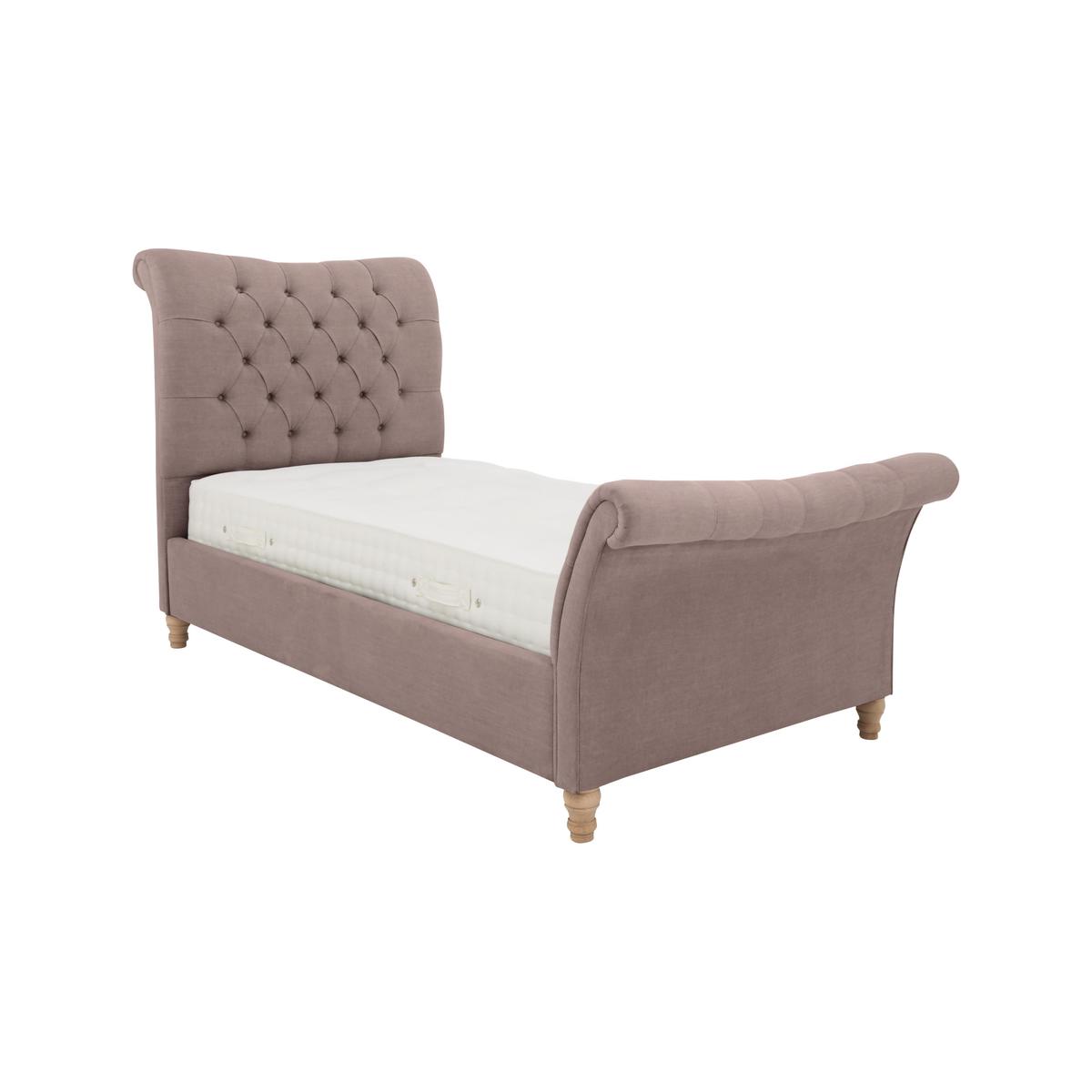 Headboard and Footboard each come as one single piece. Wonderfully luxurious – and surprisingly affordable – the Evie bedframe is beautifully handcrafted here in Britain. Made to order, this classic sleigh-style bedframe features traditional scrolled head and foot ends, both of which are lavishly cushioned and feature rows of neat buttoning that are crafted by hand. Choose from a wide selection of soft and textured fabrics in a variety of colours for the neat upholstery – please call us on 0800 804 8879 to learn about all options. This bedframe has a sprung slatted base that’s suitable for any standard mattress. Exclusively available at Furniture Village, the Evie bedframe is part of the Evie range of bespoke upholstered bedroom furniture which also includes an accent chair, a seating cube and a bench. Top Tip: To keep your fabric bedframe looking good, use a soft brush or vacuum with the curtain attachment weekly. Ideally clean professionally annually. Some fabrics can show wear on areas of more use or in direct sunlight. Mattress available separately