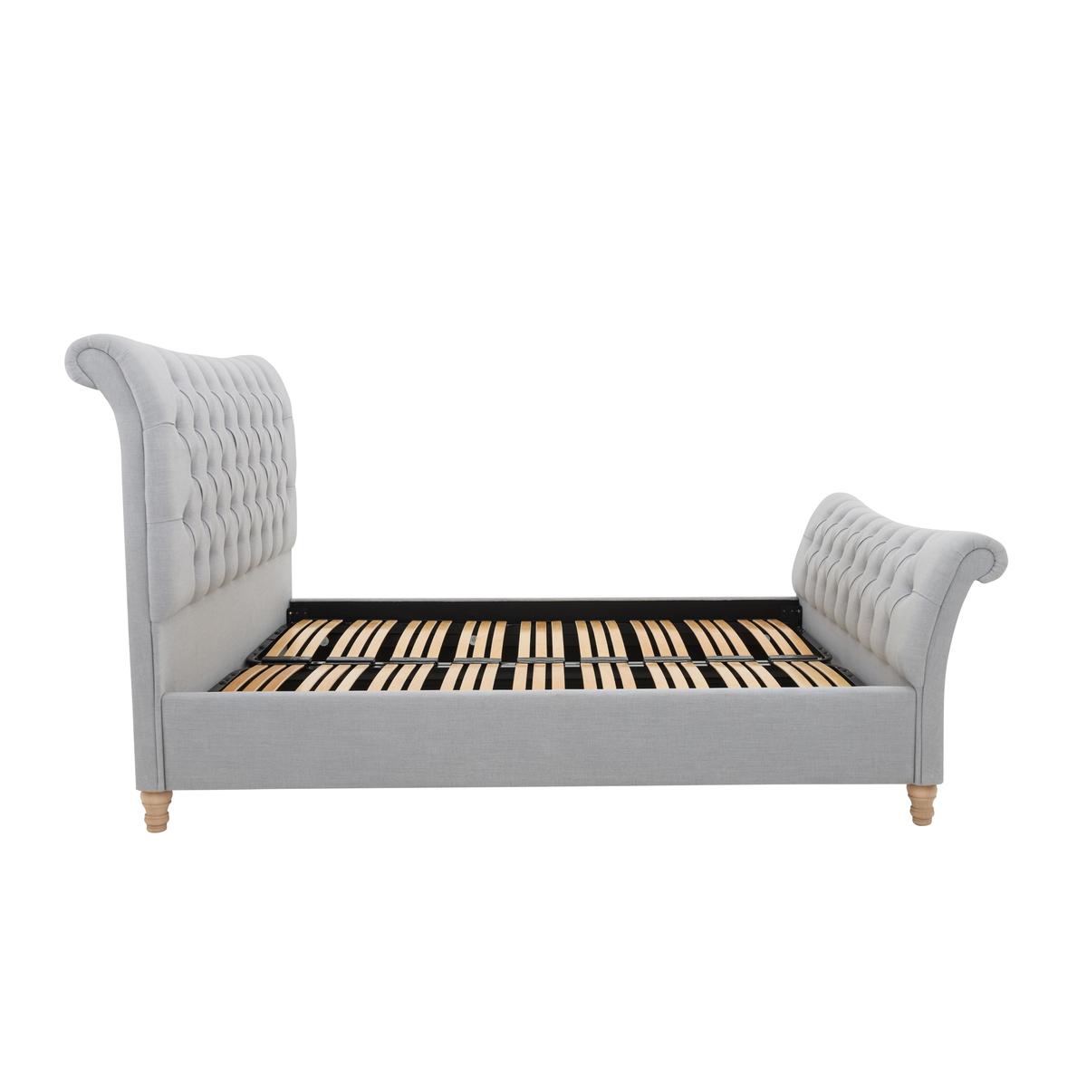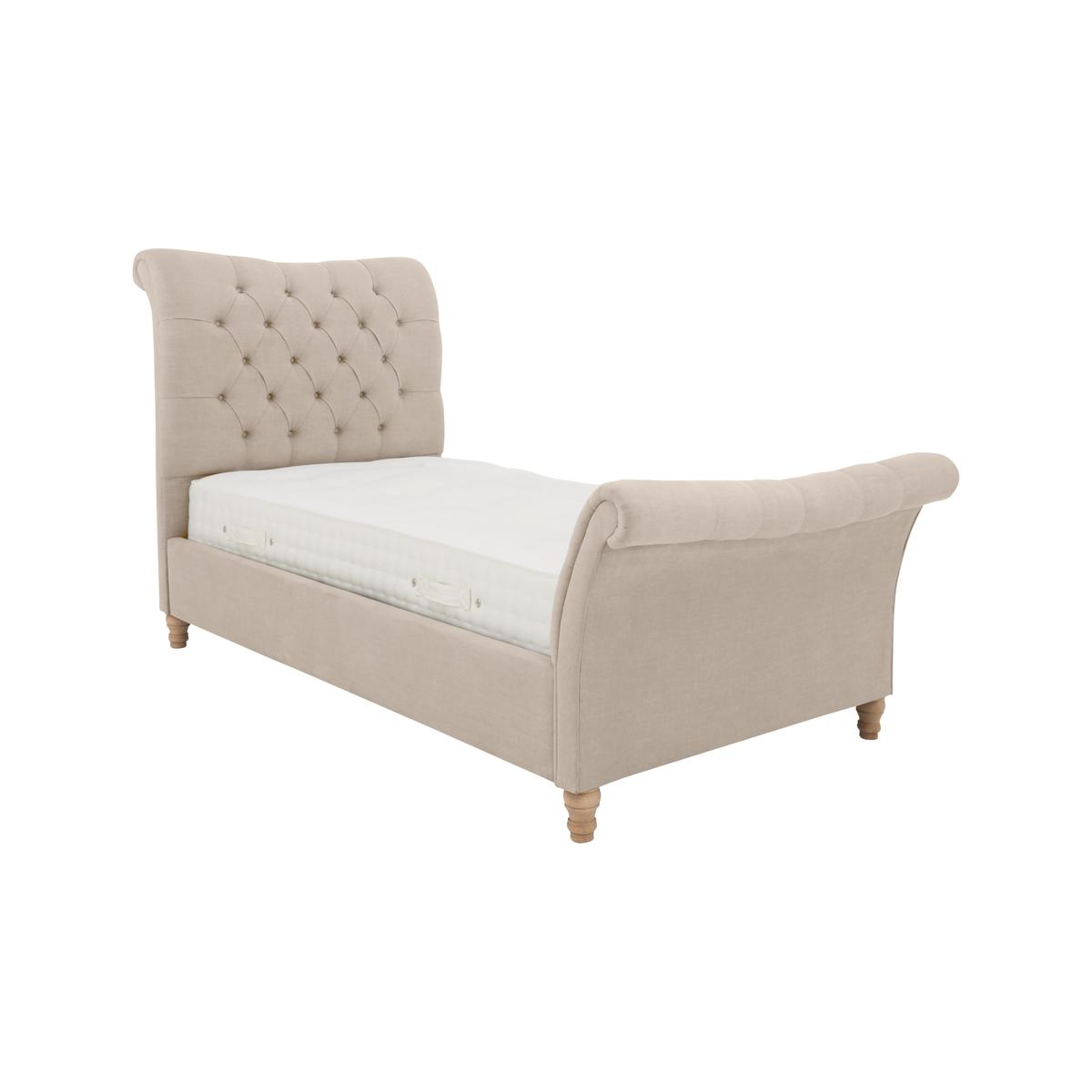 Transform your bedroom into a haven of timeless elegance and classic comfort. Made to order, the Evie collection of beautifully upholstered bedroom furniture includes an accent chair, a bench, a seating cube and a gorgeous sleigh-style bedframe. All pieces are handcrafted and feature traditional details like hand buttoning and turned legs. Choose from a wide selection of soft fabrics including velvet in a beautiful array of colours. The very essence of affordable luxury, the Evie collection is made in Britain and exclusively available at Furniture Village. Headboard and Footboard each come as one single piece. Wonderfully luxurious – and surprisingly affordable – the Evie bedframe is beautifully handcrafted here in Britain. Made to order, this classic sleigh-style bedframe features traditional scrolled head and foot ends, both of which are lavishly cushioned and feature rows of neat buttoning that are crafted by hand. This bedframe has a sprung slatted base that’s suitable for any standard mattress. Exclusively available at Furniture Village, the Evie bedframe is part of the Evie range of bespoke upholstered bedroom furniture which also includes an accent chair, a seating cube and a bench. Top Tip. To keep your fabric bedframe looking good, use a soft brush or vacuum with the curtain attachment weekly. Ideally clean professionally annually. Some fabrics can show wear on areas of more use or in direct sunlight. Mattress available separately.
