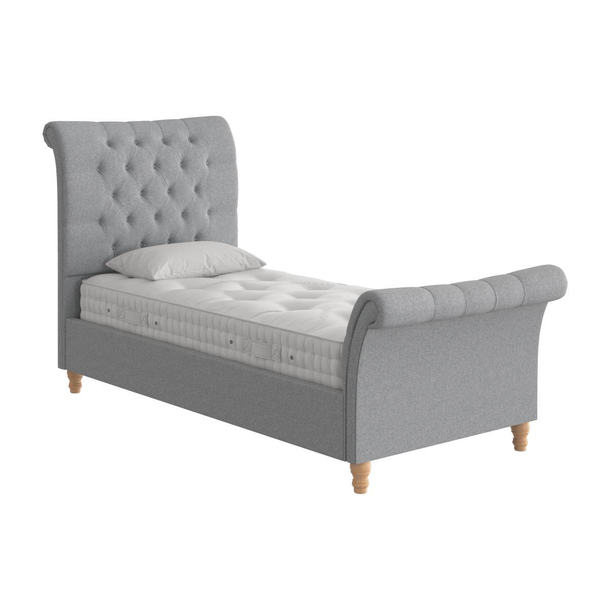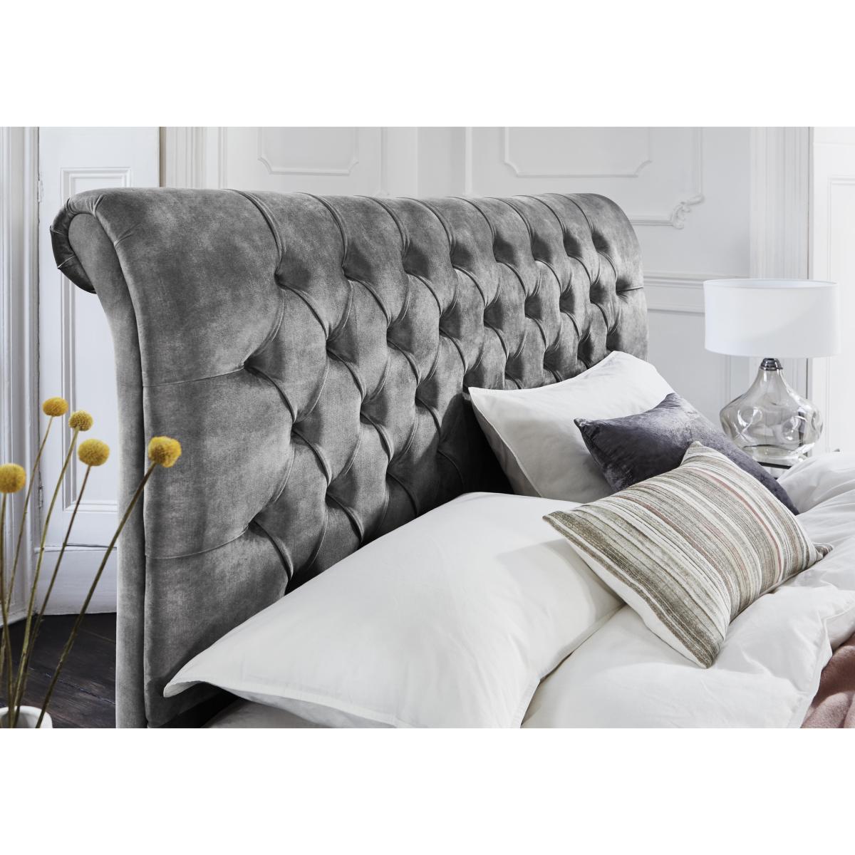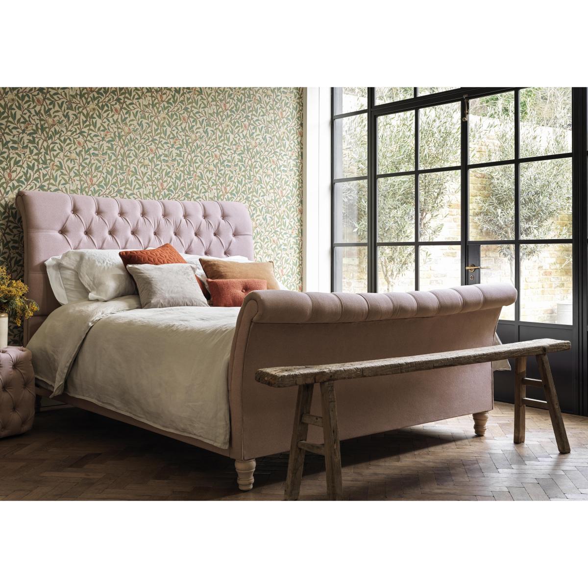 Transform your bedroom into a haven of timeless elegance and classic comfort. Made to order, the Evie collection of beautifully upholstered bedroom furniture includes an accent chair, a bench, a seating cube and a gorgeous sleigh-style bedframe. All pieces are handcrafted and feature traditional details like hand buttoning and turned legs. Choose from a wide selection of soft fabrics including velvet in a beautiful array of colours. The very essence of affordable luxury, the Evie collection is made in Britain and exclusively available at Furniture Village. Headboard and Footboard each come as one single piece. Wonderfully luxurious – and surprisingly affordable – the Evie bedframe is beautifully handcrafted here in Britain. Made to order, this classic sleigh-style bedframe features traditional scrolled head and foot ends, both of which are lavishly cushioned and feature rows of neat buttoning that are crafted by hand. This bedframe has a sprung slatted base that’s suitable for any standard mattress. Exclusively available at Furniture Village, the Evie bedframe is part of the Evie range of bespoke upholstered bedroom furniture which also includes an accent chair, a seating cube and a bench. Top Tip. To keep your fabric bedframe looking good, use a soft brush or vacuum with the curtain attachment weekly. Ideally clean professionally annually. Some fabrics can show wear on areas of more use or in direct sunlight. Mattress available separately.