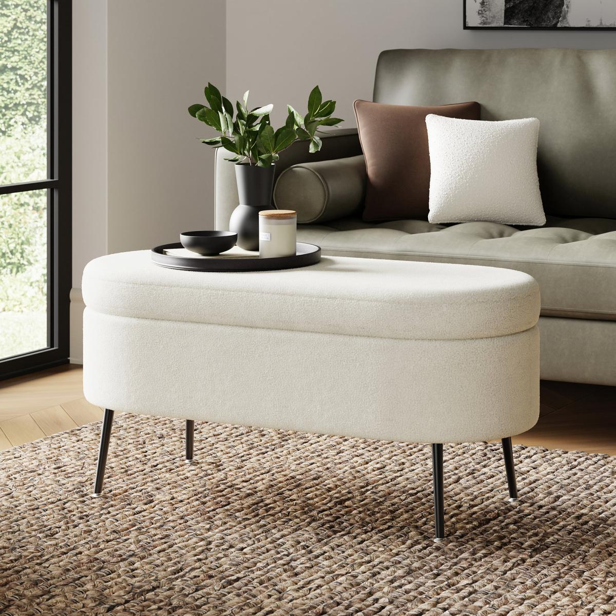Dunelm Exclusive - Designed and Developed by Dunelm* 2-seater space* Evie range* Convenient storage* Oval shape* Boucle fabric* Black painted steel legs* Available in Ivory, Grey or Black colour options Whether you’re relaxing after a long day at work or entertaining guests, the Evie Storage Ottoman is the ultimate choice for those seeking both style and practicality in their furniture. Designed to offer convenience at its finest, it provides ample storage space hidden within its frame so you can easily keep your essentials close at hand without compromising on the aesthetic appeal. With a soft curved oval shape and upholstered in sumptuous boucle fabric, this two-seater space seamlessly blends convenience with elegance with plush cushioning that ensures maximum relaxation, and chic black painted steel legs add a touch of glamour.