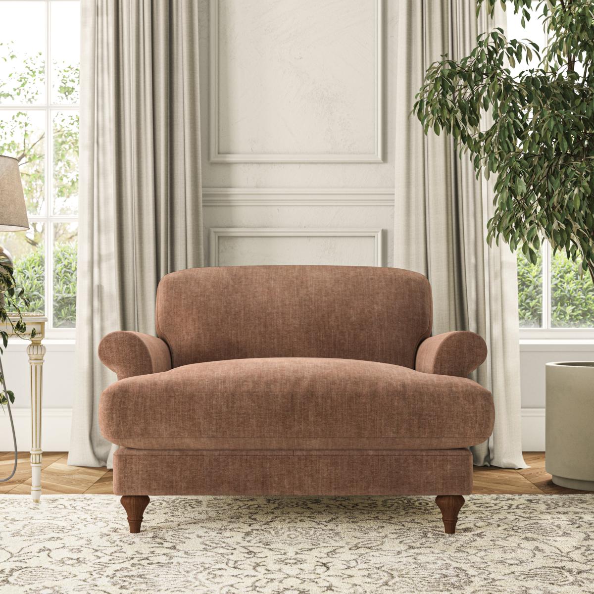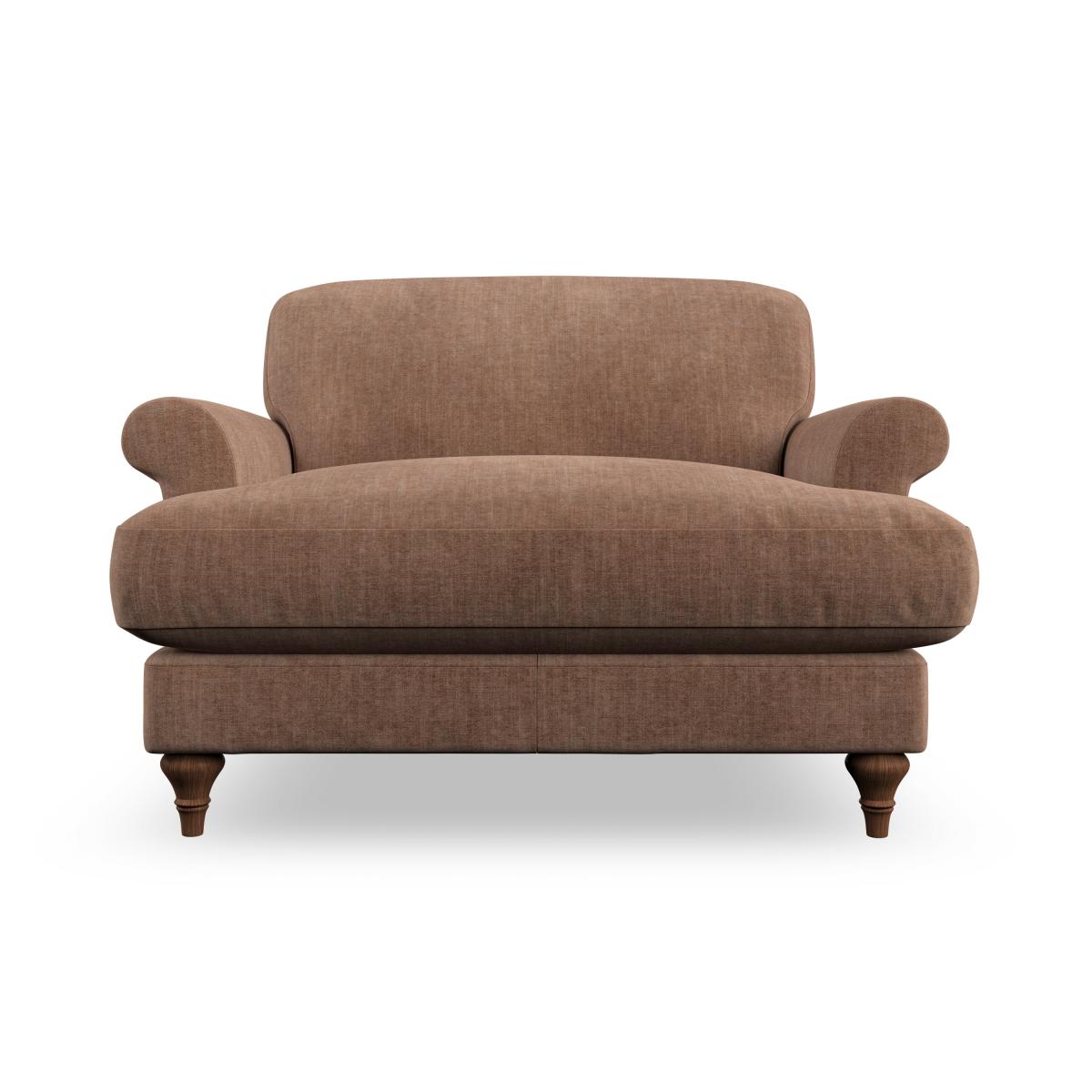* Elegant, classic design* Scroll Arms* Lugged seat cushion* Serpentine seat springs* Choose your orientation, support, fabric and leg colour The Evie Snuggle Chair is the perfect cosy addition to any room, offering a compact yet elegant design that’s ideal for relaxing. With slender scroll arms and a snug lugged seat cushion, this chair provides both style and comfort in a smaller package. The fibre-filled back cushion delivers soft support, making it an inviting spot for one or a cosy retreat for two. Customise it to suit your space with your choice of fabric type, colour, cushion filling, and leg finish.