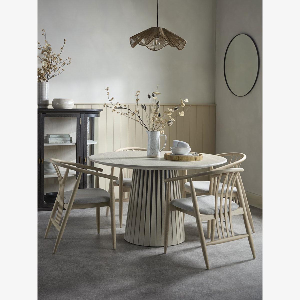 I love this table for its clean, contemporary lines and versatile design, making it a great centrepiece for both modern and Scandi-inspired interiors. Its understated elegance pairs well with a range of colours and textures, from soft fabrics to textured ceramics. Practical styling tips include keeping the surface clear for everyday meals, while adding a centrepiece like a simple vase or tray can create seasonal interest. The base’s unique fluted detail works well with minimalist chairs, as seen here, but can also be dressed up with upholstered or woven seating for a more relaxed vibe. It’s ideal for both intimate dinners and larger gatherings, fitting seamlessly into open-plan dining rooms or smaller eat-in spaces.