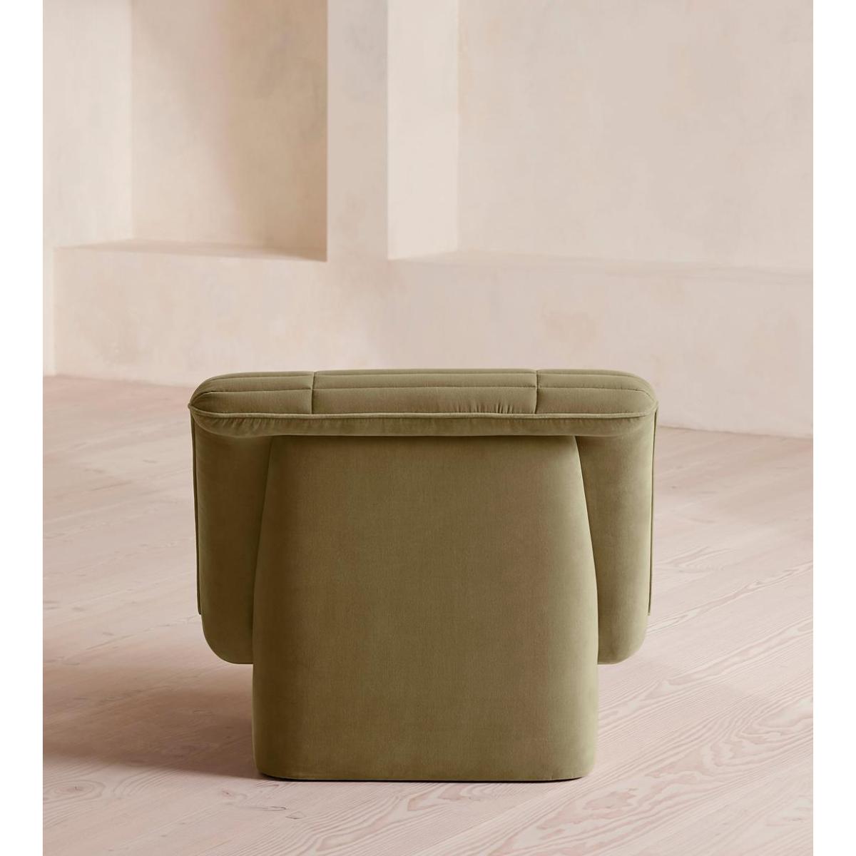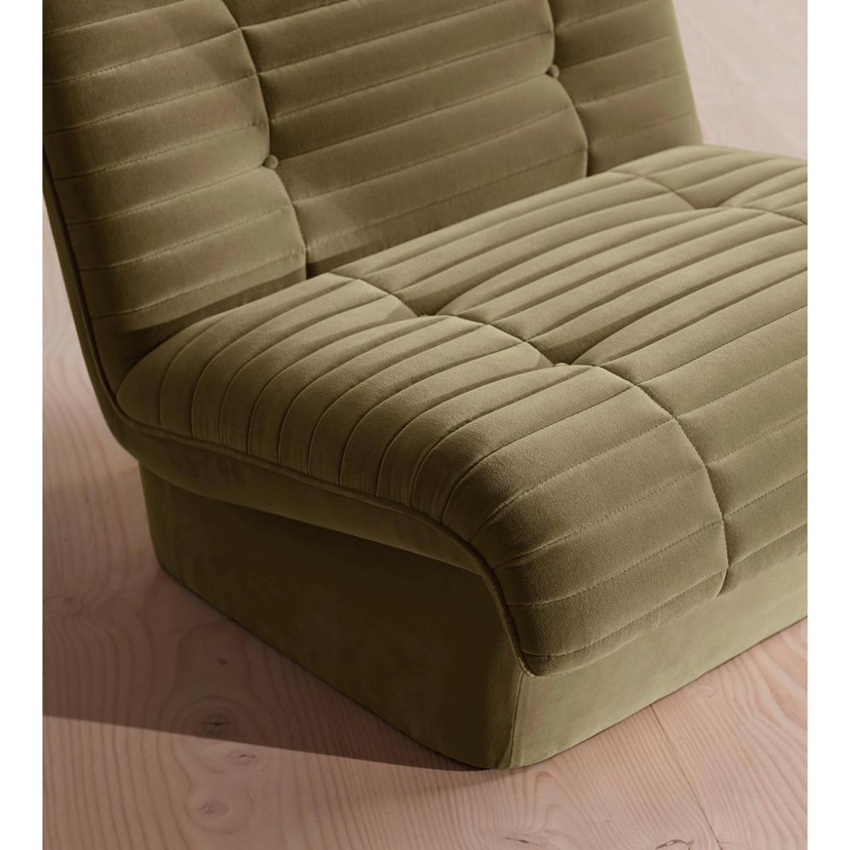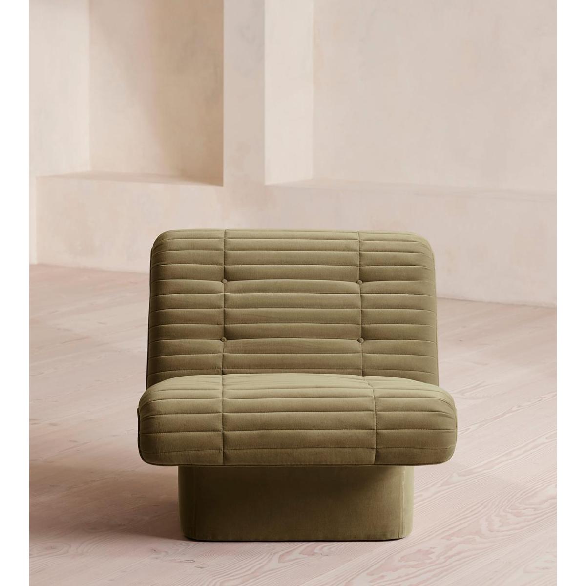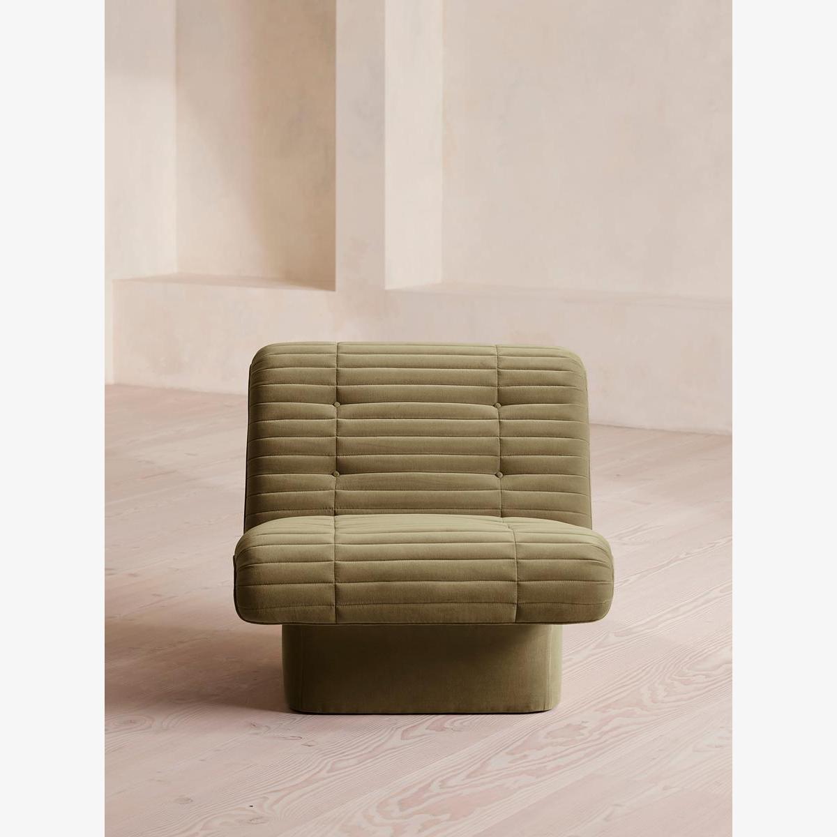 A laid-back, armless silhouette is characterised by ribbed panelling on its upholstery. The Ewan accent armchair takes inspiration from White City House. Fully upholstered in a neutral lichen velvet, it features button detailing across its channelled seat and backrest.