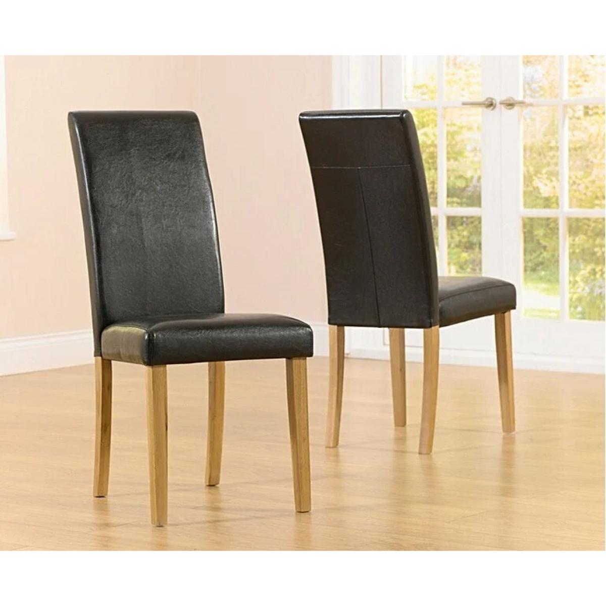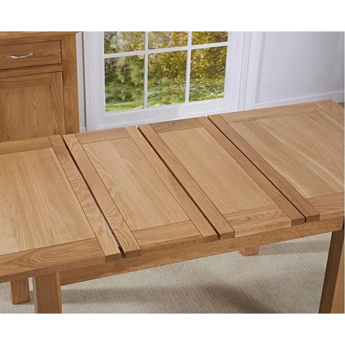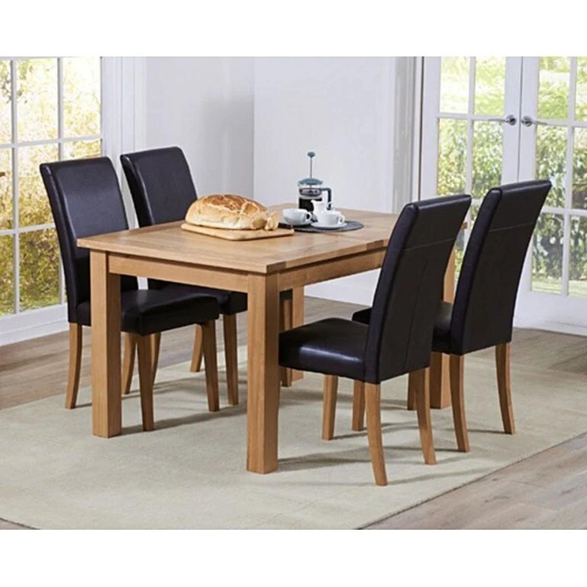 Classical simplicity and functional elegance characterise the Cheadle collection of oak tables. Extending for more space and coming in a range of sizes, this tasteful collection has a table to suit everyone's needs. PLEASE NOTE: This is an ex-display item with SIX BROWN chairs only. All Ex-display items are non-refundable (excluding delivery damage and manufacturing faults). Ex-display items may show signs of standard wear and tear, however any significant marks or damages will be specifically stated below.
