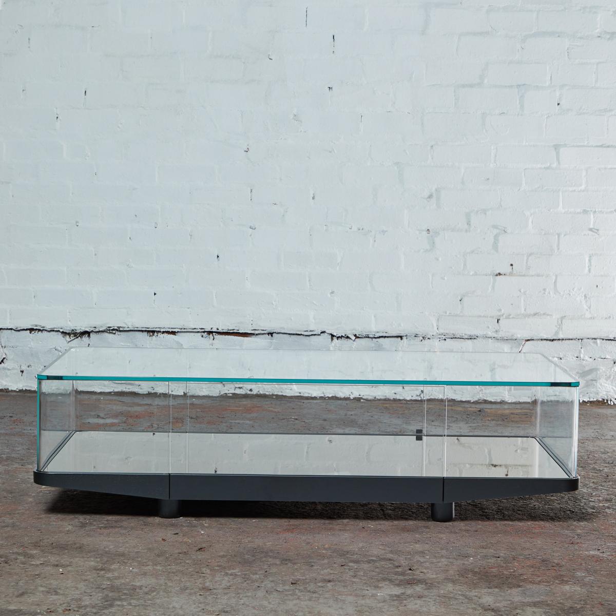 The Collector Table by Edward Barber and Jay Osgerby is an elegant design that allows you to display your most coveted possessions in subtle opulence. With a base crafted from solid, open-pore black lacquered ash, the Collector Table is characterised by its extra-light transparent glass case form. An exclusive edition, the case's base is finished with a bronze mirror, with a drawer on either side to curate and rearrange your personal exhibition. The Collector Table's base also curves up at the edges, to fit the shape of the attached top exactly. Edward Barber and Jay Osgerby founded their studio in 1996; since then, the award-winning pair have been designing architectural and functional pieces from their base in London. Their work is held in the permanent collections of museums around the world, including the V & A Museum and New York's Metropolitan Museum of Art. Please note: This is an ex-display piece and therefore may show signs of wear proportional with use. The utmost effort is made to accurately showcase each intricacy and imperfection, and this piece is sold as seen.