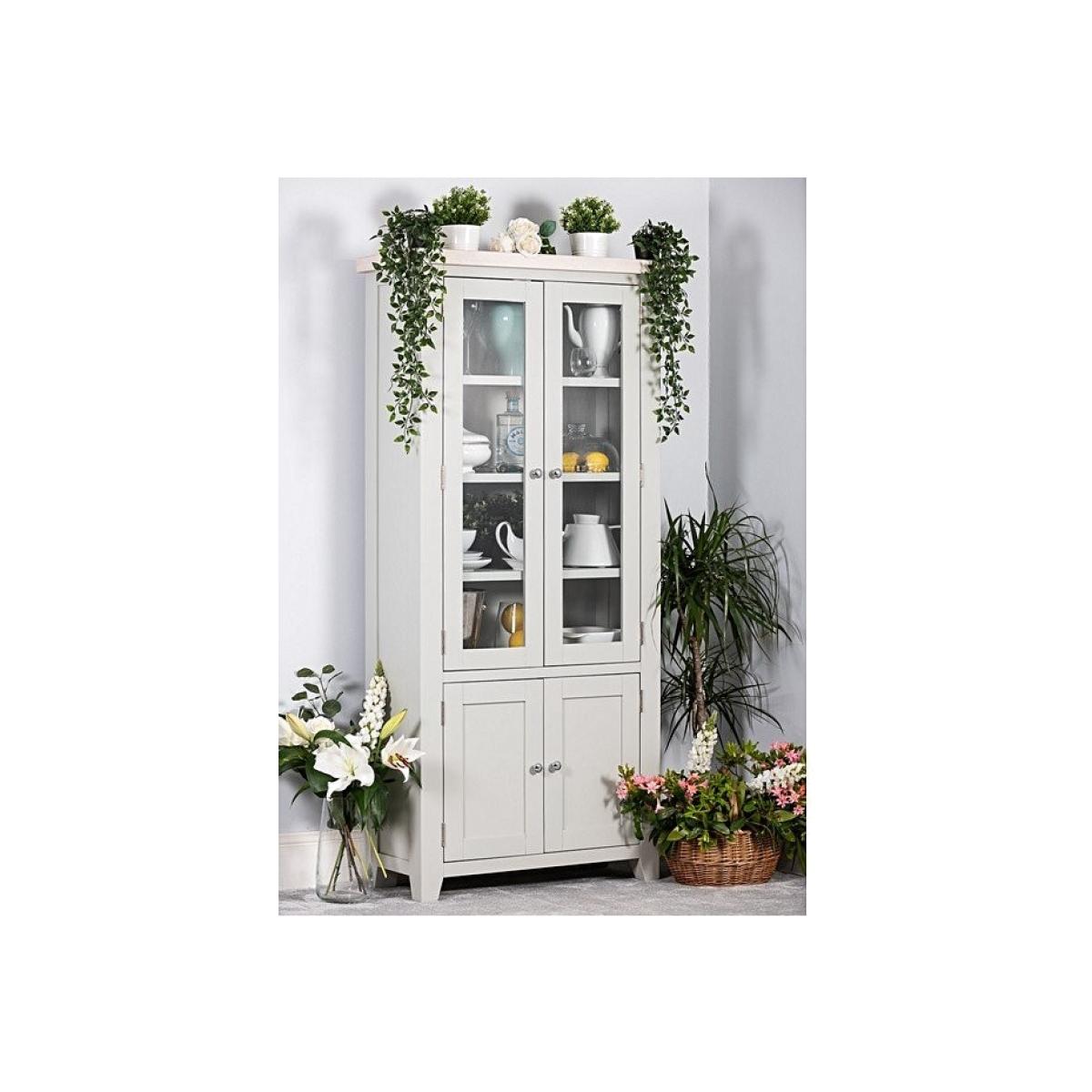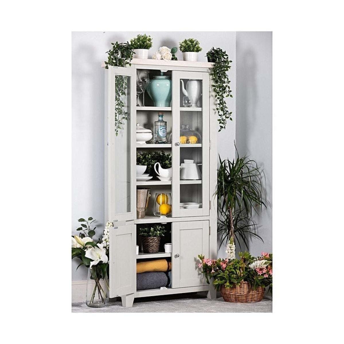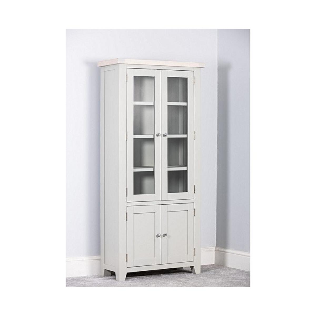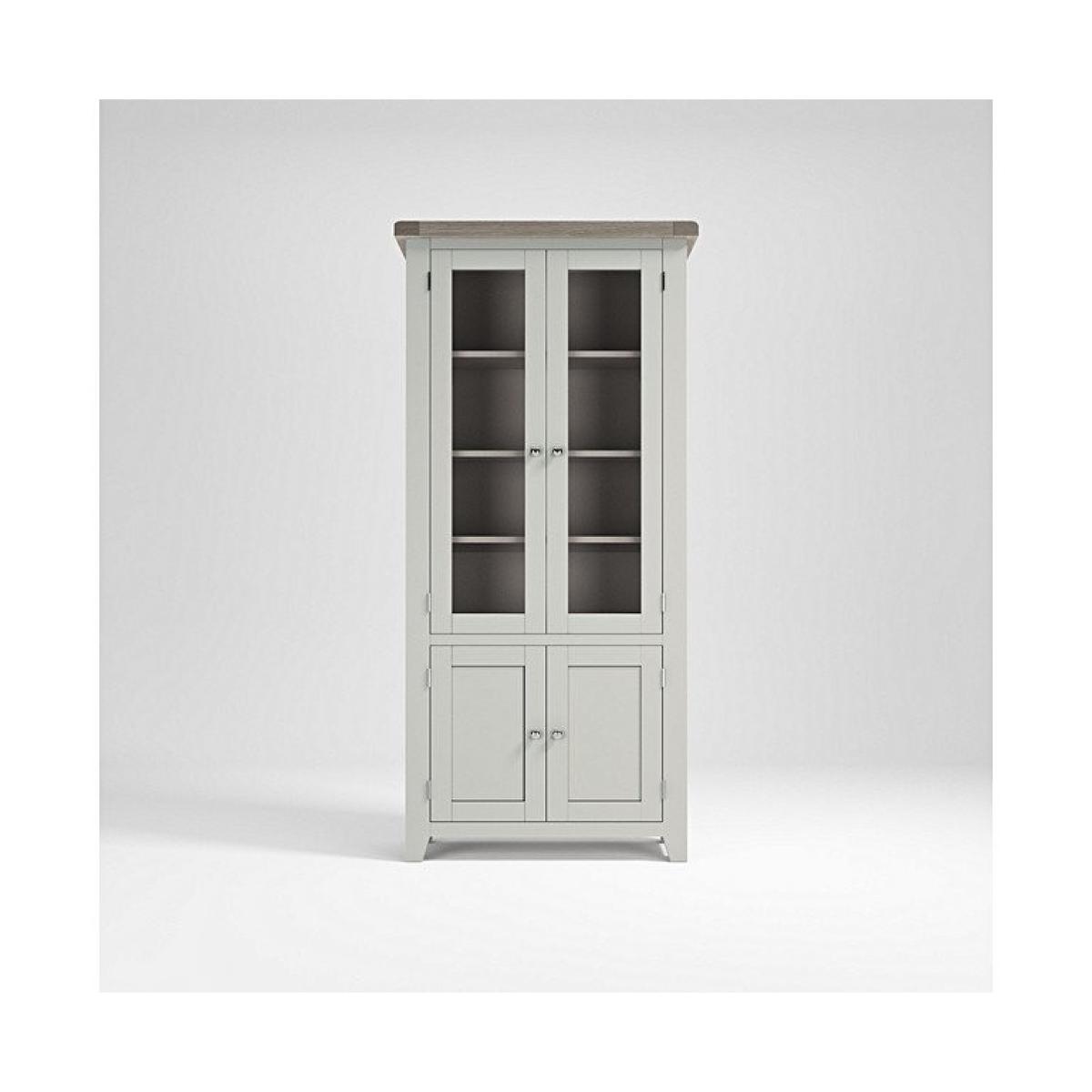 A traditionally styled display cabinet which features two partially glass fronted doors, behind which hide four shelves. All four shelves are on show to display your items and there’s one hidden behind two doors below, perfect for storing anything you don’t want guests to see. In keeping with the rest of the Felix range, this beautiful cabinet is crafted from solid oak, pine and oak veneer and finished with a contemporary grey paint. Traditional styling with plenty of storage space Hidden space for an uncluttered look. High quality solid oak, pine and oak veneer. Fully AssembledPLEAS. E NOTE: This is an ex-display item. All Ex-display items are non-refundable (excluding delivery damage and manufacturing faults).Ex-display items may show signs of standard wear and tear, however any significant marks or damages will be specifically stated below.