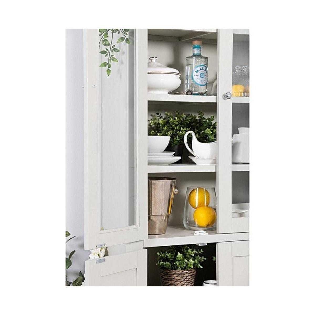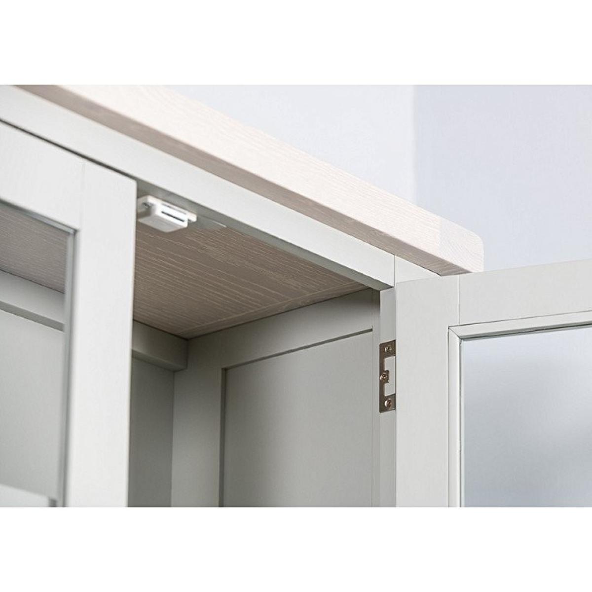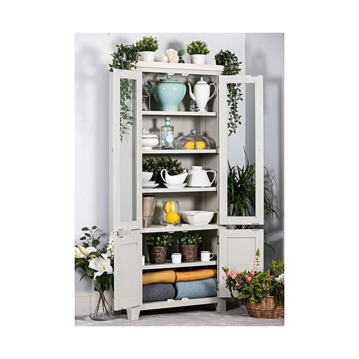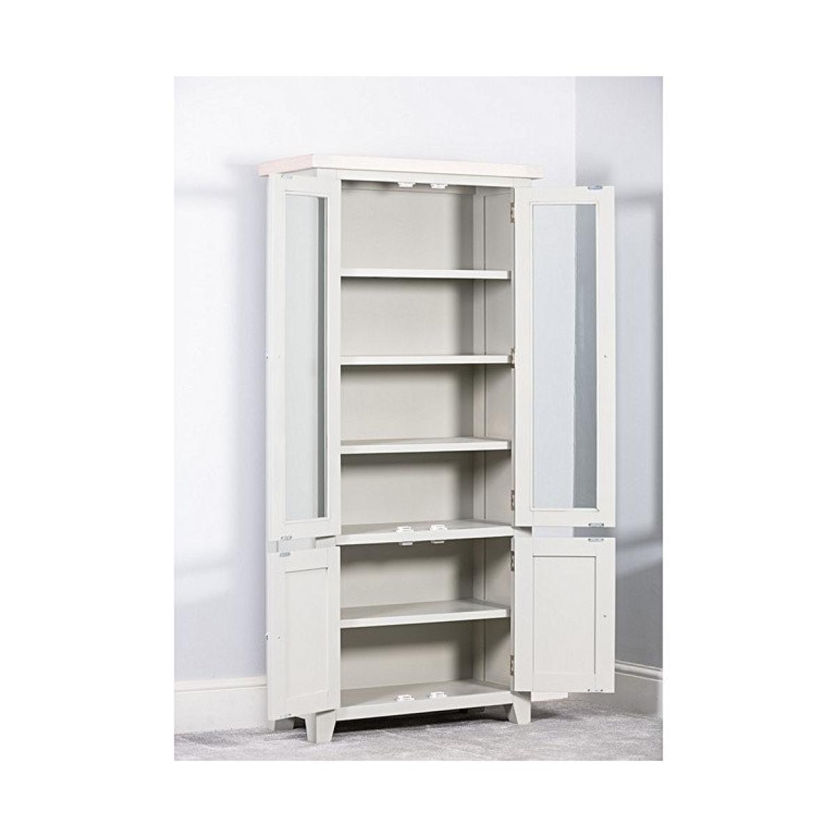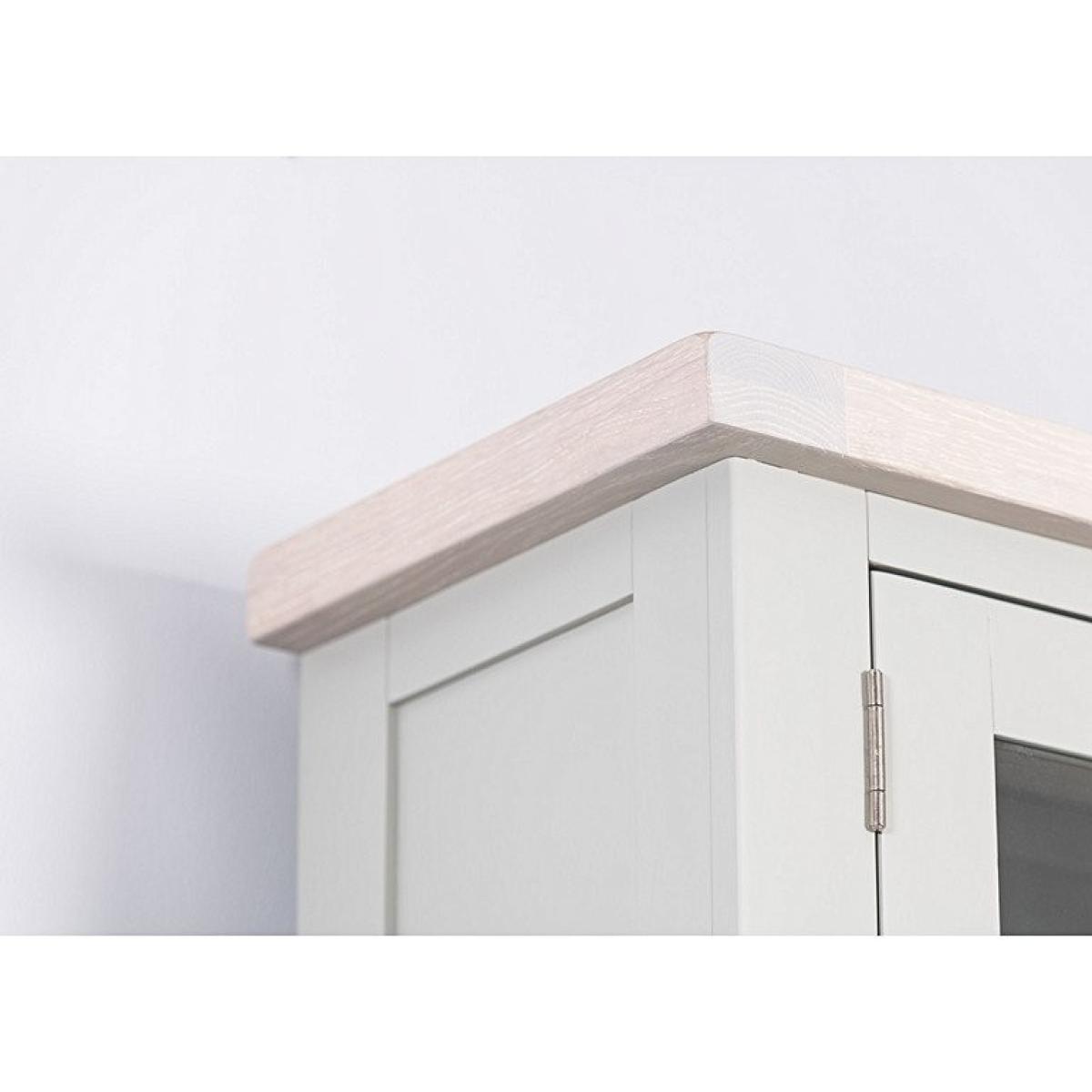 A traditionally styled display cabinet which features two partially glass fronted doors, behind which hide four shelves. All four shelves are on show to display your items and there’s one hidden behind two doors below, perfect for storing anything you don’t want guests to see. In keeping with the rest of the Felix range, this beautiful cabinet is crafted from solid oak, pine and oak veneer and finished with a contemporary grey paint. Traditional styling with plenty of storage space Hidden space for an uncluttered look. High quality solid oak, pine and oak veneer. Fully AssembledPLEAS. E NOTE: This is an ex-display item. All Ex-display items are non-refundable (excluding delivery damage and manufacturing faults).Ex-display items may show signs of standard wear and tear, however any significant marks or damages will be specifically stated below.