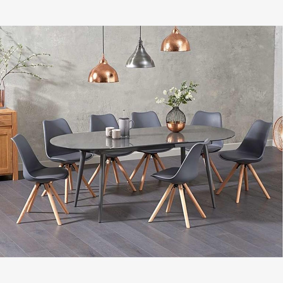 Ex-display Olivia Extending Dark Grey High Gloss Dining Table with 4 DARK GREY Oscar Faux Leather Round Leg Chairs