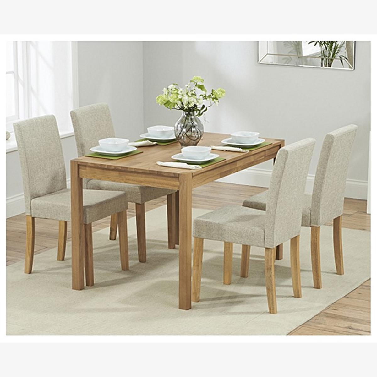 This oak dining table set strikes a great balance between rustic warmth and contemporary style, making it versatile for a range of interiors. I love its solid wood construction, which provides durability and a natural, inviting look that works especially well in modern country, Scandi, or minimalist schemes. The cream fabric chairs add softness and lightness, offering a comfortable seating option that can easily be dressed up with accessories like colourful placemats or understated centrepieces. Practical styling tips include keeping the tabletop uncluttered to highlight the natural wood grain, and pairing with muted or tonal decor for a cohesive look. Because it’s an ex-display, it offers excellent value, plus it’s a sturdy, stylish choice whether you’re looking to create a cosy family dining area or a sleek space for entertaining.
